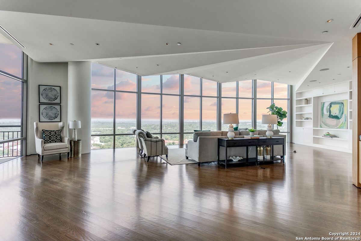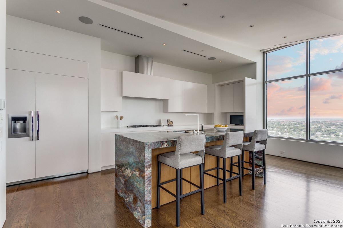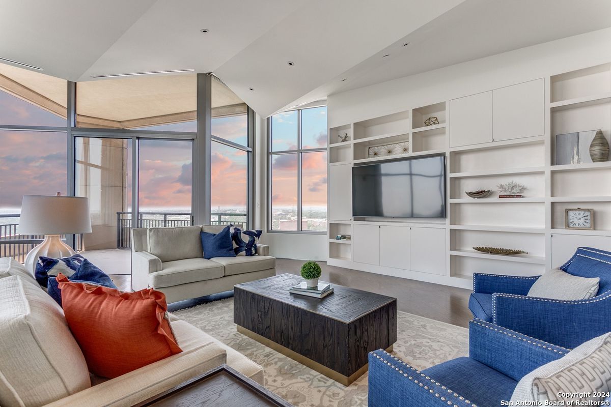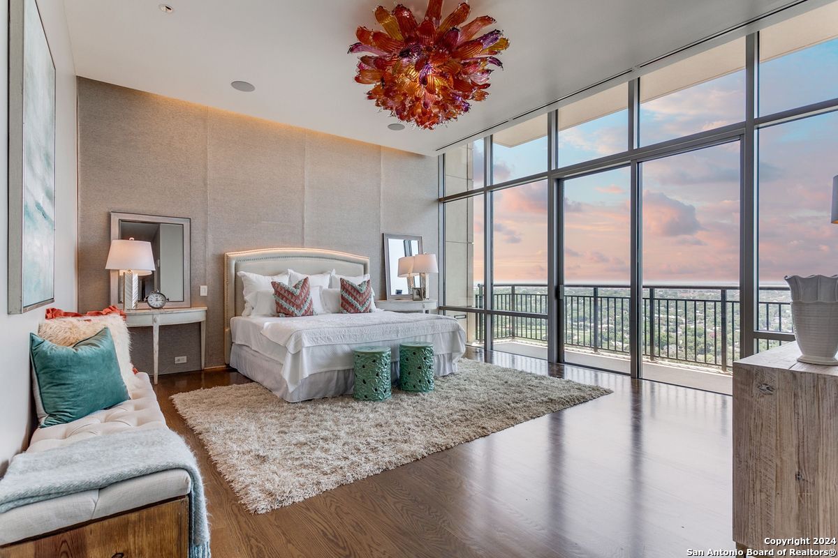 Nestled on the 20th floor of The Broadway San Antonio, this impeccable unit offers a panoramic view stretching from the city skyline to the hill country. With a private elevator entrance, you can step inside and discover an expansive and inviting entertaining area, seamlessly merging with two private balconies to enhance the sense of space and connection to the stunning surroundings. Custom designer kitchen with top-of-the-line features, Blue Louise stone countertops and waterfall island, alongside deluxe Miele appliances such as dual dishwashers, an ice maker, gas range, convection microwave, and espresso maker. Flexibility abounds for tailoring living, dining, and entertaining spaces to suit personal preferences. Revel in the convenience of a wet bar with hidden storage and player piano hook-ups, perfect for hosting unforgettable gatherings. The primary suite is a sanctuary of luxury, featuring a study, two additional private balconies, and an elevated en suite bath complete with a multi-head shower, dual sinks, and a garden airtub. An expansive primary closet includes additional washer/dryer hook-ups for added convenience. Across the unit, two secondary bedrooms each with en suite bathrooms, accompanied by a shared open office space and secret storage room, catering to every need. Experience the convenience and luxury living at The Broadway with 24-hr concierge and valet service plus a staff of 20 to take care of your every need.