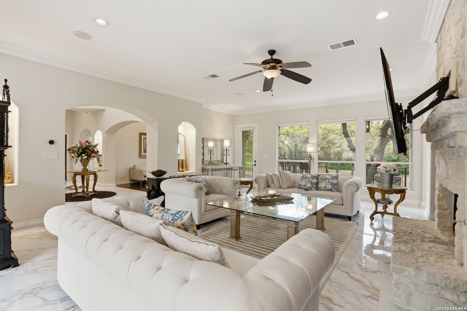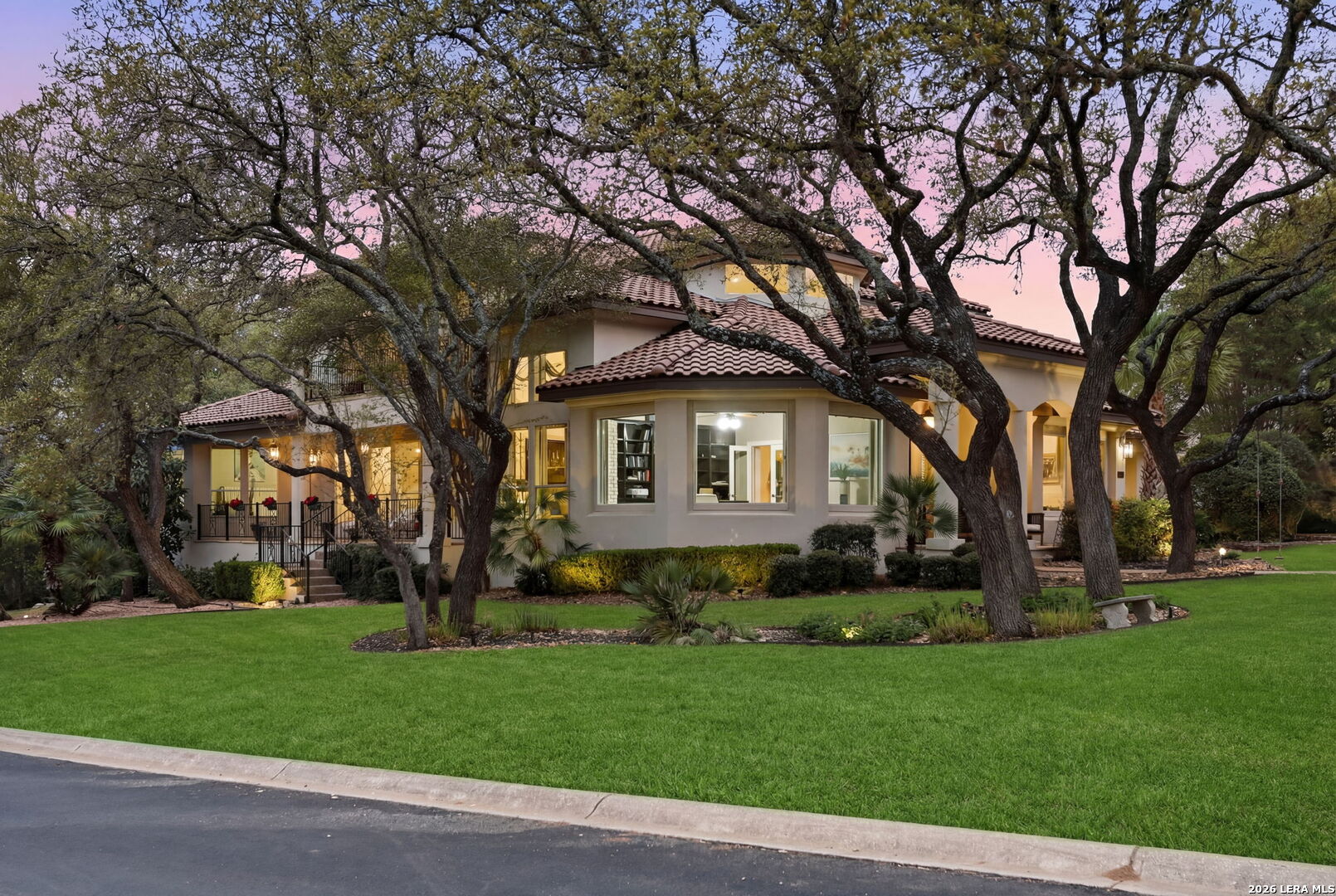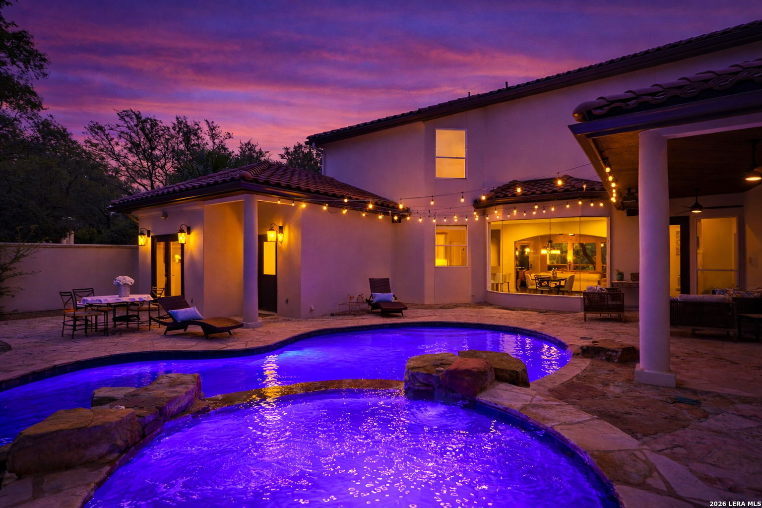 Welcome home to 1 Belcourt Place inside the Dominion! Enjoy over half an acre of mature trees and lush green space inside the highly sought after neighborhood. Host your friends at your pool equipped with the Outdoor projector and sound system entertainment package everyone will be talking about. Send your kiddos off to school with the bus route stopping right at your house. Walk out your front door and enjoy the holiday festivities on the greenbelt directly in front of your home. You even have your very own Golf Cart Garage! Seller has invested significantly in high-quality renovations throughout, including a fully updated chef's kitchen with quartz countertops, backsplash, farmhouse sink, premium faucet, new appliances, and induction cooktop with Sub-Zero refrigerator. Flooring and finishes have been upgraded across the home, creating a modern, move-in-ready luxury feel Home offers 4 bedrooms, 5 baths, Office, Three spacious living areas on the main level plus an additional upstairs living area, and a large formal dining room with direct access to the pool-perfect for large gatherings. The backyard is a private retreat with a stunning heated pool, spa, covered patio, and three palm trees-perfect for entertaining, Two balconies overlook a park, with walking access to scenic Dominion lakes and trails. Located in a highly desirable school zone. The spacious ground floor primary suite features a glamorous bathroom with dual vanities, dual closets, and a walk-through shower and soaking tub. Gorgeous hard wood flooring throughout the Master bedroom. The primary suite features a stunning wall of windows overlooking the serene park and mature trees, filling the space with natural light. Enjoy direct access to a spacious private balcony-perfect for morning coffee or unwinding in the evening surrounded by sunshine and the peaceful sounds of nature. The windows are enhanced with upgraded motorized shades, easily controlled at the touch of a button for added comfort and convenience. The breakfast area is highlighted by a dramatic wall of windows overlooking the private pool and palm trees, bringing in abundant natural light and a true indoor-outdoor living experience. This home is a rare find, ideally located directly across from a serene park, offering exceptional privacy with no homes immediately in front. The spacious main level features multiple living areas, creating an open and comfortable layout that feels both expansive and highly functional. A full bathroom with direct access from the pool area adds everyday convenience. The spacious main level features multiple living areas, creating an open and comfortable layout that feels both expansive and highly functional. This home is truly one of a kind!