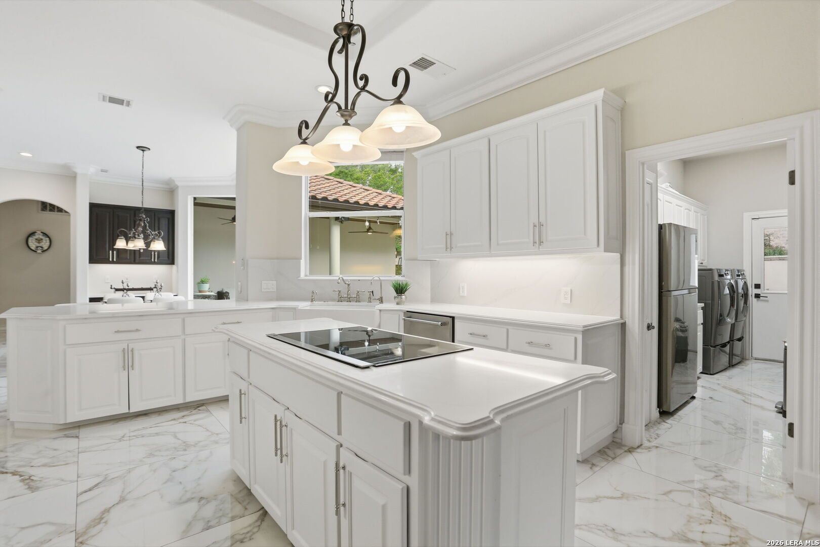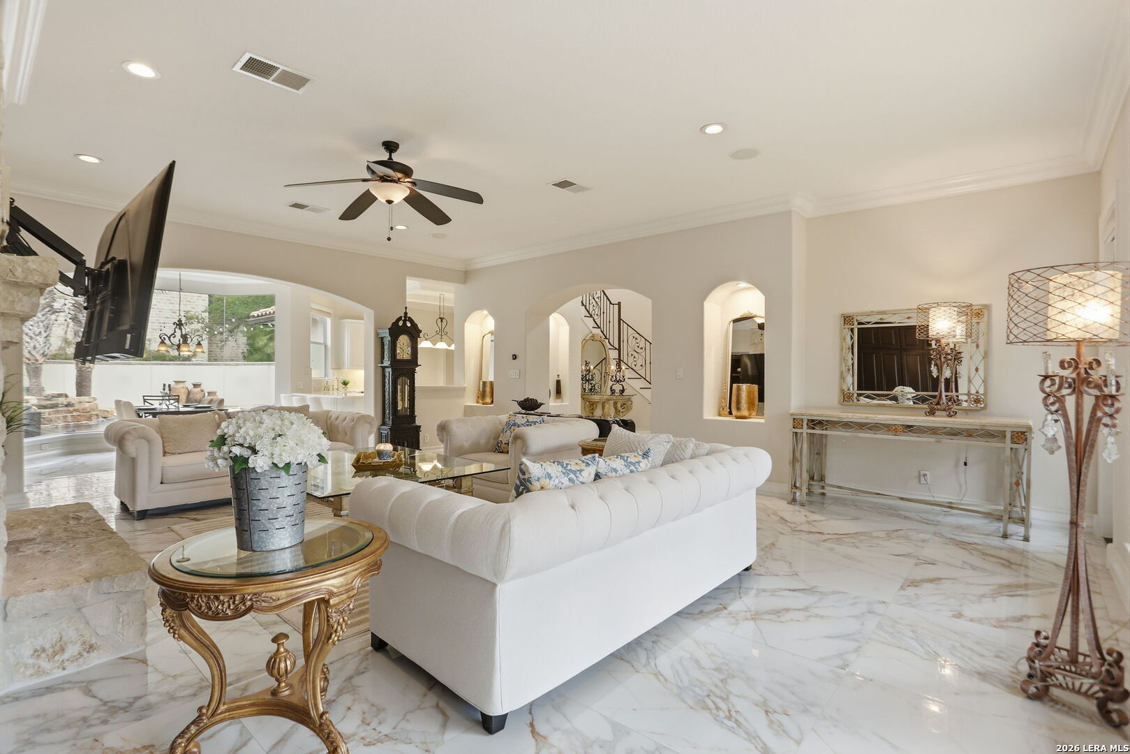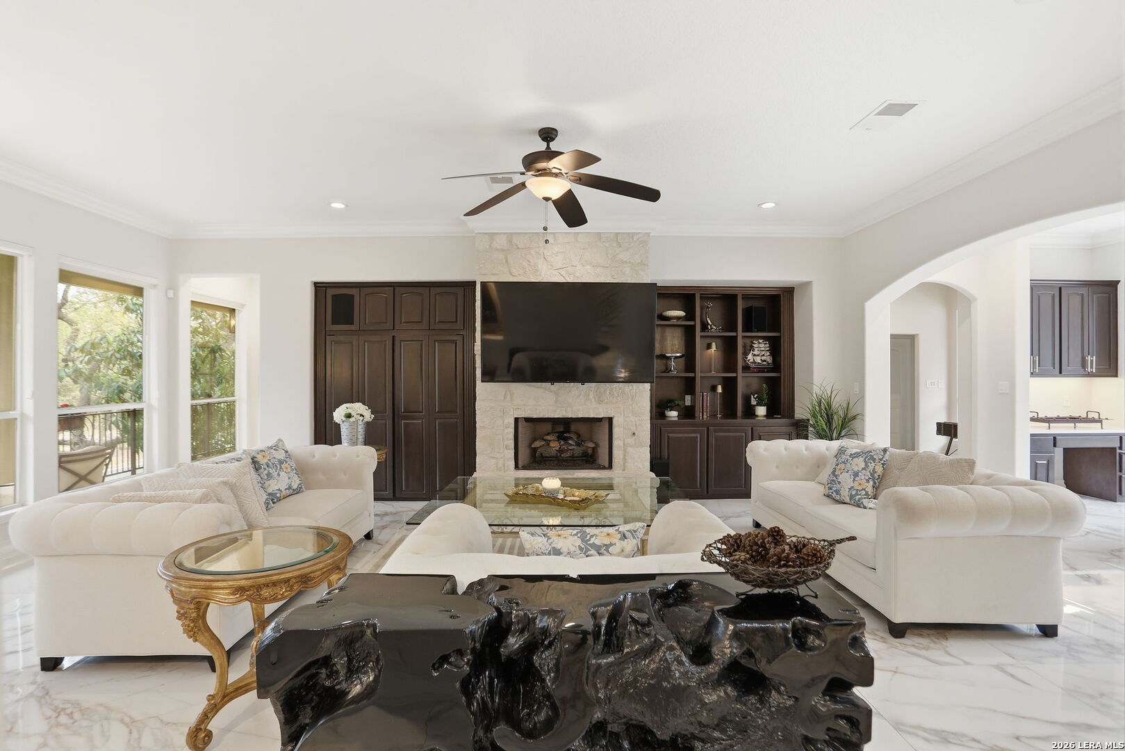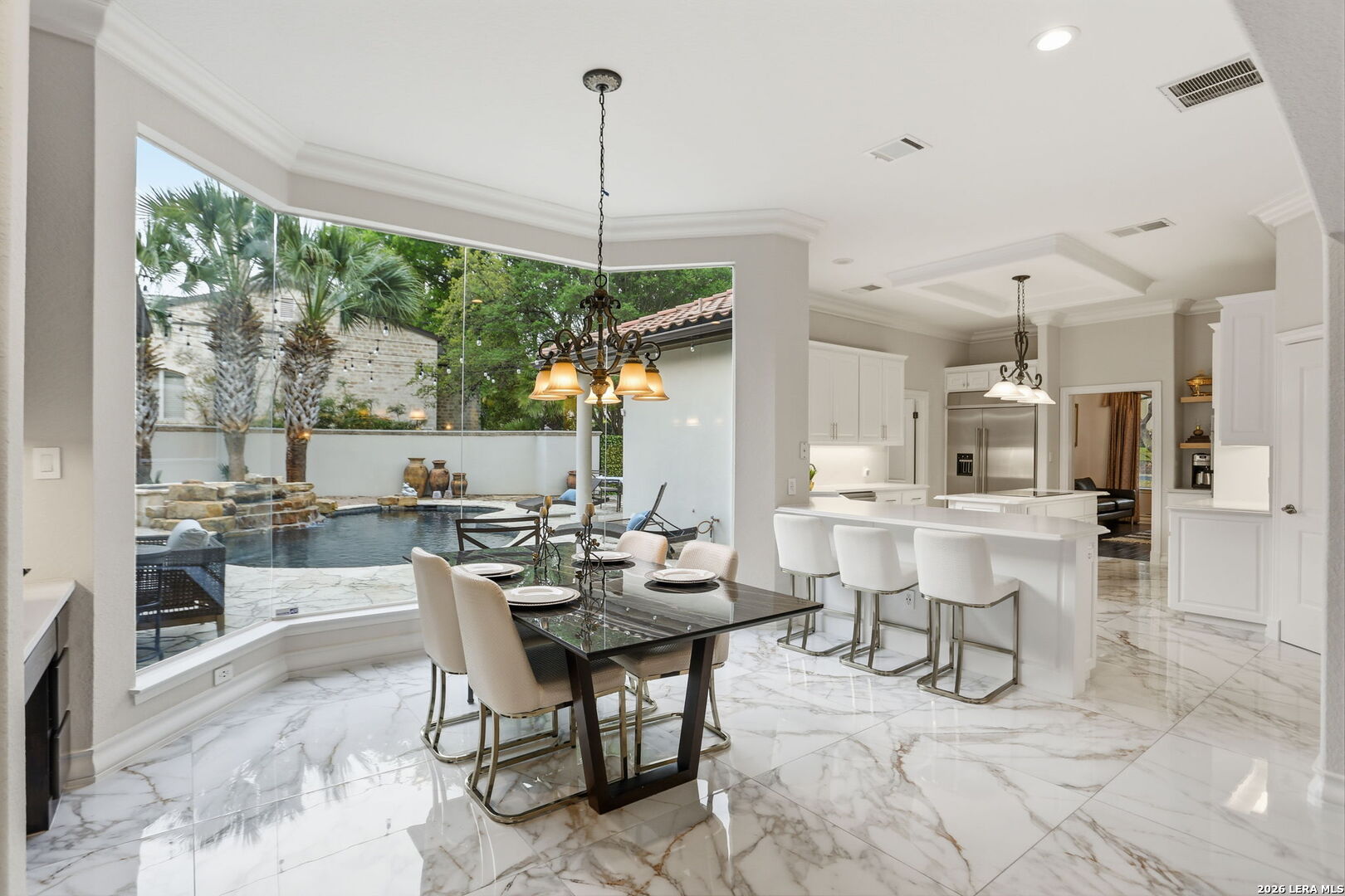 Welcome home to 1 Belcourt Place inside the Dominion! Enjoy over half an acre of mature trees and lush green space inside the highly sought after neighborhood. Host your friends at your pool equipped with the Outdoor projector and sound system entertainment package everyone will be talking about. Send your kiddos off to school with the bus route stopping right at your house. Walk out your front door and enjoy the holiday festivities on the greenbelt directly in front of your home. You even have your very own Golf Cart Garage! Seller has invested significantly in high-quality renovations throughout, including a fully updated chef's kitchen with quartz countertops, backsplash, farmhouse sink, premium faucet, new appliances, and induction cooktop with Sub-Zero refrigerator. Flooring and finishes have been upgraded across the home, creating a modern, move-in-ready luxury feel Home offers 4 bedrooms, 5 baths, Office, Three spacious living areas on the main level plus an additional upstairs living area, and a large formal dining room with direct access to the pool-perfect for large gatherings. The backyard is a private retreat with a stunning heated pool, spa, covered patio, and three palm trees-perfect for entertaining, Two balconies overlook a park, with walking access to scenic Dominion lakes and trails. Located in a highly desirable school zone. The spacious ground floor primary suite features a glamorous bathroom with dual vanities, dual closets, and a walk-through shower and soaking tub. Gorgeous hard wood flooring throughout the Master bedroom. The primary suite features a stunning wall of windows overlooking the serene park and mature trees, filling the space with natural light. Enjoy direct access to a spacious private balcony-perfect for morning coffee or unwinding in the evening surrounded by sunshine and the peaceful sounds of nature. The windows are enhanced with upgraded motorized shades, easily controlled at the touch of a button for added comfort and convenience. The breakfast area is highlighted by a dramatic wall of windows overlooking the private pool and palm trees, bringing in abundant natural light and a true indoor-outdoor living experience. This home is a rare find, ideally located directly across from a serene park, offering exceptional privacy with no homes immediately in front. The spacious main level features multiple living areas, creating an open and comfortable layout that feels both expansive and highly functional. A full bathroom with direct access from the pool area adds everyday convenience. The spacious main level features multiple living areas, creating an open and comfortable layout that feels both expansive and highly functional. This home is truly one of a kind!