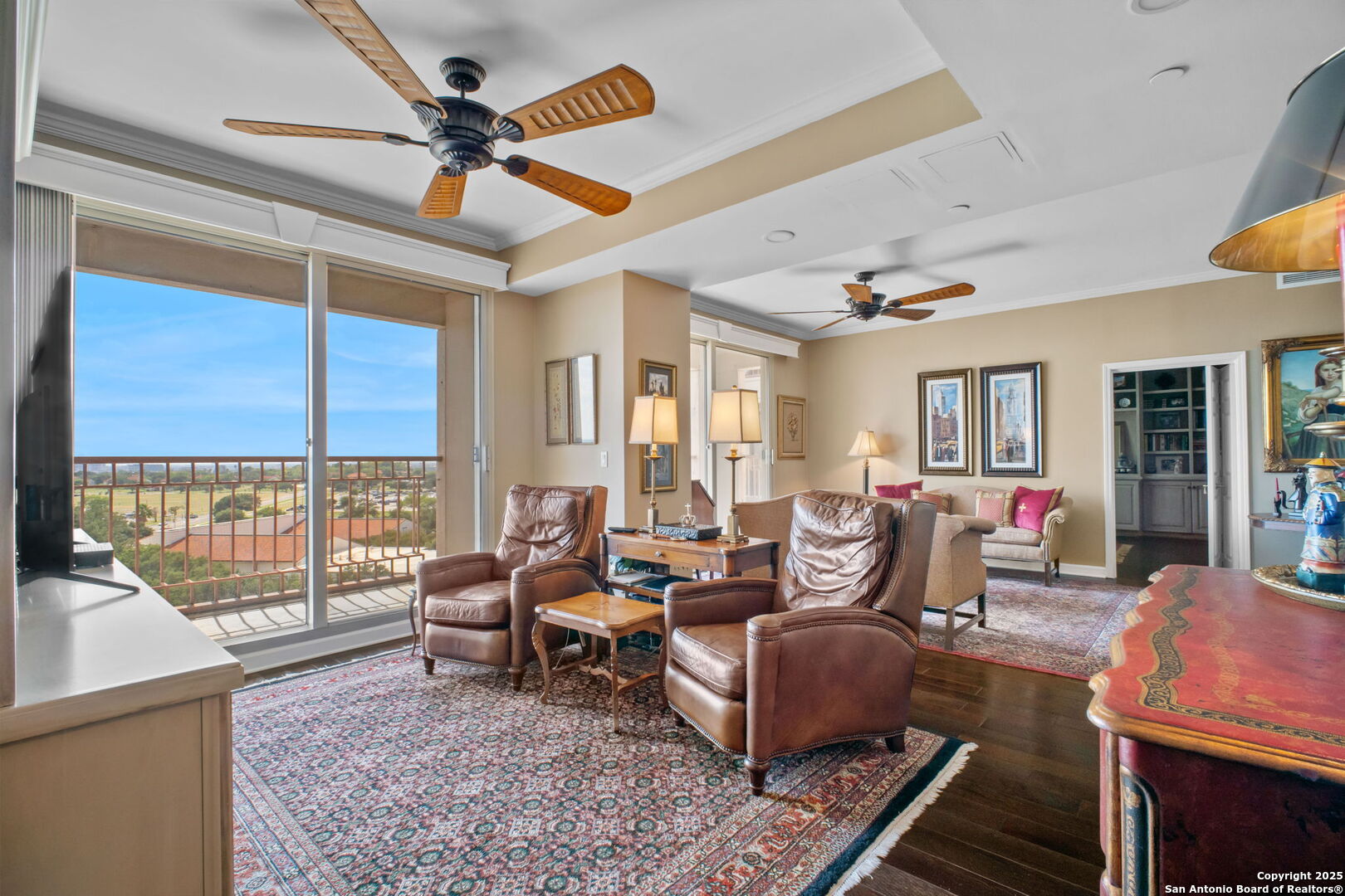 Enjoy elegance above the skyline at this Towers at Park Lane sophisticated high-rise residence nestled near Alamo Heights, in the heart of San Antonio. This exquisitely updated home offers not just a place to live, but a lifestyle defined by refinement, comfort, and breathtaking views. The Residence: * Gourmet Kitchen with marble counters, custom cabinetry, and striking dark stainless appliances. * Refined Interiors featuring rich hardwood floors, designer tile, and custom paint tones that set the perfect mood. * Expansive Living Spaces adorned with built-ins in both the living room and study, perfectly framing the sweeping downtown skyline. * Luxurious Baths with glass showers, modern fixtures, and a primary suite retreat offering double vanity, separate water closet, and spa-inspired finishes. * Smart Storage Solutions including a generous utility closet with washer/dryer, and a dining room pantry with pull-out shelving. Wake each morning - and fall asleep each night - to the iconic San Antonio skyline just beyond your windows. The Lifestyle: Life here extends far beyond the walls of your home. Residents enjoy a curated collection of amenities designed for leisure, wellness, and connection: * Valet & concierge services for effortless living * White-tablecloth dining and a welcoming bistro * Heated pool, spa, yoga, water aerobics, and personal fitness instruction * Community gardens, hobby workshops, and a private library featuring the latest bestsellers and periodicals * An oak-paneled lounge hosting vibrant cultural activities and bi-weekly socials * 24-hour monitored security ensuring peace of mind This residence offers more than luxury finishes - it delivers a complete lifestyle experience for 55+ residents, blending privacy, sophistication, and community in the heart of San Antonio. Elevate your everyday. Welcome home.