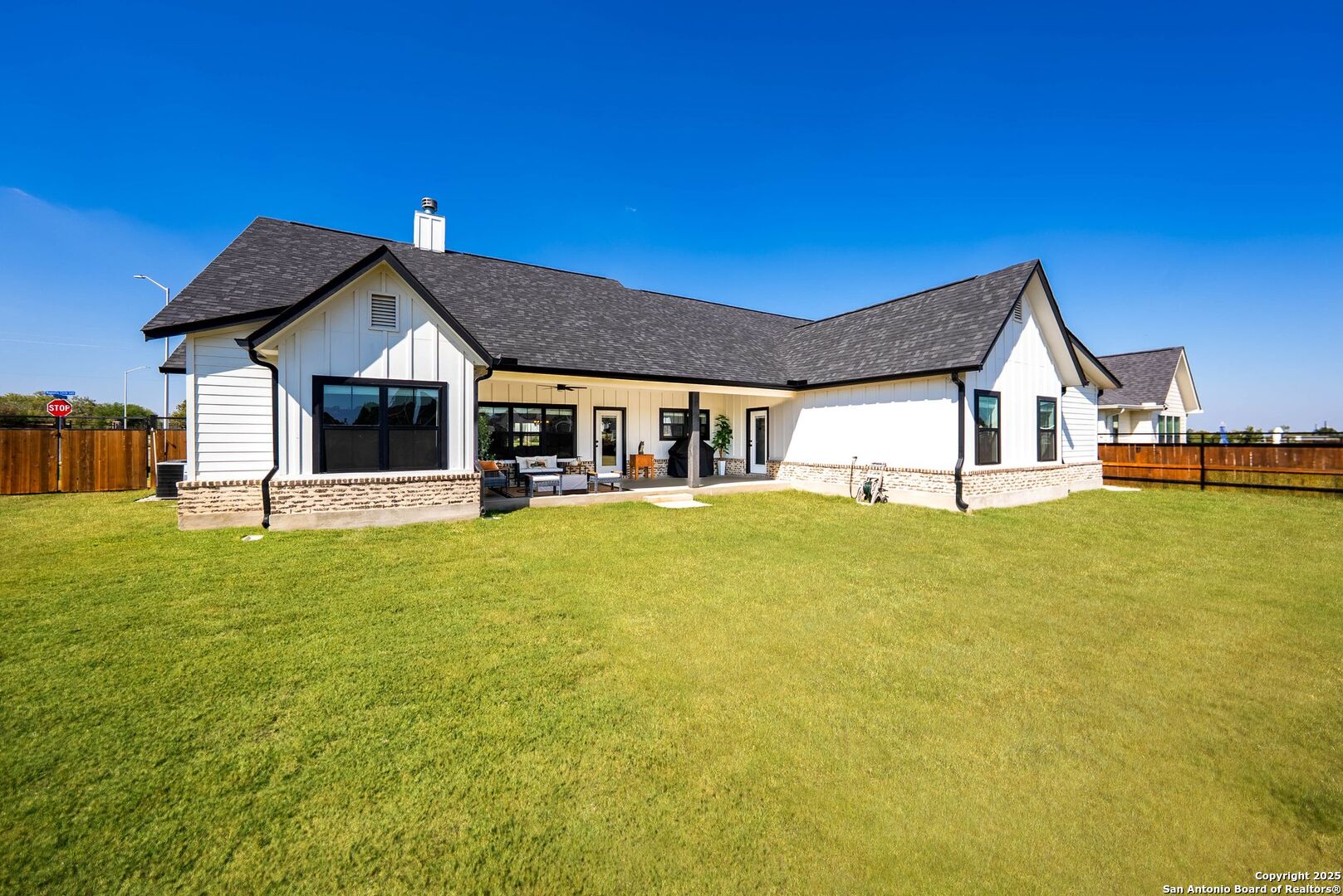 Welcome to your dream home in Woodbridge Farms, La Vernia, Texas! Built in 2023, this stunning one-story Craftsman-style home offers 3 spacious bedrooms, 2.5 baths, and sits on a generous .47-acre lot in a highly sought-after gated community. The open-concept floor plan features high ceilings, a rock fireplace, and abundant natural light that fills every room. The gorgeous island kitchen boasts upgraded granite countertops, soft-close cabinets, stainless steel appliances, and a walk-in pantry-perfect for entertaining and family gatherings. The primary suite includes an oversized walk-in closet and a luxurious bath with a garden tub, double vanity, and separate shower. Step outside to a covered patio and wide backyard backing up to a greenbelt, ideal for relaxation or play. Additional highlights include luxury vinyl plank flooring, an oversized two-car garage, and modern finishes throughout. Woodbridge Farms residents enjoy premium amenities such as a gated entry, multiple playgrounds, splash pad, basketball court, walking trails, and community pavilion-all within minutes of LVISD schools, shopping, and dining. This move-in-ready new build combines comfort, craftsmanship, and convenience for the perfect Texas lifestyle.