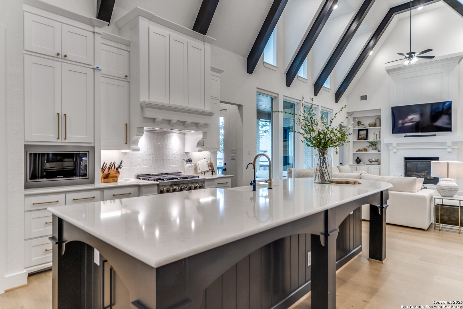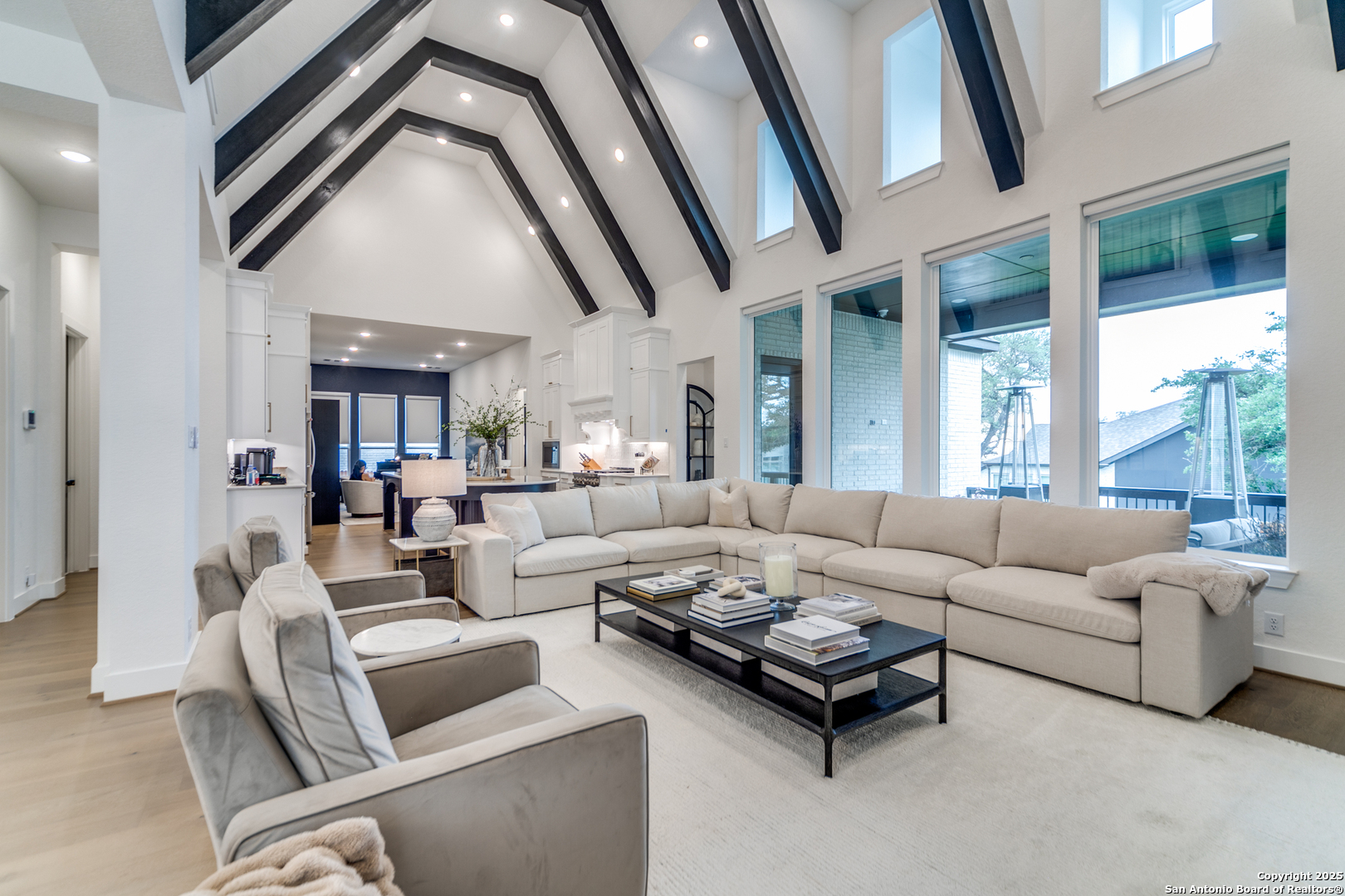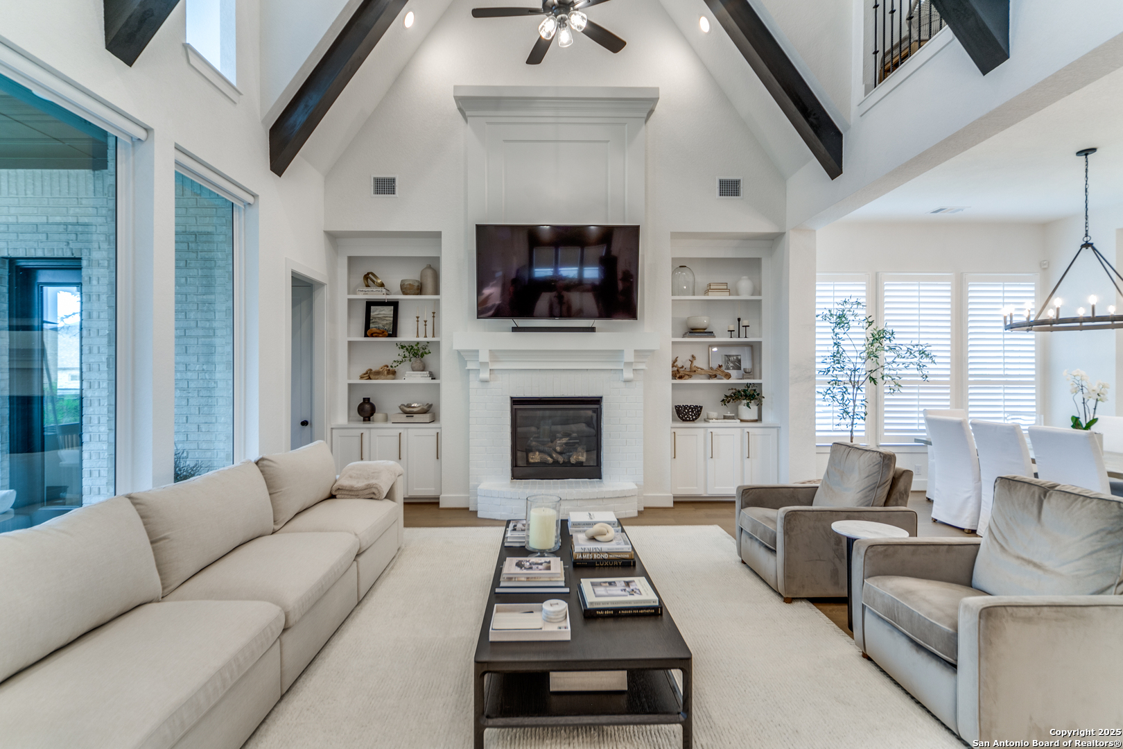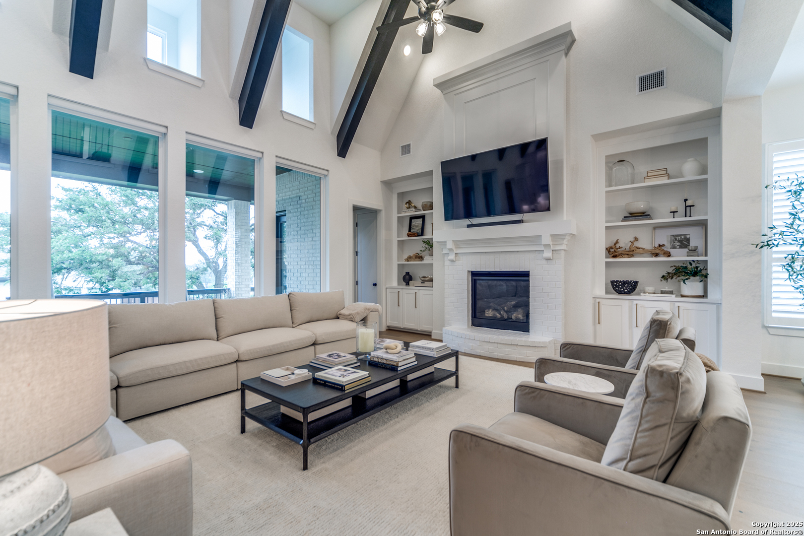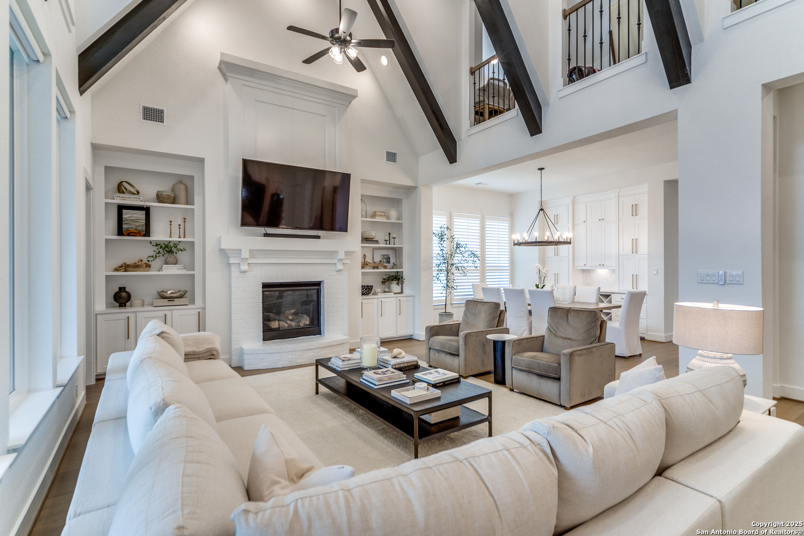 Step into refined living in this beautifully appointed 5-bedroom, 4 full bath, 2 half bath home by Highland Homes, nestled in the sought-after Balcones Creek community. Positioned on a spacious corner lot, this residence blends elegance, comfort, and thoughtful upgrades throughout. From the moment you enter, you're welcomed by soaring ceilings, abundant natural light, and an inviting open floor plan. To the right, a home office offers a quiet retreat for work or study, while a striking staircase draws the eye upward with architectural grace. The main living space features custom wooden ceiling beams and flows effortlessly into the formal dining room, enhanced with built-in shelving and upgraded light fixtures that carry throughout the home-inside and out. The adjacent living room boasts additional built-ins, a cozy gas fireplace, and electric blinds for added ease and comfort. At the heart of the home is the island kitchen, equipped with granite countertops, double ovens, gas cooking, a walk-in pantry, and updated hardware that gives the space a sleek, modern edge. Just off the kitchen, a separate breakfast area offers relaxed dining. Between the kitchen and living area is a media room, complete with upgraded wall sconces, setting the stage for unforgettable movie nights or game days. The primary suite is a serene retreat with generous space and style. The en-suite bathroom has been beautifully updated with new mirrors, modern lighting, dual vanities, a garden tub, and a walk-in shower. The custom walk-in closet features built-in shelving and tailored organization done by "Inspired Closets by Maxwells", to fit all your wardrobe needs. A second bedroom and full bath on the main level offer comfort and flexibility for guests or multi-generational living. Upstairs, a spacious game room awaits, complete with a full wet bar, sink, wine fridge, and microwave-perfect for entertaining. Three additional bedrooms, each with their own private bathrooms, ensure everyone has their own space. Outside, enjoy the large covered patio and expansive corner-lot backyard, offering privacy and room to play or garden. The 3-car garage includes added rafters for storage, providing both practicality and organization. This home is the perfect blend of luxury and functionality in one of the area's most desirable neighborhoods. Don't miss the opportunity to make this showstopper yours!