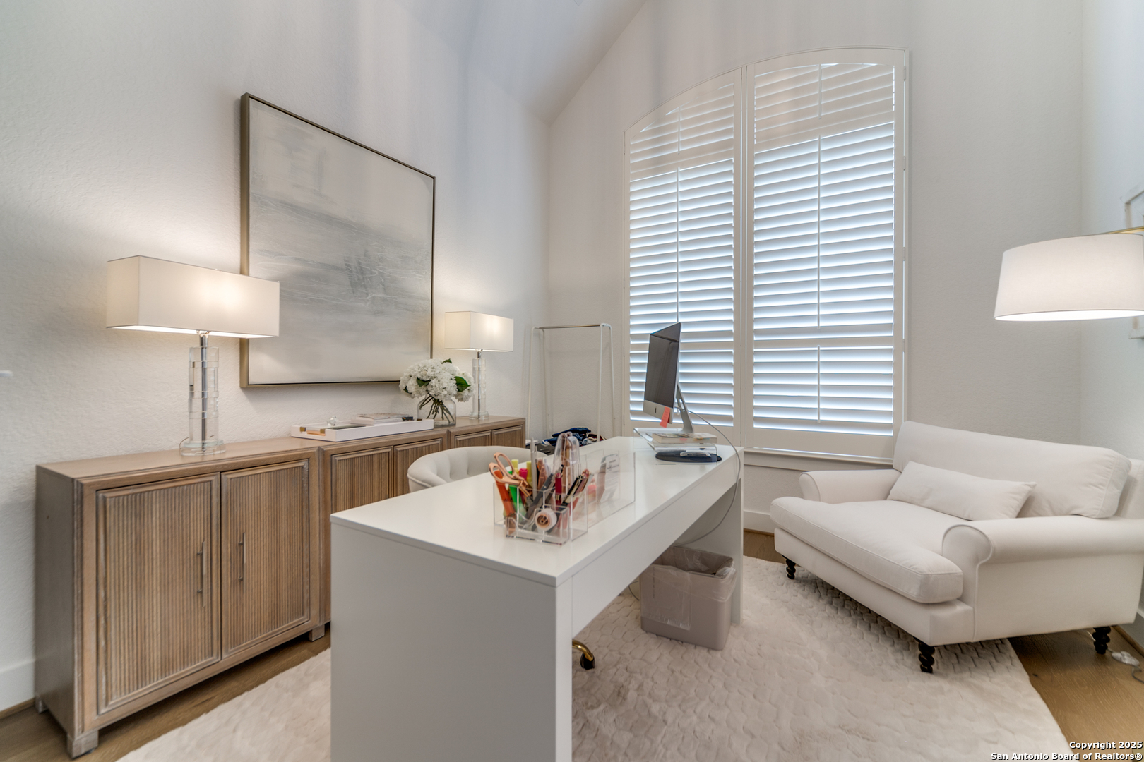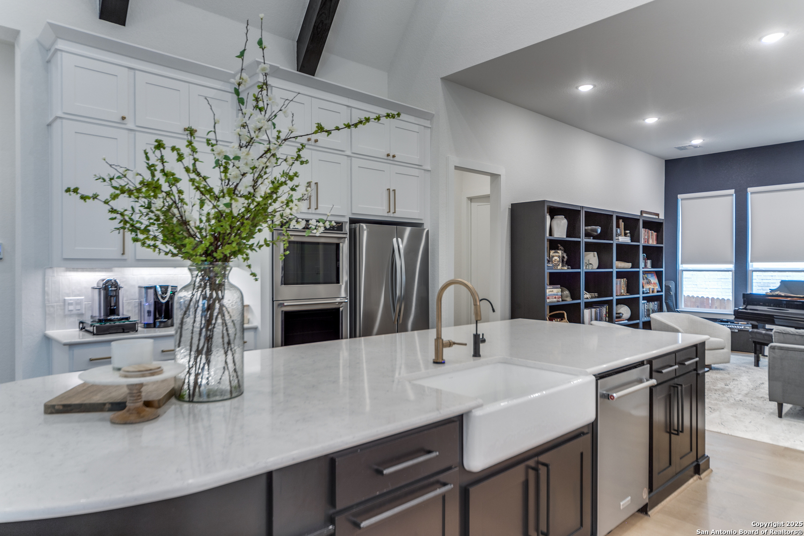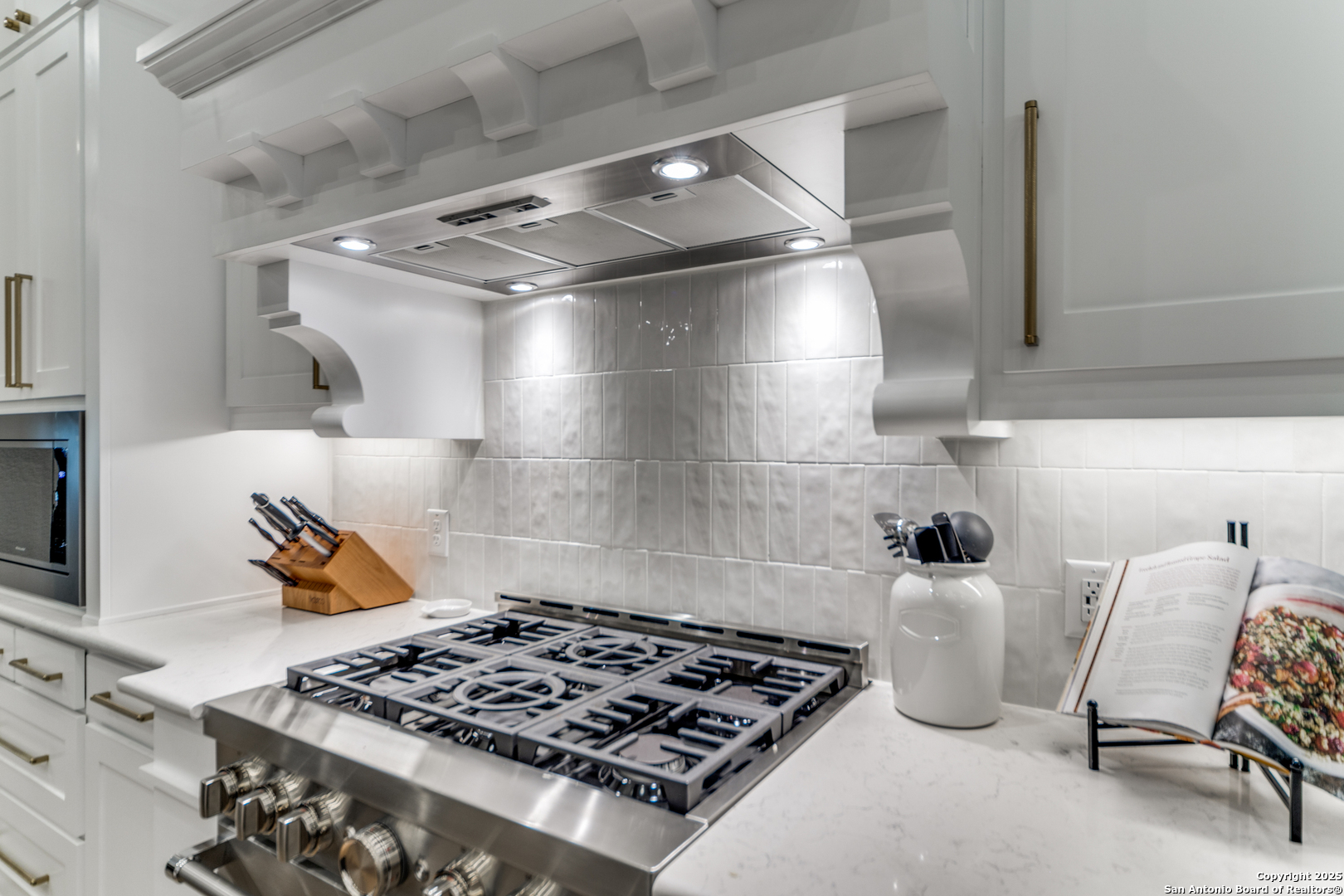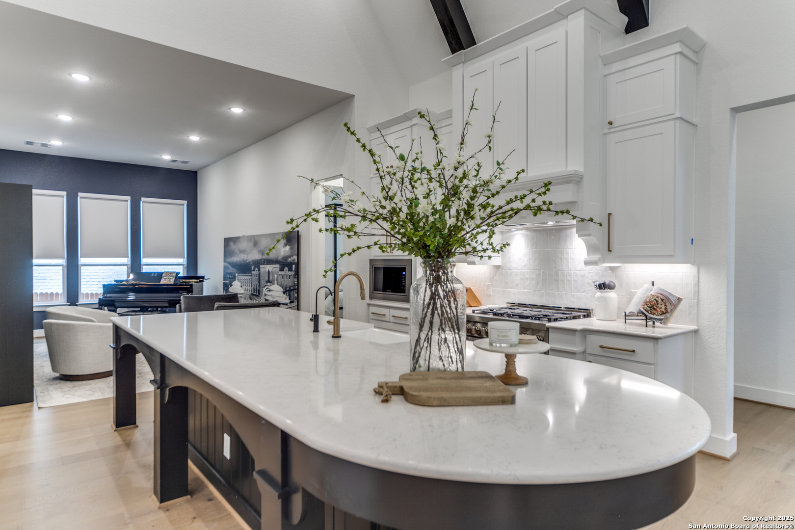 Step into refined living in this beautifully appointed 5-bedroom, 4 full bath, 2 half bath home by Highland Homes, nestled in the sought-after Balcones Creek community. Positioned on a spacious corner lot, this residence blends elegance, comfort, and thoughtful upgrades throughout. From the moment you enter, you're welcomed by soaring ceilings, abundant natural light, and an inviting open floor plan. To the right, a home office offers a quiet retreat for work or study, while a striking staircase draws the eye upward with architectural grace. The main living space features custom wooden ceiling beams and flows effortlessly into the formal dining room, enhanced with built-in shelving and upgraded light fixtures that carry throughout the home-inside and out. The adjacent living room boasts additional built-ins, a cozy gas fireplace, and electric blinds for added ease and comfort. At the heart of the home is the island kitchen, equipped with granite countertops, double ovens, gas cooking, a walk-in pantry, and updated hardware that gives the space a sleek, modern edge. Just off the kitchen, a separate breakfast area offers relaxed dining. Between the kitchen and living area is a media room, complete with upgraded wall sconces, setting the stage for unforgettable movie nights or game days. The primary suite is a serene retreat with generous space and style. The en-suite bathroom has been beautifully updated with new mirrors, modern lighting, dual vanities, a garden tub, and a walk-in shower. The custom walk-in closet features built-in shelving and tailored organization done by "Inspired Closets by Maxwells", to fit all your wardrobe needs. A second bedroom and full bath on the main level offer comfort and flexibility for guests or multi-generational living. Upstairs, a spacious game room awaits, complete with a full wet bar, sink, wine fridge, and microwave-perfect for entertaining. Three additional bedrooms, each with their own private bathrooms, ensure everyone has their own space. Outside, enjoy the large covered patio and expansive corner-lot backyard, offering privacy and room to play or garden. The 3-car garage includes added rafters for storage, providing both practicality and organization. This home is the perfect blend of luxury and functionality in one of the area's most desirable neighborhoods. Don't miss the opportunity to make this showstopper yours!