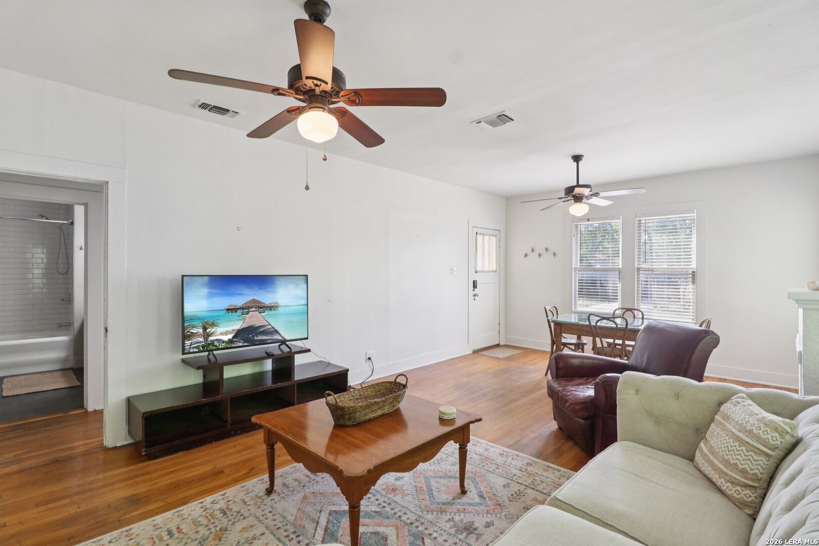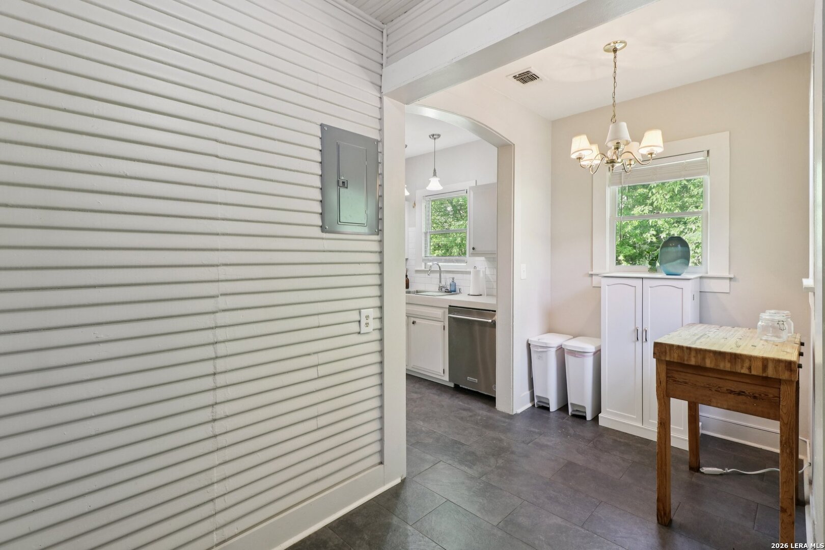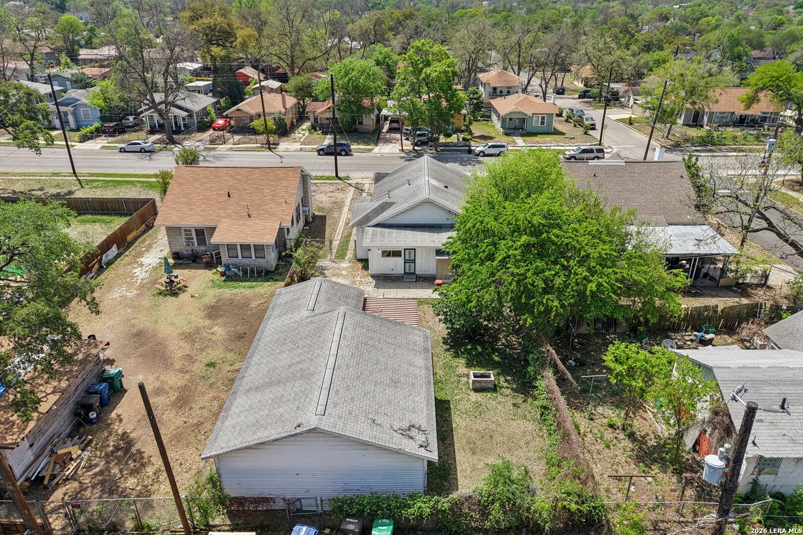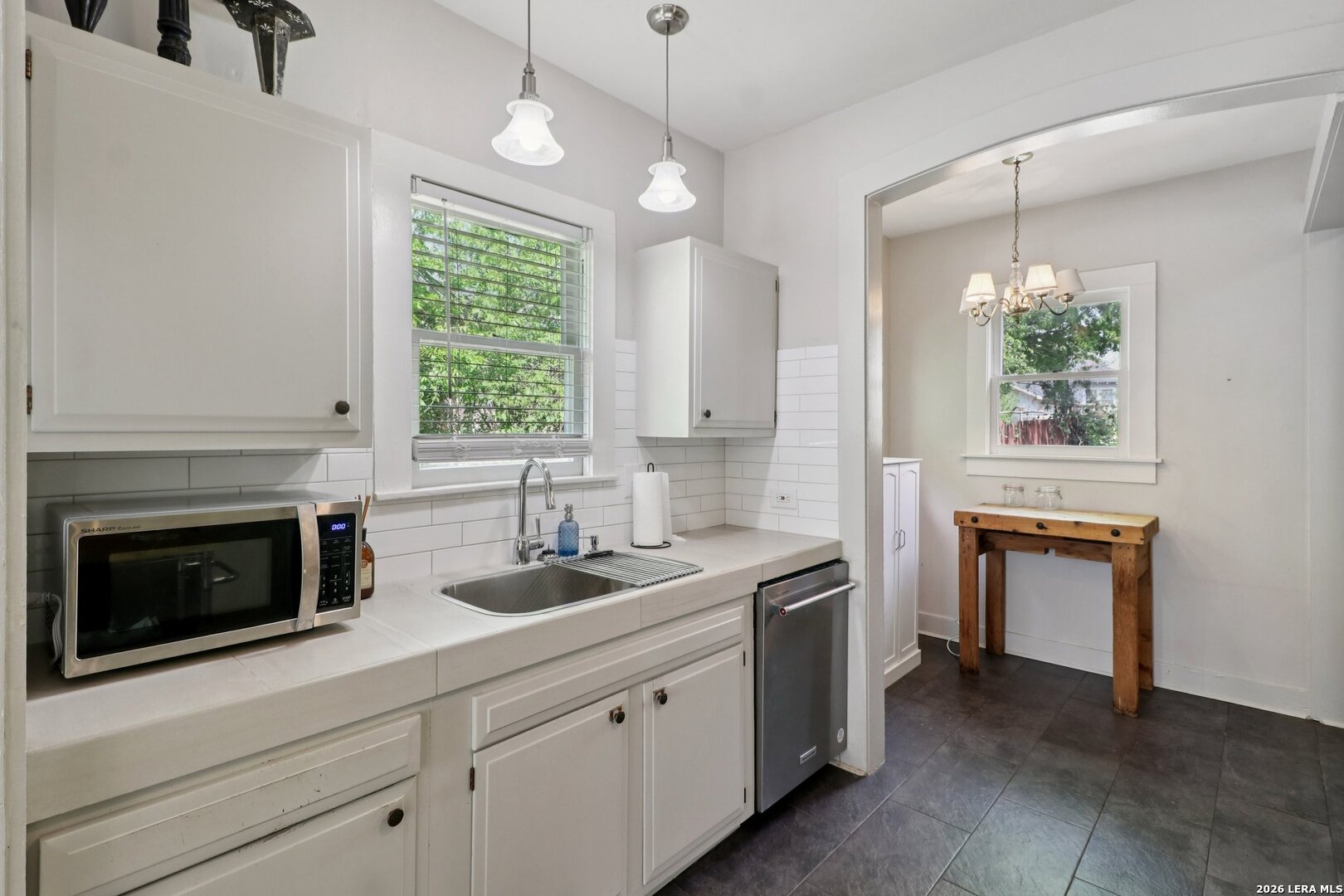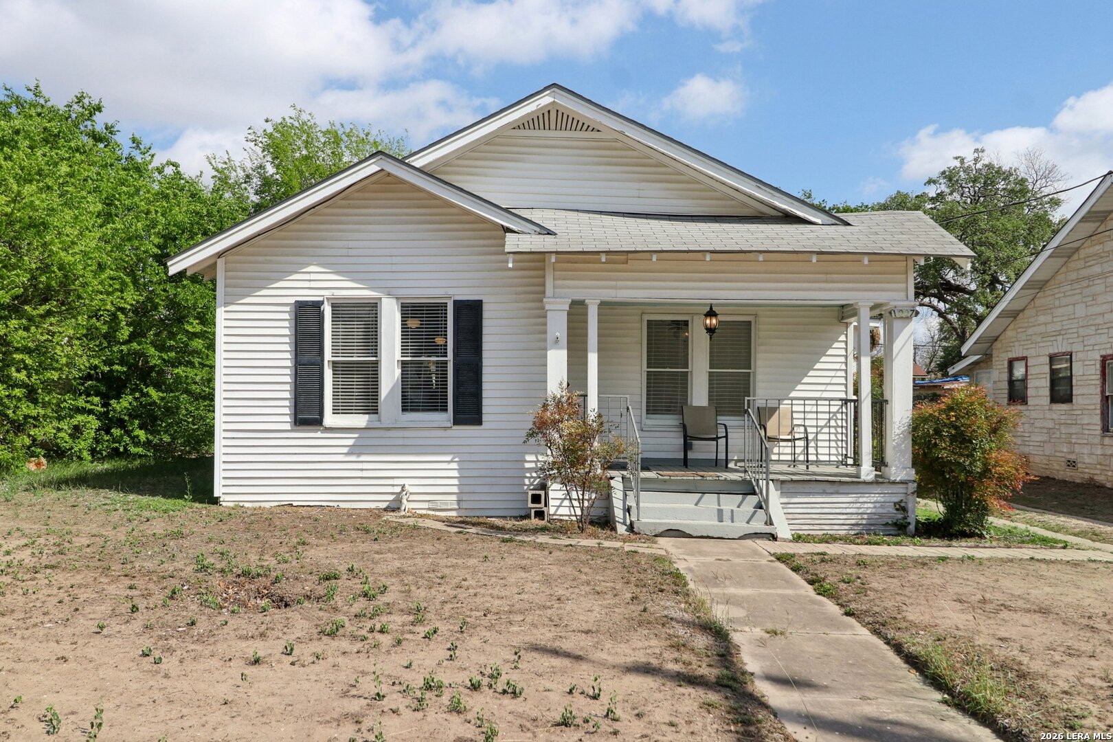 Quaint, single-story 2/2 cottage w/original wood floors, lots of windows, updated kitchen/baths and an oversized garage/workshop with lots of power. New HVAC in 2023. This cute home blends timeless character with modern updates. As you approach the home, you're welcomed by a lovely front porch/sitting area. When you enter you're greeted by the open living and dining space, wood floors and lots of windows bringing in natural light throughout. The kitchen features tile floors and a dishwasher! There is a central hall that leads to the private areas of the home. The main bathroom has been tastefully updated to include tile flooring. The primary bedroom is serene, large and includes an updated bathroom and dual closets. The secondary bedroom also has dual closets, wood flooring and great natural light. Off the kitchen, there's a utility room and a flex room with a laundry closet. There is a HUGE detached garage/workshop with extra storage and tons of power. The backyard is deep with a nice covered sitting area, lots of privacy and mature trees. The back alley is still used for garbage pickup. Home is located very close to a park with tennis and basketball courts. A few minutes from downtown and the Spurs arena. Easy access to highway, airport is 20 minutes away and there's lots of shopping nearby.