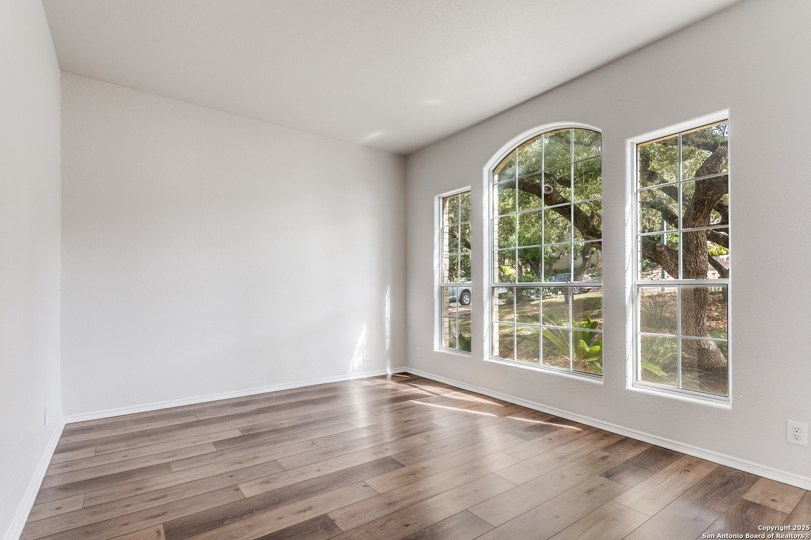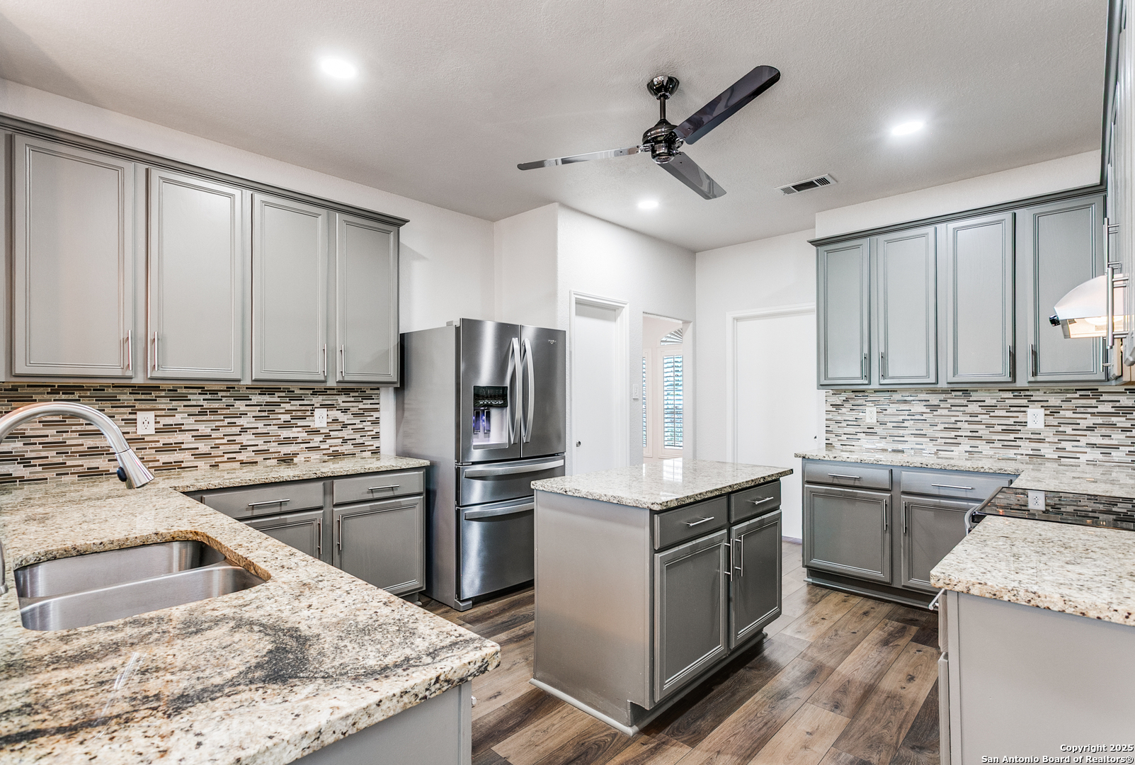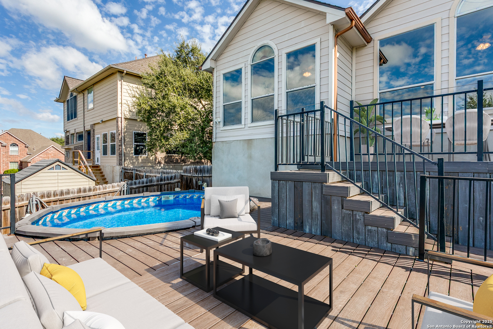 Centrally located updated home nestled in the sought-after The Oaks of Vista del Norte. This thoughtfully designed residence blends modern upgrades with versatile living spaces, offering comfort, style, and functionality. Upon entry, you're greeted by a tiled foyer that opens to a flexible office space and a formal dining room enhanced by elegant plantation shutters. The home features durable wood-based laminate flooring throughout-12mm tongue-and-groove with AquaGuard waterproof technology and a lifetime warranty-providing both aesthetic appeal and everyday practicality. Fresh interior paint (2025) adds a crisp, contemporary feel. The kitchen showcases granite countertops, a glass tile backsplash, a center island, and stylish 8-inch cabinet handles. A pull-down faucet complements the double oven range and smooth cooktop, while three pendant lights over the breakfast bar create a warm ambiance. A walk-in pantry, adjacent laundry room with extra storage, and a Whirlpool refrigerator complete the space. The primary suite offers a spacious retreat with high ceilings, a ceiling fan, and no carpet. The renovated en-suite bath features a sleek black double vanity, a frameless glass walk-in shower with bench, rain showerhead, and body jets. Additional amenities include a toilet closet, linen storage, and a generous walk-in closet. All bedrooms include walk-in closets, and the media/flex room offers its own walk-in closet for added storage. A guest half bath on the first floor adds convenience. Step outside to a private backyard oasis featuring a three-level composite deck with storage underneath, an above-ground pool, a basketball court, and mature trees that provide shade and tranquility. Additional highlights include a gas fireplace in the family room, a water softener system, new smoke detectors, recessed can lighting, and a Ring doorbell with multiple Ring security cameras. The Oaks of Vista del Norte is known for its peaceful setting, mature landscaping, and proximity to schools, parks, and playgrounds. Residents enjoy easy access to shopping, dining, and major highways, making commuting and daily errands convenient. The neighborhood fosters a welcoming atmosphere for all.