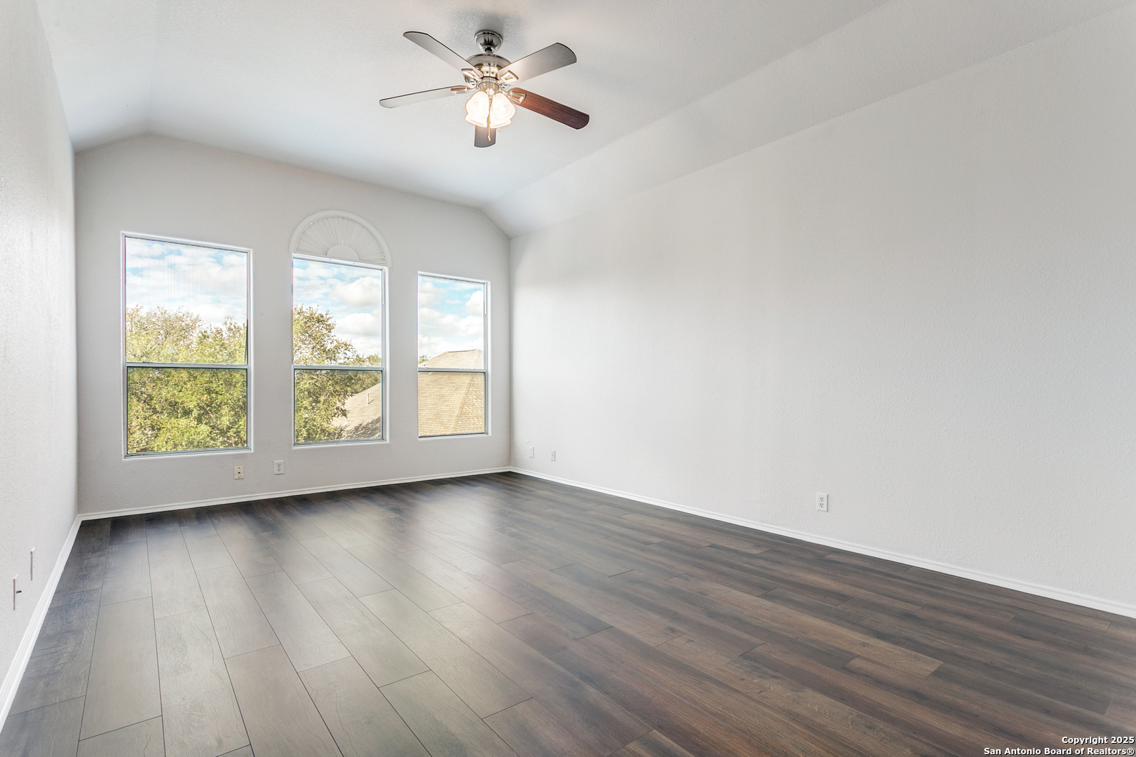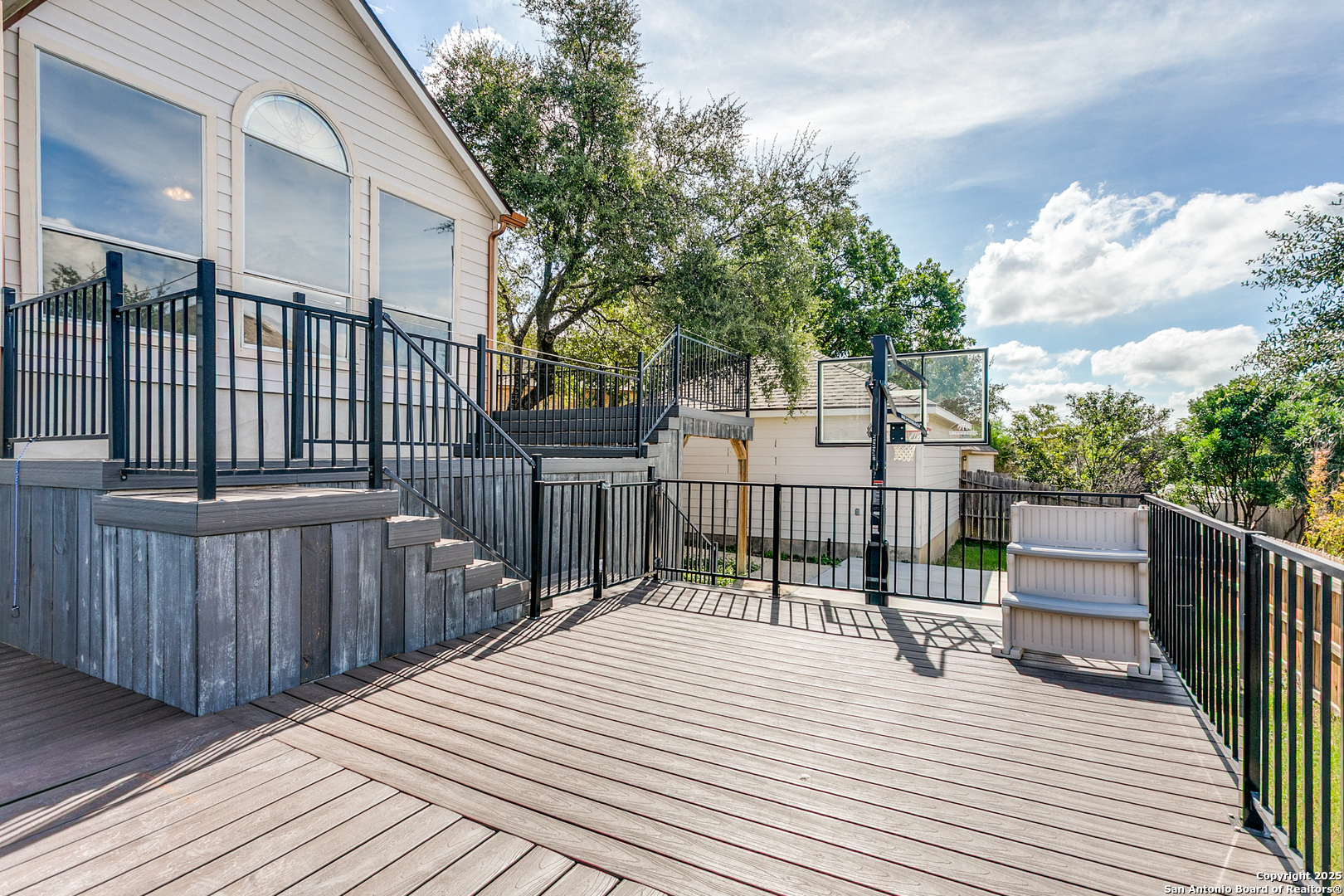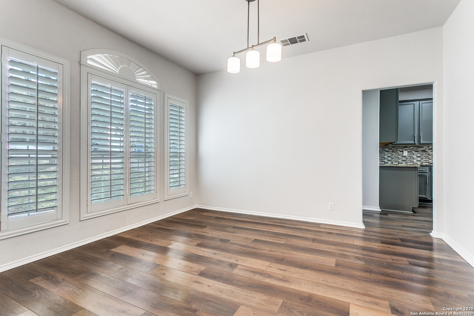 Centrally located updated home nestled in the sought-after The Oaks of Vista del Norte. This thoughtfully designed residence blends modern upgrades with versatile living spaces, offering comfort, style, and functionality. Upon entry, you're greeted by a tiled foyer that opens to a flexible office space and a formal dining room enhanced by elegant plantation shutters. The home features durable wood-based laminate flooring throughout-12mm tongue-and-groove with AquaGuard waterproof technology and a lifetime warranty-providing both aesthetic appeal and everyday practicality. Fresh interior paint (2025) adds a crisp, contemporary feel. The kitchen showcases granite countertops, a glass tile backsplash, a center island, and stylish 8-inch cabinet handles. A pull-down faucet complements the double oven range and smooth cooktop, while three pendant lights over the breakfast bar create a warm ambiance. A walk-in pantry, adjacent laundry room with extra storage, and a Whirlpool refrigerator complete the space. The primary suite offers a spacious retreat with high ceilings, a ceiling fan, and no carpet. The renovated en-suite bath features a sleek black double vanity, a frameless glass walk-in shower with bench, rain showerhead, and body jets. Additional amenities include a toilet closet, linen storage, and a generous walk-in closet. All bedrooms include walk-in closets, and the media/flex room offers its own walk-in closet for added storage. A guest half bath on the first floor adds convenience. Step outside to a private backyard oasis featuring a three-level composite deck with storage underneath, an above-ground pool, a basketball court, and mature trees that provide shade and tranquility. Additional highlights include a gas fireplace in the family room, a water softener system, new smoke detectors, recessed can lighting, and a Ring doorbell with multiple Ring security cameras. The Oaks of Vista del Norte is known for its peaceful setting, mature landscaping, and proximity to schools, parks, and playgrounds. Residents enjoy easy access to shopping, dining, and major highways, making commuting and daily errands convenient. The neighborhood fosters a welcoming atmosphere for all.