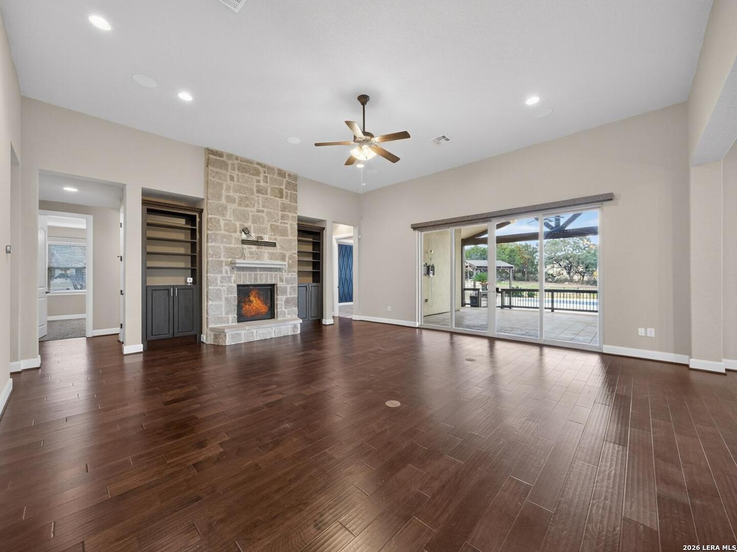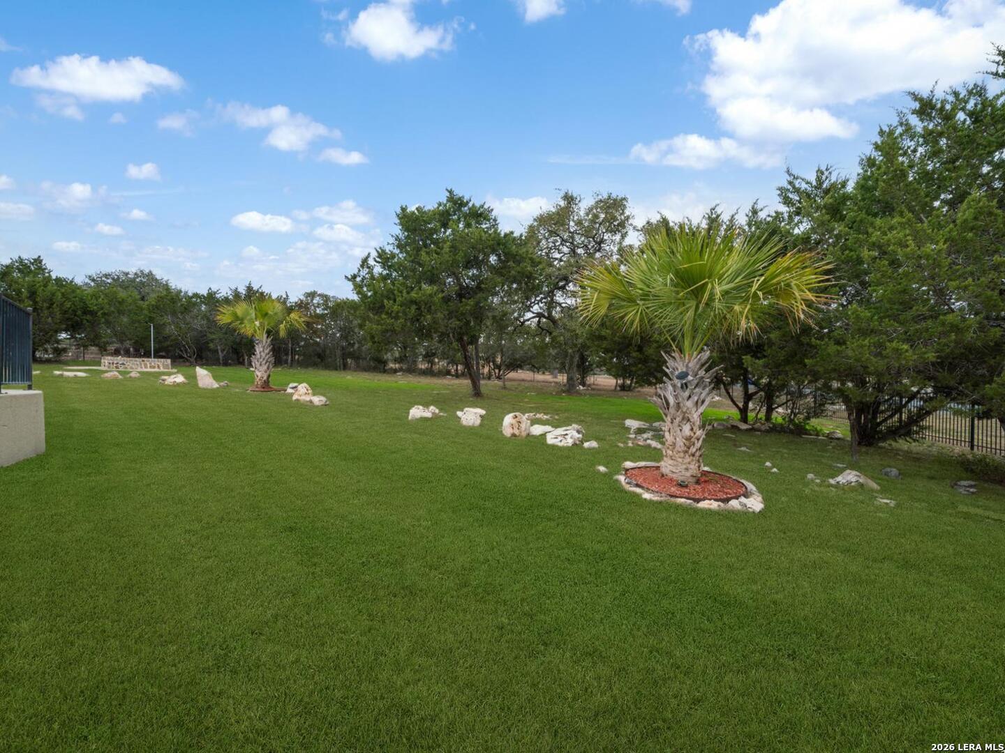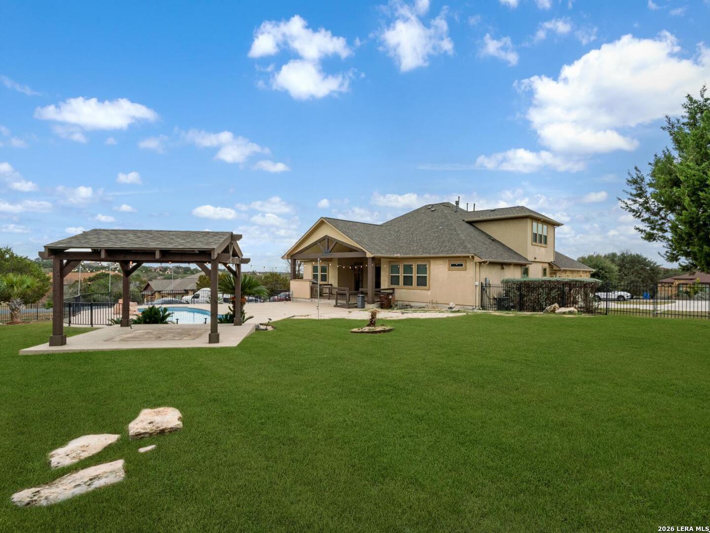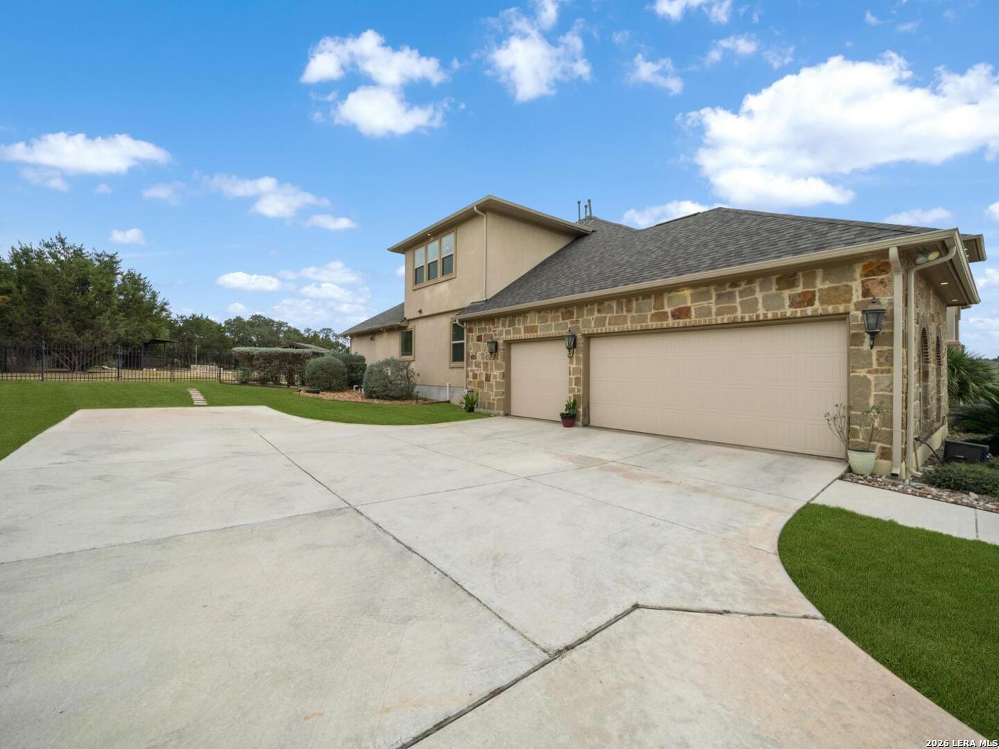 Welcome to your private 1.02 acre Texas retreat! This beautifully designed 4-bedroom, 3.5-bathroom custom home sits on a corner lot in a gated community, offering privacy, luxury, and space to entertain both inside and out, well-kept landscaping. Inside, the home features tall ceilings, crown molding, and beautiful floors throughout the main living areas. The open-concept layout includes a spacious living room with a stone fireplace and large windows overlooking the backyard. The gourmet kitchen is a dream for any chef, complete with granite countertops, dark cabinetry, stainless steel appliances, gas cooktop, and large island perfect for gatherings. Just off the kitchen, the sun-drenched breakfast area offers peaceful views of the backyard, while the formal dining room adds a touch of elegance for entertaining guests. The primary suite is a true escape, featuring a large bedroom with soft natural light and a spa-inspired bathroom with dual vanities, a soaking tub, a walk-in shower, and plenty of customized storage. Each of the additional bedrooms is generously sized, and the layout includes a private study, ideal for working from home. Step outside to enjoy your own backyard oasis. The large covered patio features a full outdoor kitchen perfect for entertaining year-round. Cool off in the sparkling in-ground pool or relax under the trees while enjoying the peaceful greenbelt view behind the home. This property blends upscale finishes, thoughtful design, and outdoor living in one incredible package. It's not just a home-it's a lifestyle!