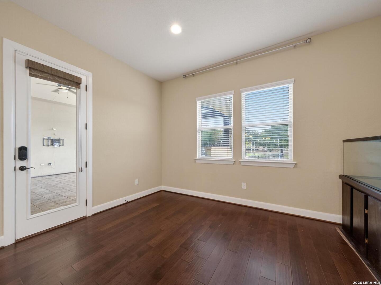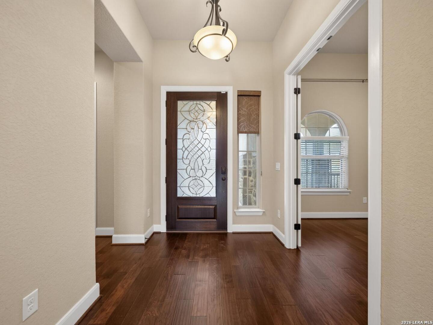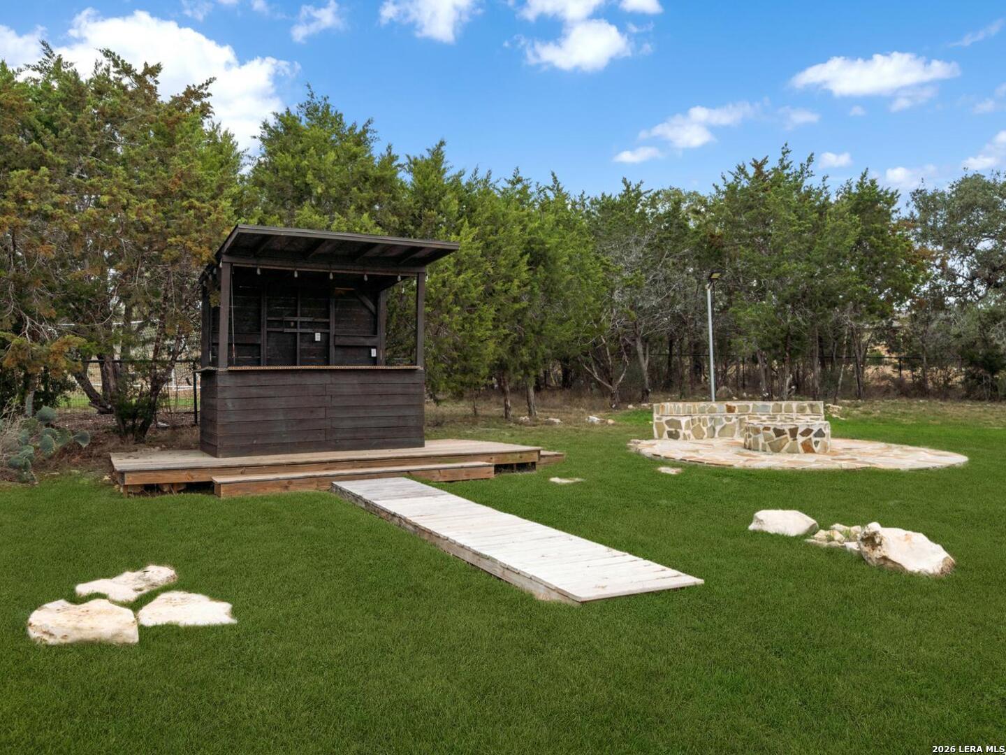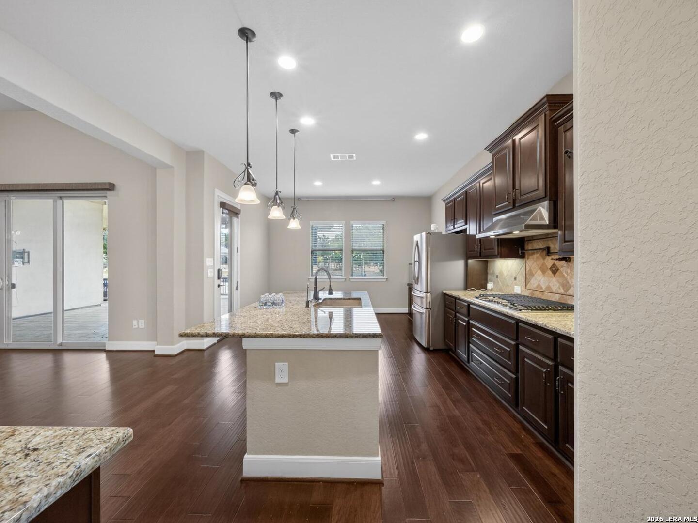 Welcome to your private 1.02 acre Texas retreat! This beautifully designed 4-bedroom, 3.5-bathroom custom home sits on a corner lot in a gated community, offering privacy, luxury, and space to entertain both inside and out, well-kept landscaping. Inside, the home features tall ceilings, crown molding, and beautiful floors throughout the main living areas. The open-concept layout includes a spacious living room with a stone fireplace and large windows overlooking the backyard. The gourmet kitchen is a dream for any chef, complete with granite countertops, dark cabinetry, stainless steel appliances, gas cooktop, and large island perfect for gatherings. Just off the kitchen, the sun-drenched breakfast area offers peaceful views of the backyard, while the formal dining room adds a touch of elegance for entertaining guests. The primary suite is a true escape, featuring a large bedroom with soft natural light and a spa-inspired bathroom with dual vanities, a soaking tub, a walk-in shower, and plenty of customized storage. Each of the additional bedrooms is generously sized, and the layout includes a private study, ideal for working from home. Step outside to enjoy your own backyard oasis. The large covered patio features a full outdoor kitchen perfect for entertaining year-round. Cool off in the sparkling in-ground pool or relax under the trees while enjoying the peaceful greenbelt view behind the home. This property blends upscale finishes, thoughtful design, and outdoor living in one incredible package. It's not just a home-it's a lifestyle!