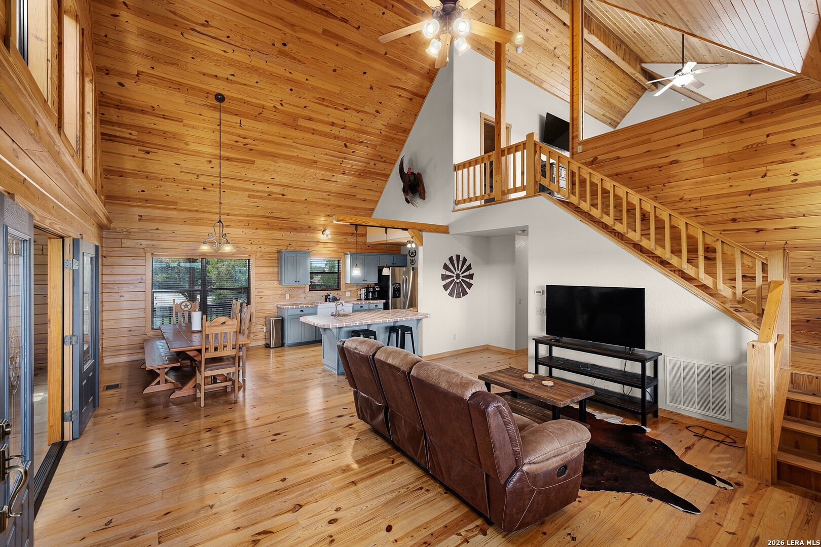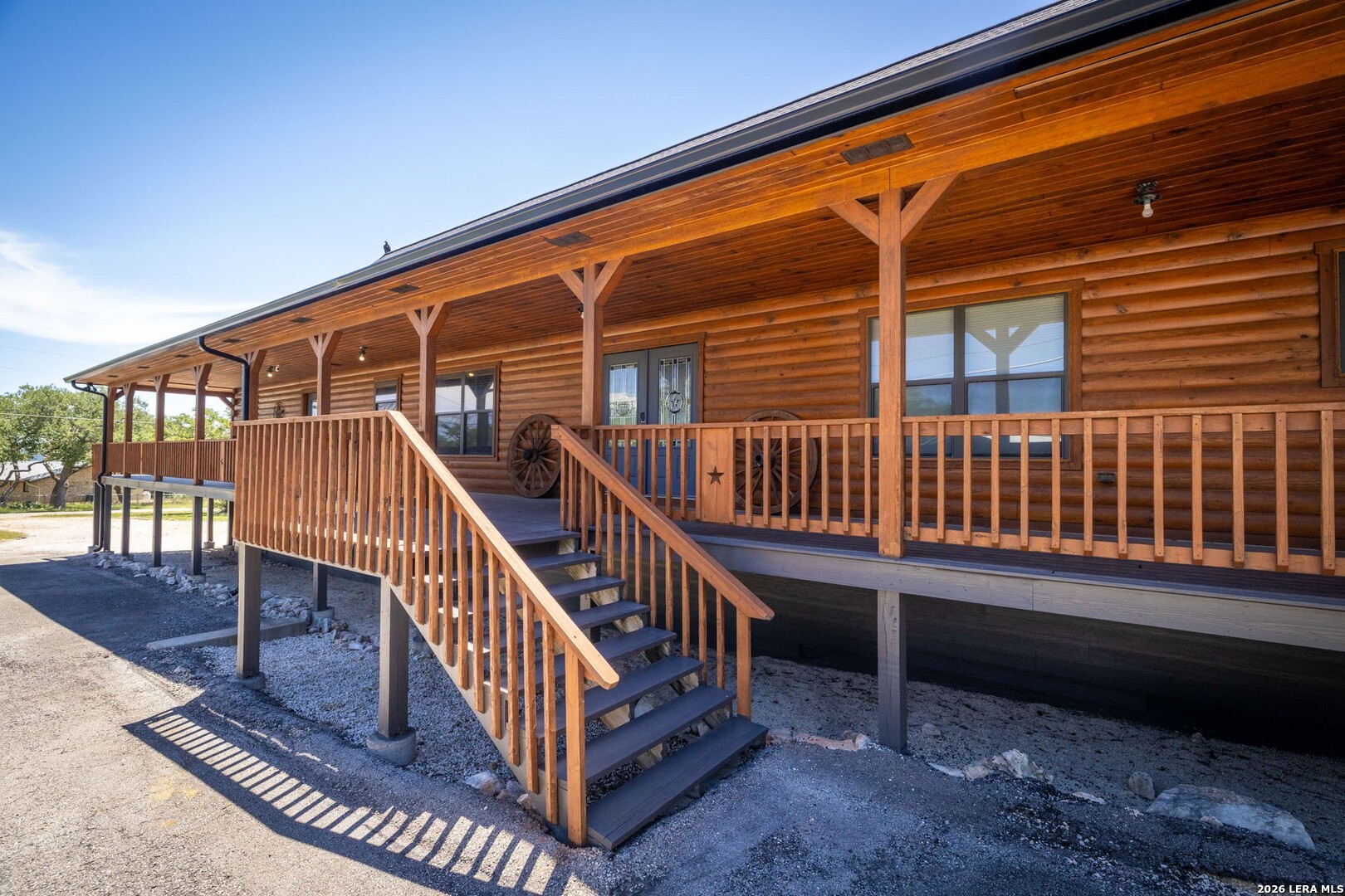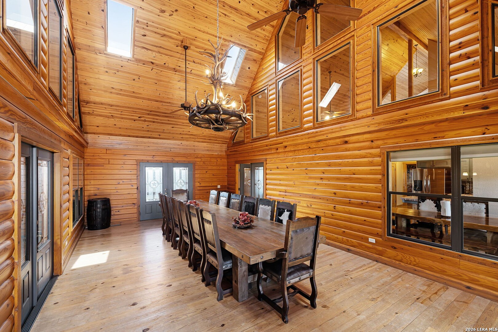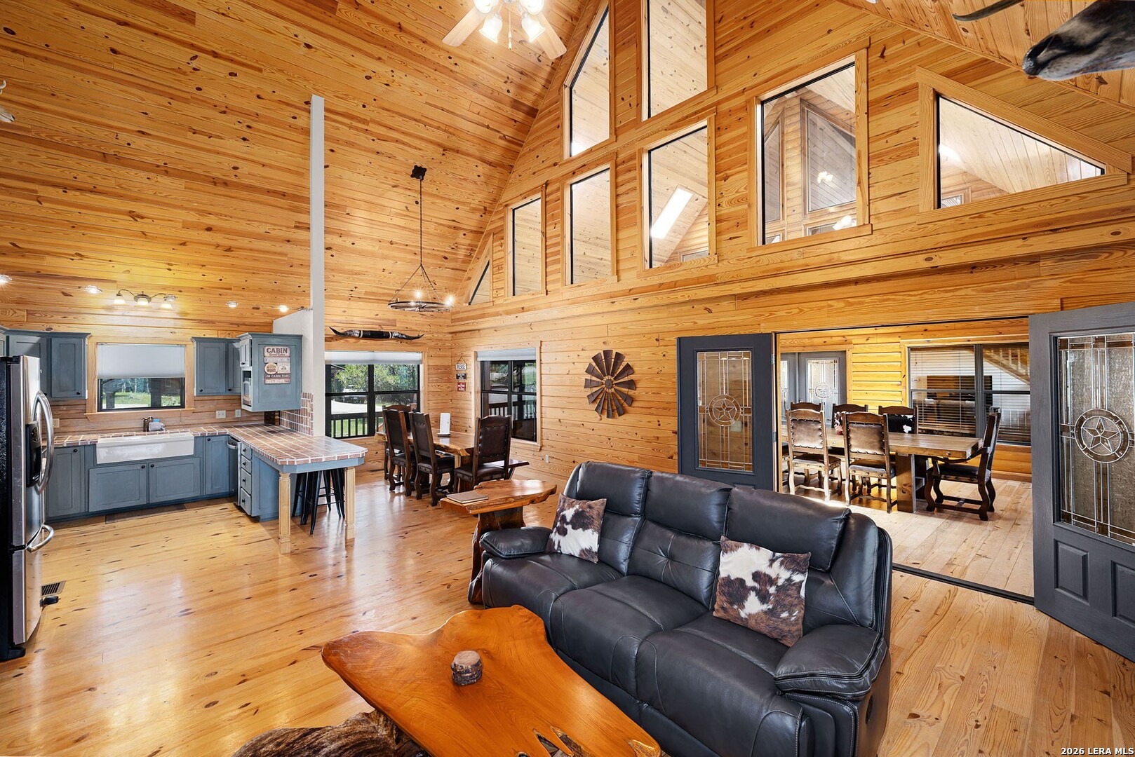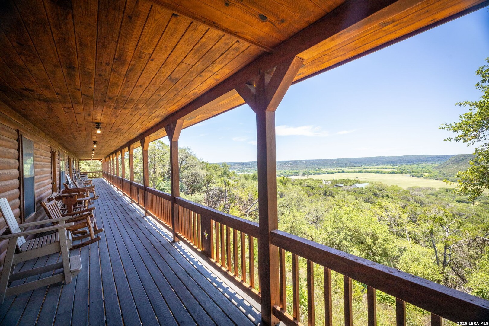 Perched along scenic Skyline Drive, this breathtaking custom log cabin offers the ultimate Texas Hill Country escape. Set on 2 private acres with sweeping panoramic views, this 4,900 sq. ft. retreat is designed for unforgettable gatherings, peaceful retreats, and spectacular sunrises and sunsets enjoyed from the expansive wrap-around porch. From the moment you step inside, you're greeted by a grand lodge-style entrance with soaring wood-plank ceilings, dramatic windows, and an abundance of natural light pouring in through skylights and oversized windows. The heart of the home is a show-stopping great hall featuring a stunning antler chandelier, rustic log walls, and a handcrafted solid-wood dining table that comfortably seats 14 - perfect for hosting large family meals, holiday celebrations, and special events. The interior showcases authentic Hill Country craftsmanship with rich knotty pine walls, exposed beams, warm wood floors, and custom log finishes throughout, creating a true luxury cabin atmosphere. Two spacious living areas and two full kitchens make entertaining effortless and provide ideal separation for guests or multigenerational living. The home offers 5 bedrooms and 3.5 baths and is being sold furnished with beautiful handcrafted log furniture that complements the home's rustic elegance. A detached game room and man cave provide the perfect space for recreation and entertaining. Currently operating as a successful short-term rental, this property offers immediate income potential. Ideally located just minutes from the Guadalupe River, Whitewater Amphitheater, and Canyon Lake, with Gruene and New Braunfels just 30 minutes away. With a brand-new roof, new gutters, and fresh exterior paint, this turnkey Hill Country lodge is ready to be enjoyed as a private retreat, income-producing investment, or legacy family compound.
