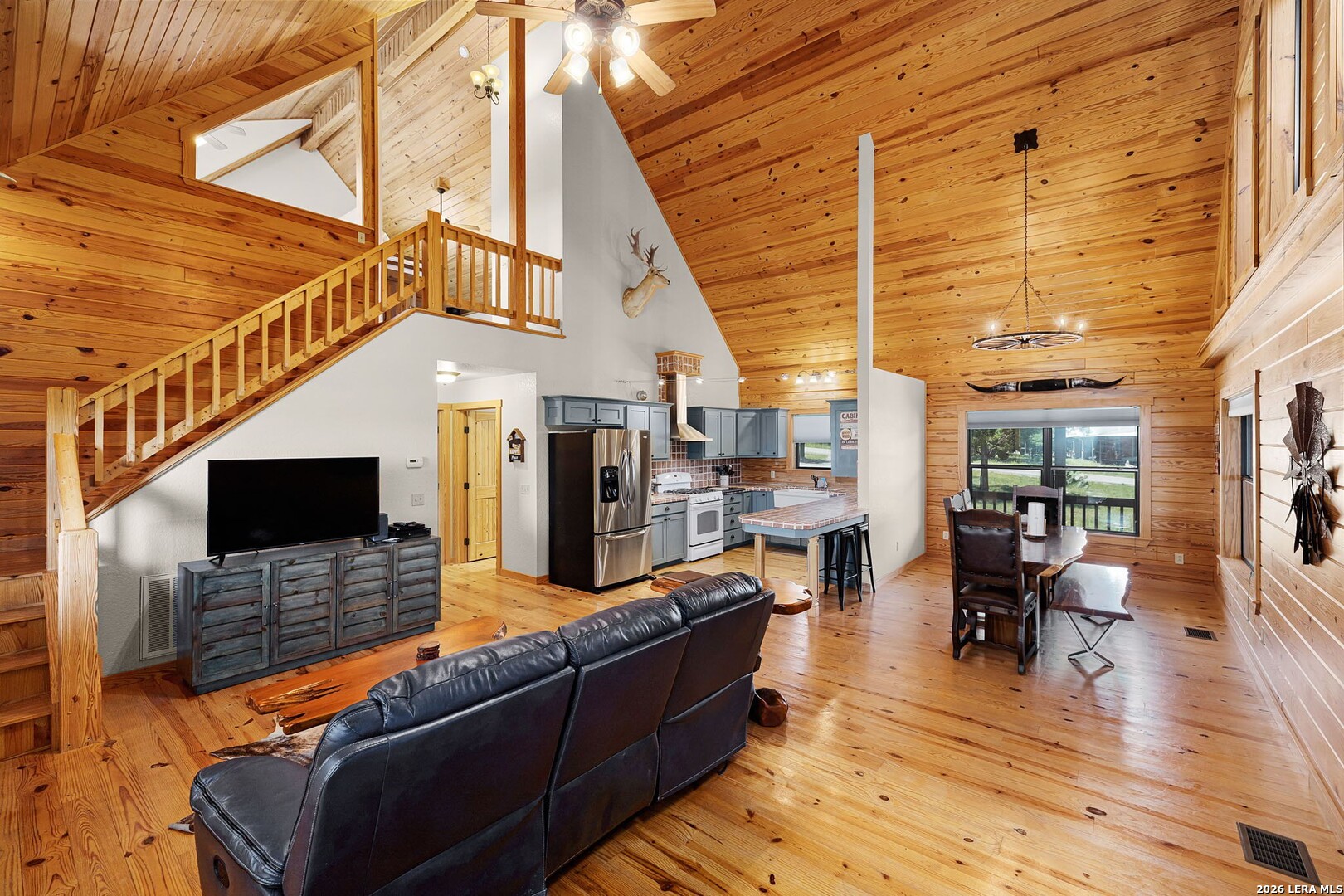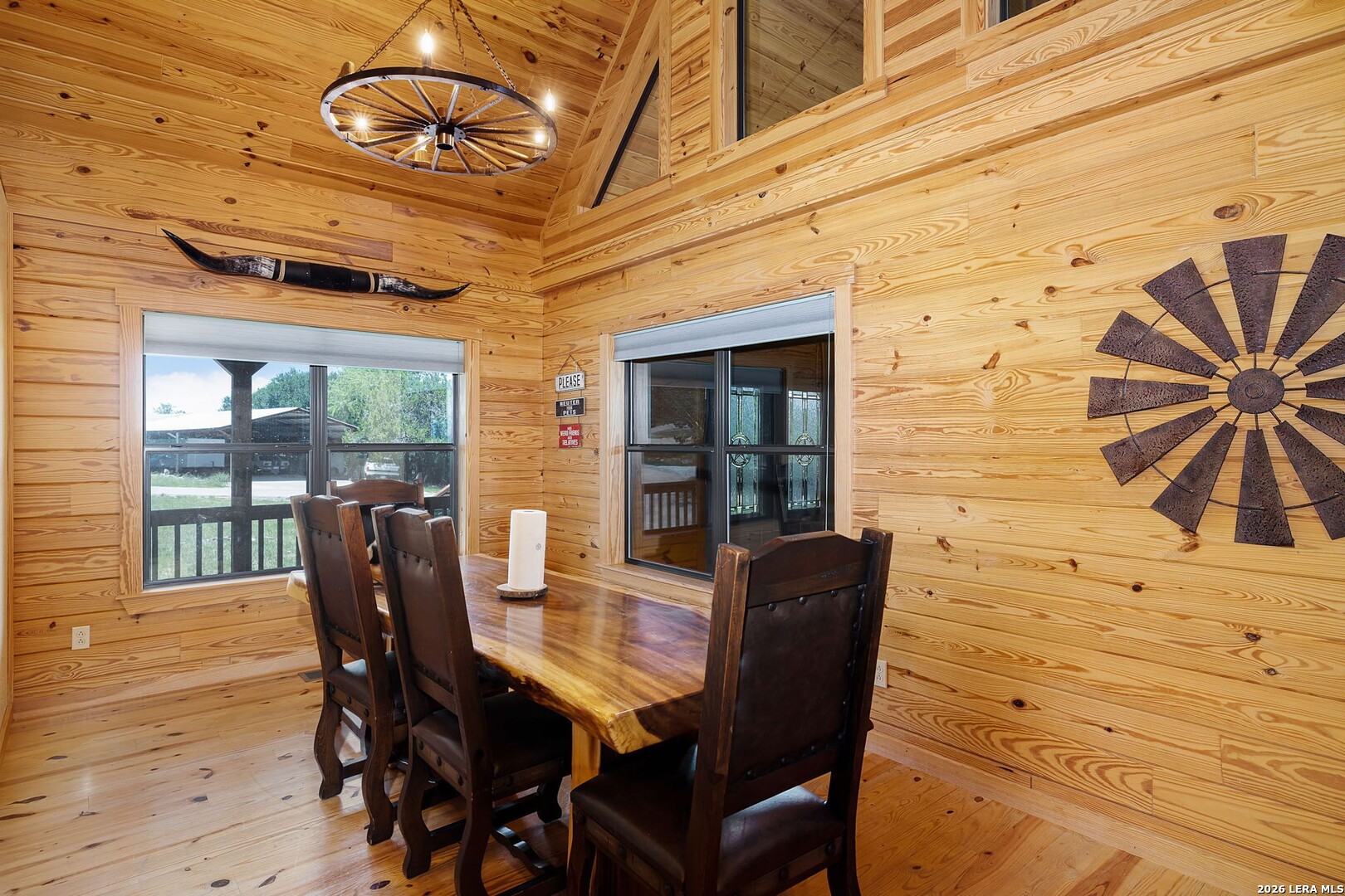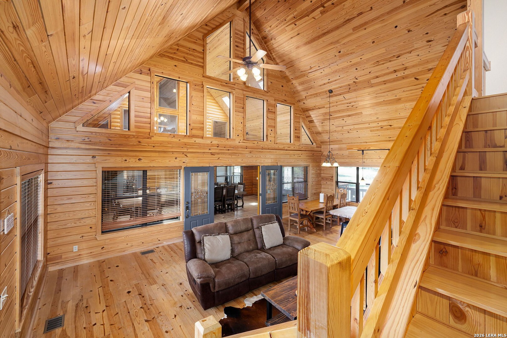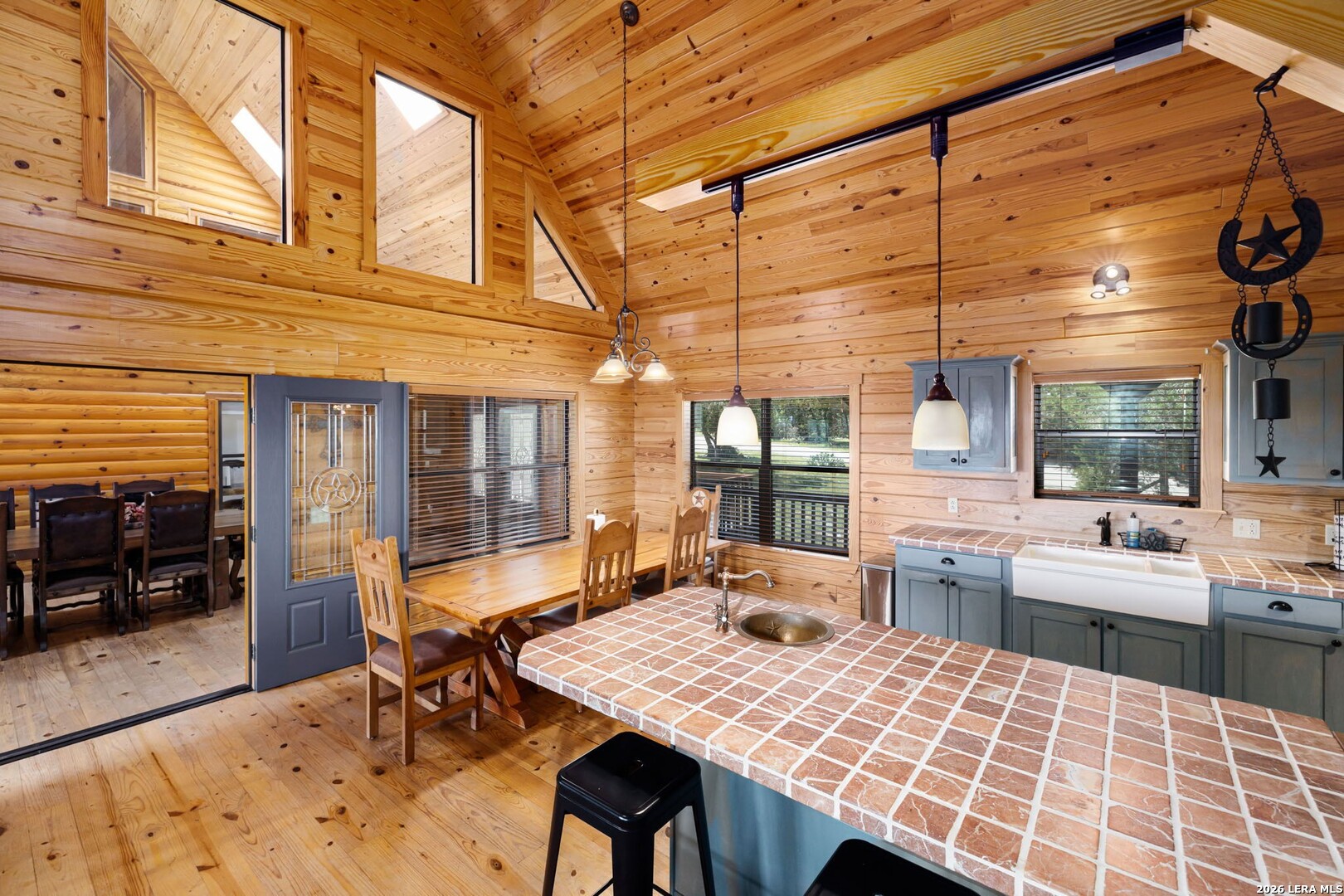 Perched along scenic Skyline Drive, this breathtaking custom log cabin offers the ultimate Texas Hill Country escape. Set on 2 private acres with sweeping panoramic views, this 4,900 sq. ft. retreat is designed for unforgettable gatherings, peaceful retreats, and spectacular sunrises and sunsets enjoyed from the expansive wrap-around porch. From the moment you step inside, you're greeted by a grand lodge-style entrance with soaring wood-plank ceilings, dramatic windows, and an abundance of natural light pouring in through skylights and oversized windows. The heart of the home is a show-stopping great hall featuring a stunning antler chandelier, rustic log walls, and a handcrafted solid-wood dining table that comfortably seats 14 - perfect for hosting large family meals, holiday celebrations, and special events. The interior showcases authentic Hill Country craftsmanship with rich knotty pine walls, exposed beams, warm wood floors, and custom log finishes throughout, creating a true luxury cabin atmosphere. Two spacious living areas and two full kitchens make entertaining effortless and provide ideal separation for guests or multigenerational living. The home offers 5 bedrooms and 3.5 baths and is being sold furnished with beautiful handcrafted log furniture that complements the home's rustic elegance. A detached game room and man cave provide the perfect space for recreation and entertaining. Currently operating as a successful short-term rental, this property offers immediate income potential. Ideally located just minutes from the Guadalupe River, Whitewater Amphitheater, and Canyon Lake, with Gruene and New Braunfels just 30 minutes away. With a brand-new roof, new gutters, and fresh exterior paint, this turnkey Hill Country lodge is ready to be enjoyed as a private retreat, income-producing investment, or legacy family compound.