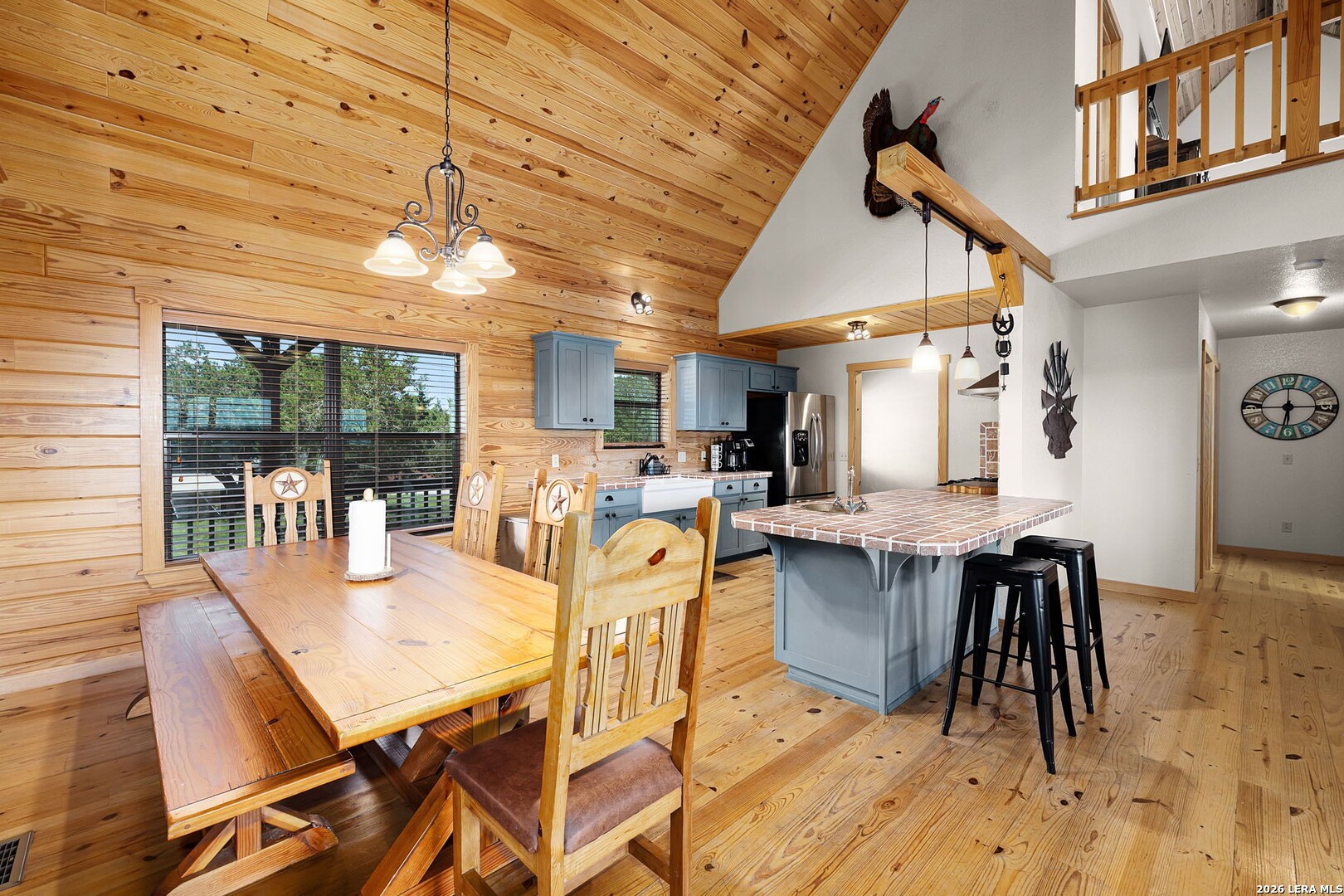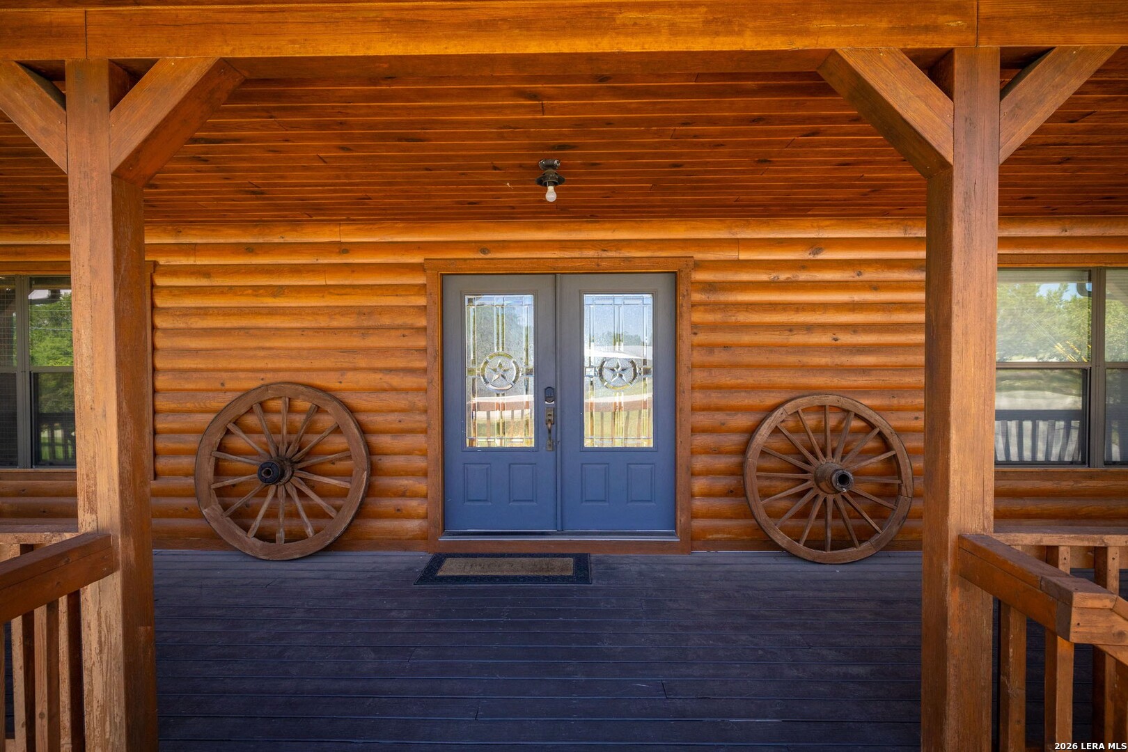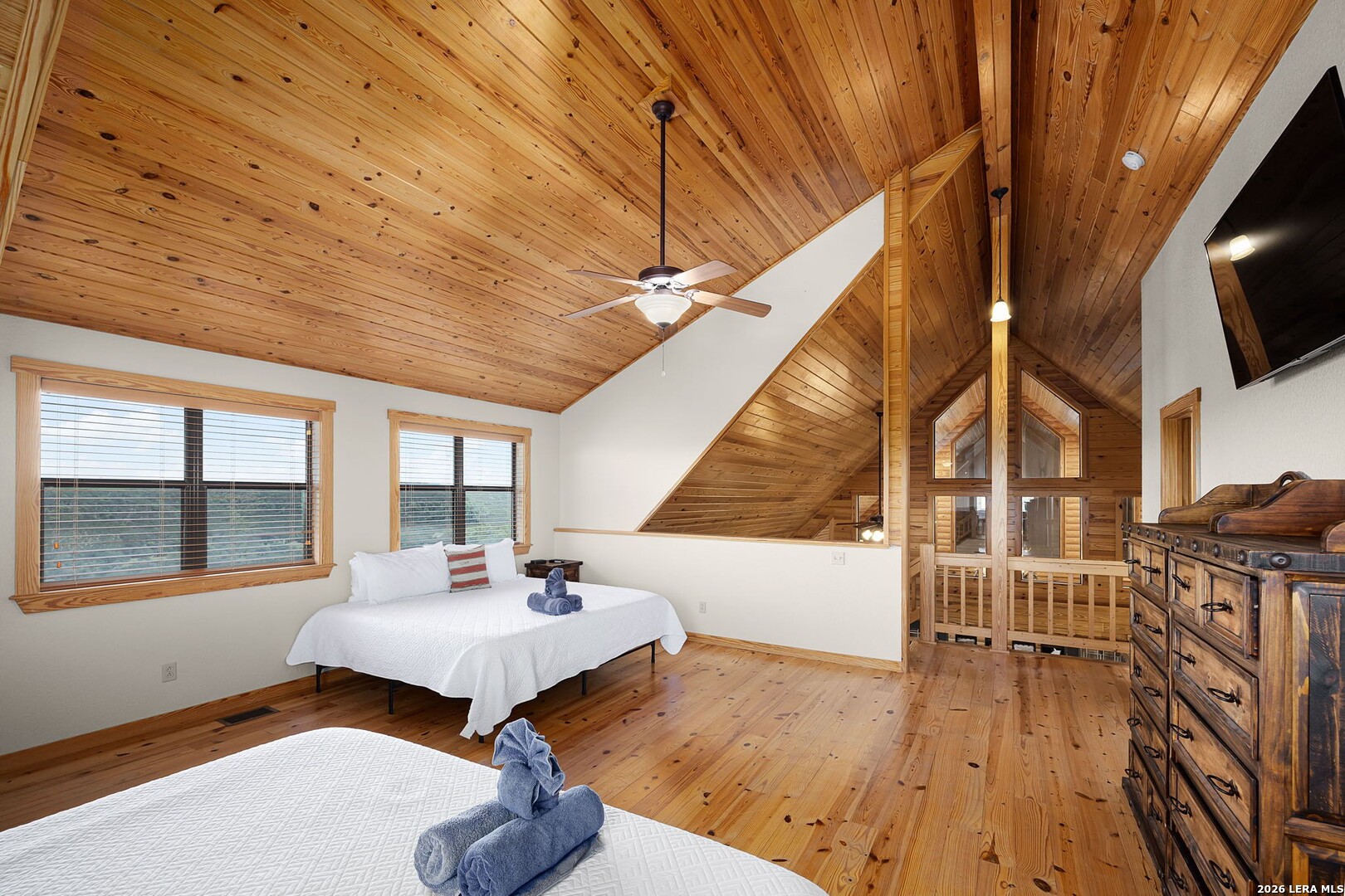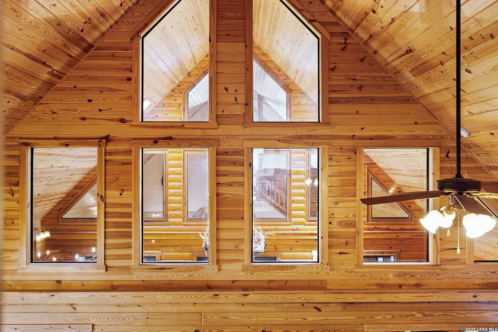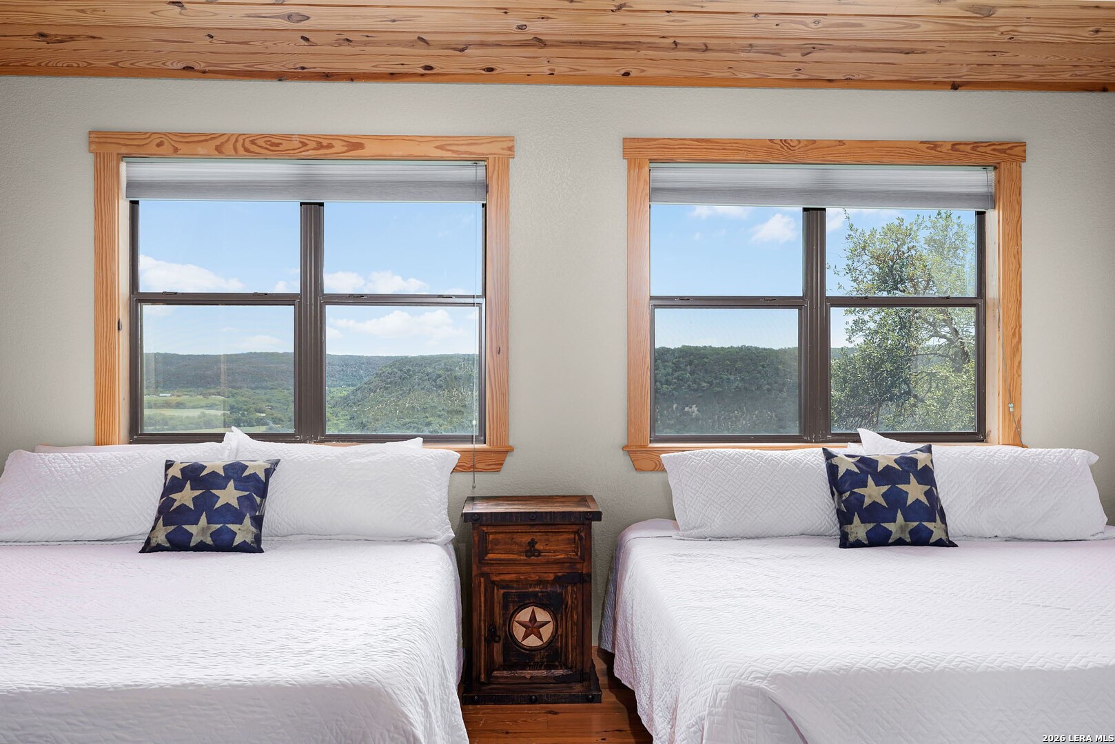 Perched along scenic Skyline Drive, this breathtaking custom log cabin offers the ultimate Texas Hill Country escape. Set on 2 private acres with sweeping panoramic views, this 4,900 sq. ft. retreat is designed for unforgettable gatherings, peaceful retreats, and spectacular sunrises and sunsets enjoyed from the expansive wrap-around porch. From the moment you step inside, you're greeted by a grand lodge-style entrance with soaring wood-plank ceilings, dramatic windows, and an abundance of natural light pouring in through skylights and oversized windows. The heart of the home is a show-stopping great hall featuring a stunning antler chandelier, rustic log walls, and a handcrafted solid-wood dining table that comfortably seats 14 - perfect for hosting large family meals, holiday celebrations, and special events. The interior showcases authentic Hill Country craftsmanship with rich knotty pine walls, exposed beams, warm wood floors, and custom log finishes throughout, creating a true luxury cabin atmosphere. Two spacious living areas and two full kitchens make entertaining effortless and provide ideal separation for guests or multigenerational living. The home offers 5 bedrooms and 3.5 baths and is being sold furnished with beautiful handcrafted log furniture that complements the home's rustic elegance. A detached game room and man cave provide the perfect space for recreation and entertaining. Currently operating as a successful short-term rental, this property offers immediate income potential. Ideally located just minutes from the Guadalupe River, Whitewater Amphitheater, and Canyon Lake, with Gruene and New Braunfels just 30 minutes away. With a brand-new roof, new gutters, and fresh exterior paint, this turnkey Hill Country lodge is ready to be enjoyed as a private retreat, income-producing investment, or legacy family compound.