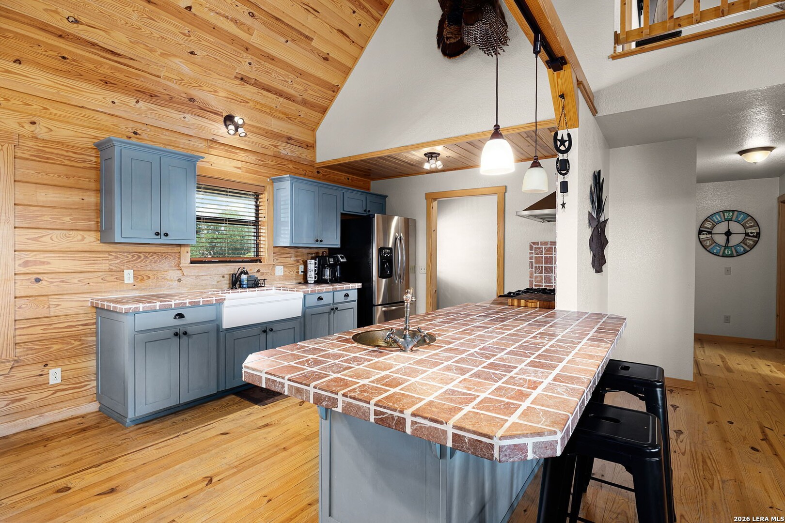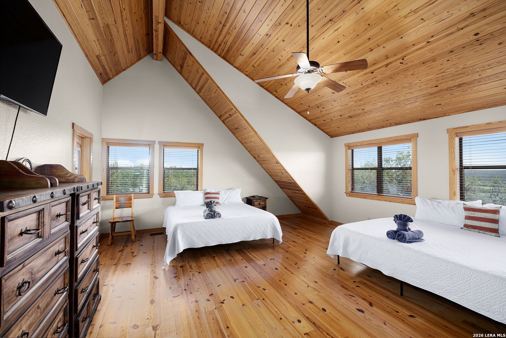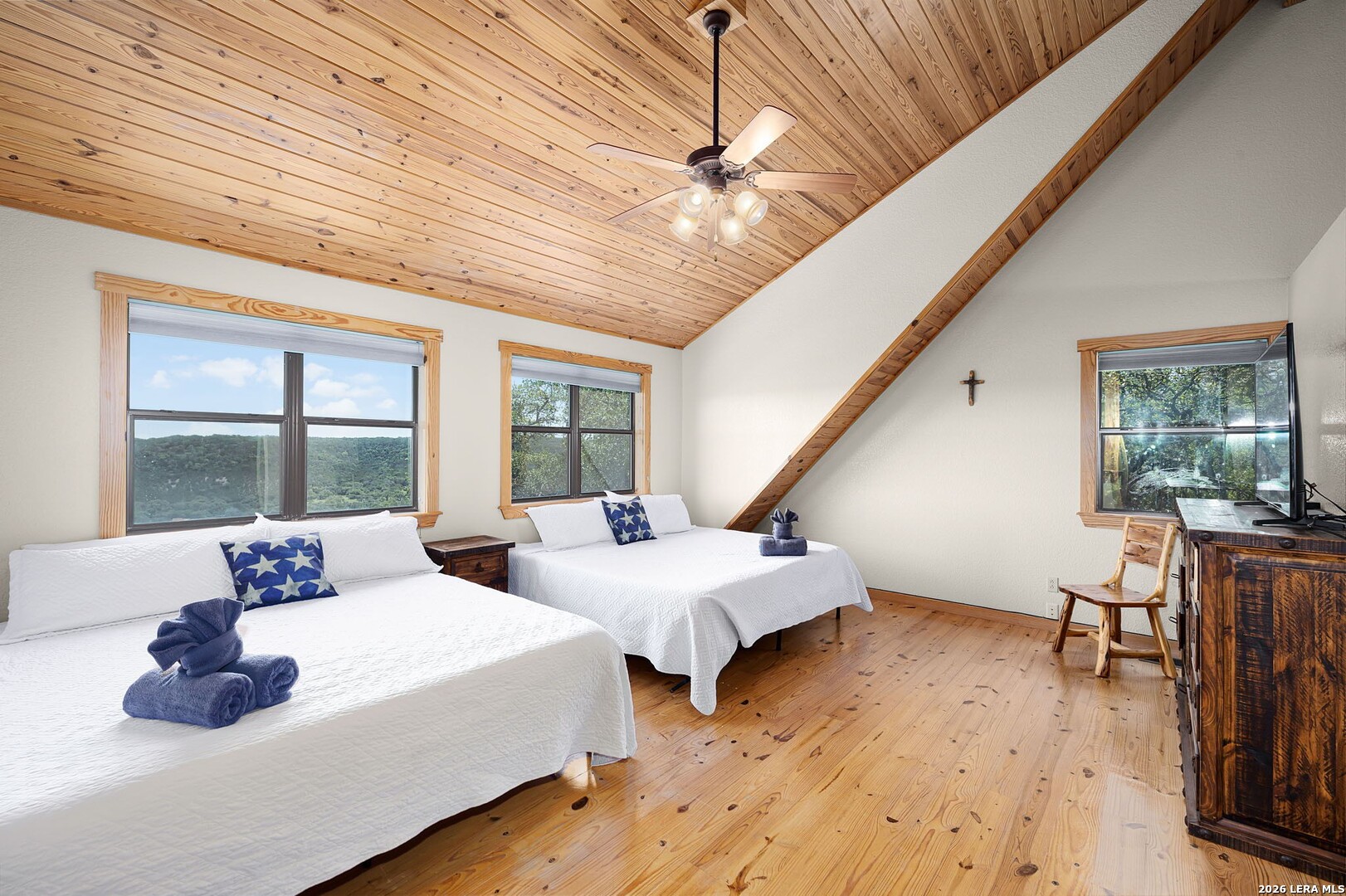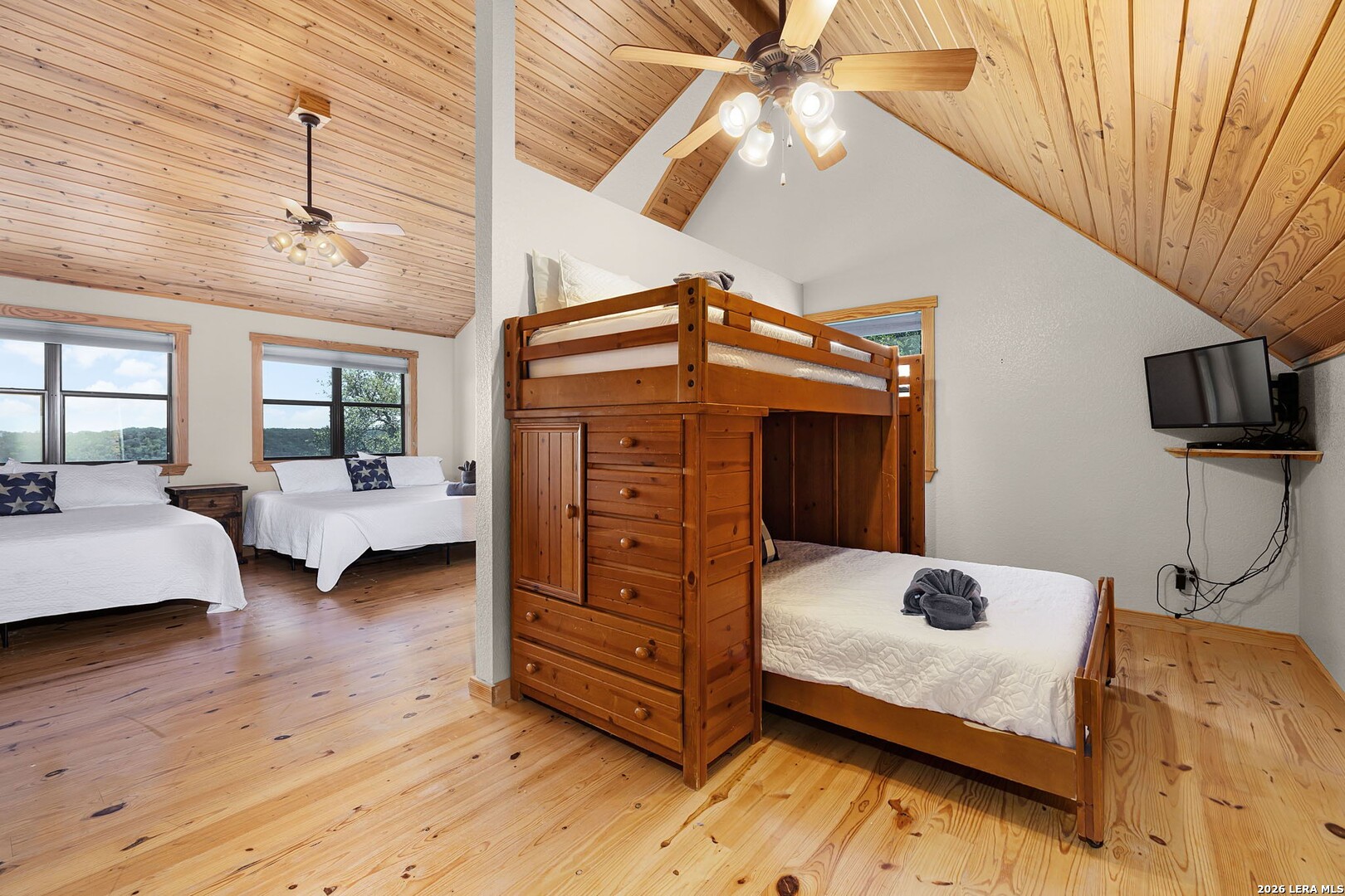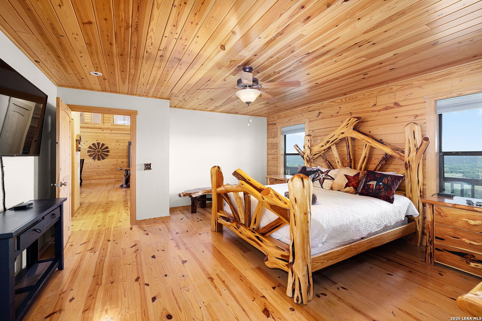 Perched along scenic Skyline Drive, this breathtaking custom log cabin offers the ultimate Texas Hill Country escape. Set on 2 private acres with sweeping panoramic views, this 4,900 sq. ft. retreat is designed for unforgettable gatherings, peaceful retreats, and spectacular sunrises and sunsets enjoyed from the expansive wrap-around porch. From the moment you step inside, you're greeted by a grand lodge-style entrance with soaring wood-plank ceilings, dramatic windows, and an abundance of natural light pouring in through skylights and oversized windows. The heart of the home is a show-stopping great hall featuring a stunning antler chandelier, rustic log walls, and a handcrafted solid-wood dining table that comfortably seats 14 - perfect for hosting large family meals, holiday celebrations, and special events. The interior showcases authentic Hill Country craftsmanship with rich knotty pine walls, exposed beams, warm wood floors, and custom log finishes throughout, creating a true luxury cabin atmosphere. Two spacious living areas and two full kitchens make entertaining effortless and provide ideal separation for guests or multigenerational living. The home offers 5 bedrooms and 3.5 baths and is being sold furnished with beautiful handcrafted log furniture that complements the home's rustic elegance. A detached game room and man cave provide the perfect space for recreation and entertaining. Currently operating as a successful short-term rental, this property offers immediate income potential. Ideally located just minutes from the Guadalupe River, Whitewater Amphitheater, and Canyon Lake, with Gruene and New Braunfels just 30 minutes away. With a brand-new roof, new gutters, and fresh exterior paint, this turnkey Hill Country lodge is ready to be enjoyed as a private retreat, income-producing investment, or legacy family compound.