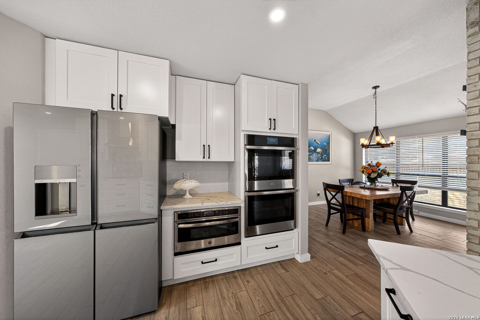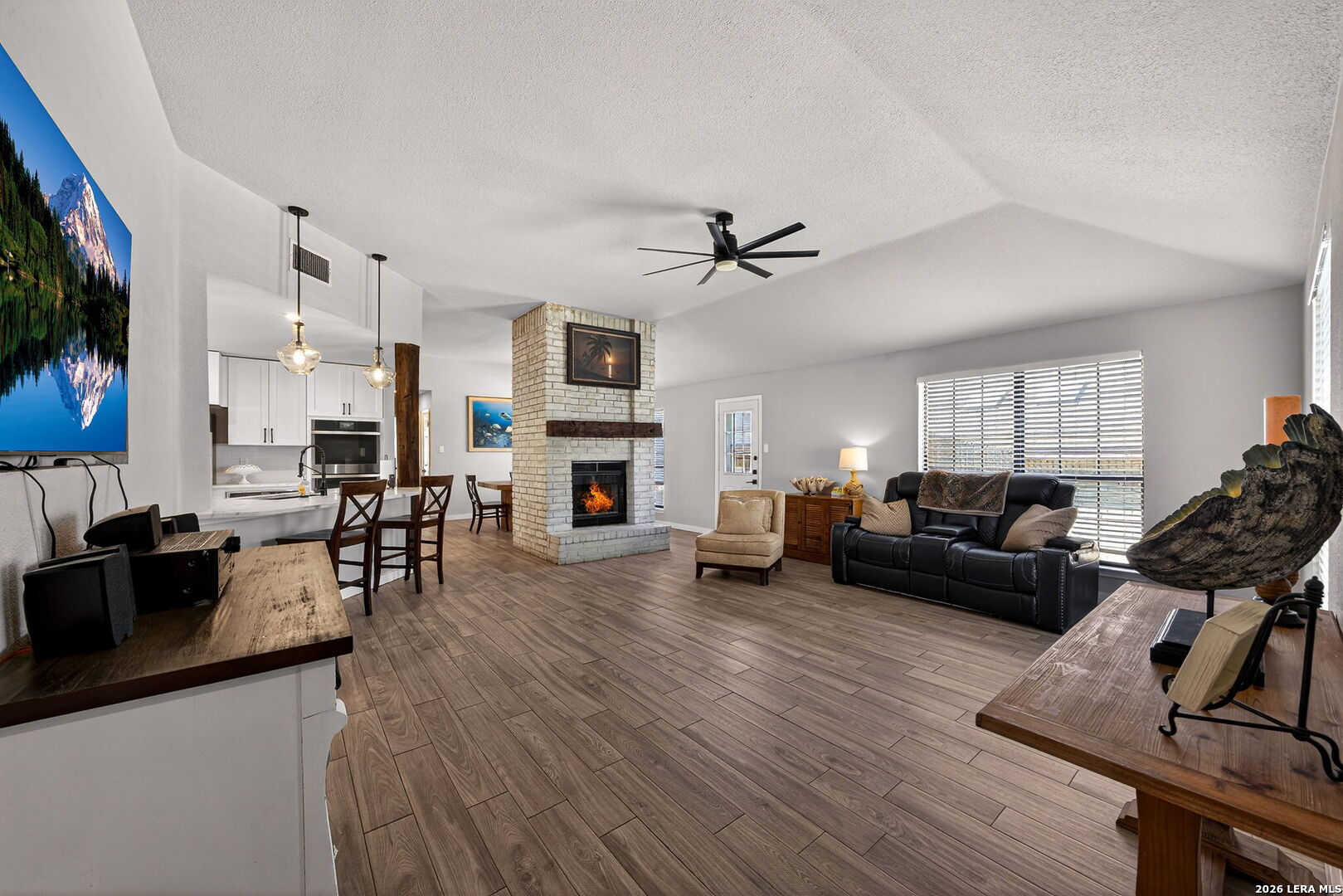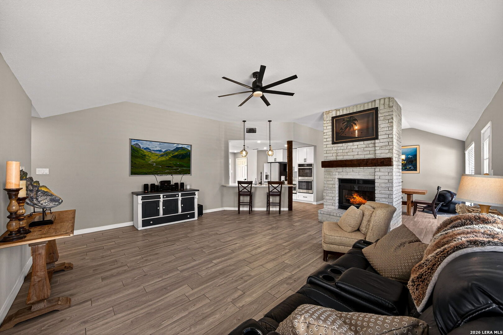 Beautifully remodeled 1 Story Located in Stone Oak! Home Features - 3 Bedrooms * 2 Baths * Separate Dining Space * Wood Look Tile Throughout * Quartz Counter-Tops * Custom Cabinetry with Built in Stainless Steel Appliances * Brick Wood Burning Fireplace at Living * High Ceilings * Large Primary Suite with Dual Vanity Sinks and a Oversized Mudset Shower at the Primary Bath * Custom Closet Shelving * Upgraded Lighting Fixtures * 2" Faux Blinds * Garage Door Opener * Mature Trees and more! Roof was Replaced in 2023. Students will attend award wining North East Schools.