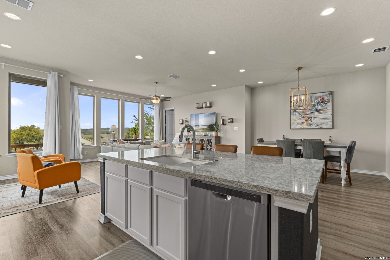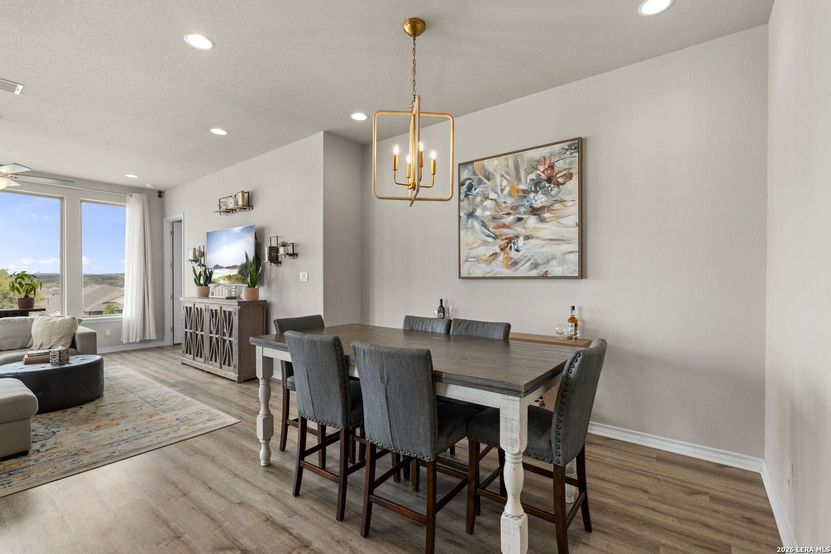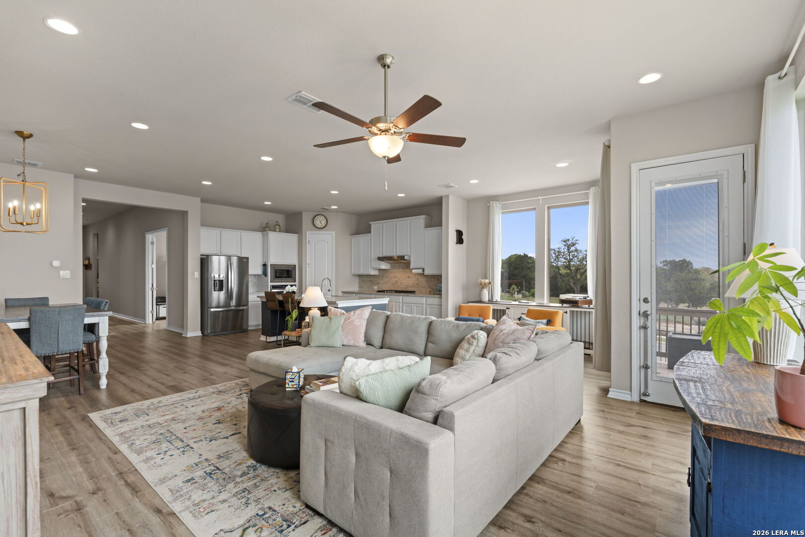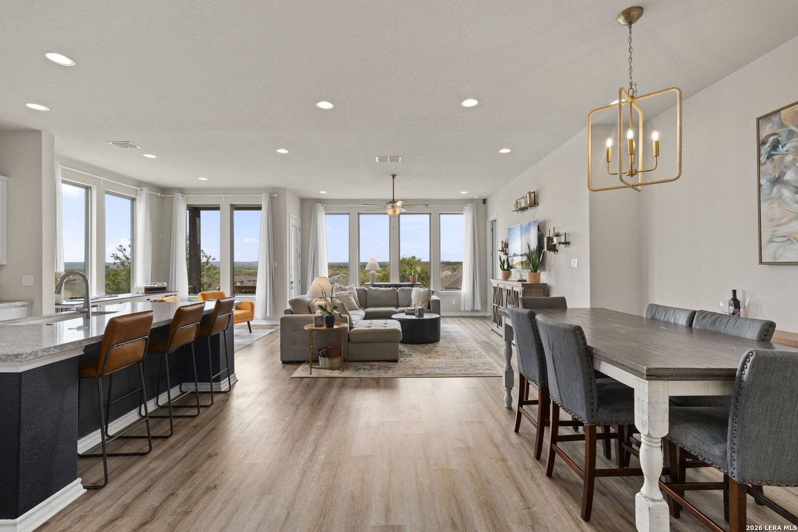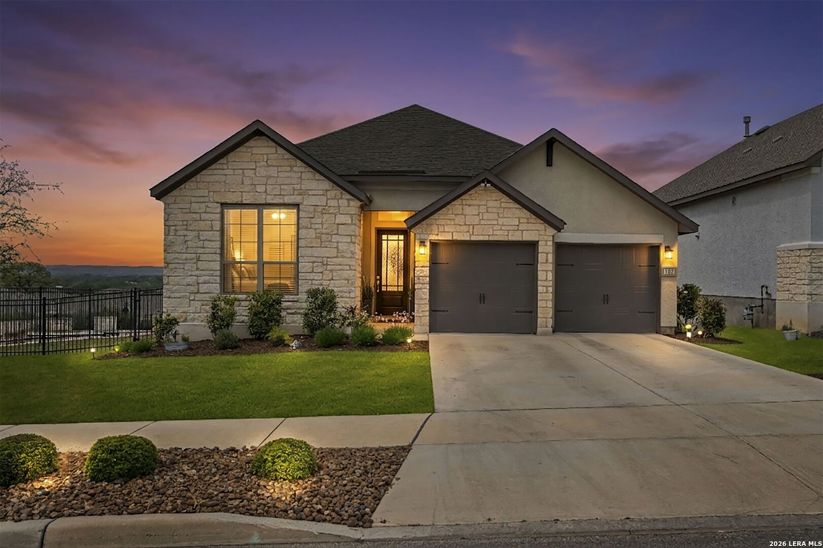 VIEWS, VIEWS, VIEWS! This beautifully maintained single-story home offers breathtaking panoramic Hill Country scenery and unforgettable sunsets that feel like a nightly masterpiece. Featuring 4 bedrooms, 3 bathrooms, and 2,540 sqft, this home provides a no-steps interior layout designed for both comfort and ease of living. From the moment you enter, you're welcomed by high ceilings, abundant natural light, and an open-concept design that creates a seamless flow between the living, dining, and kitchen areas. The kitchen is positioned at the heart of the home with generous counter space, ample storage, and easy connection to the main living areas, making it ideal for both everyday living and entertaining. The primary suite offers a peaceful retreat, while three additional bedrooms and two full bathrooms provide flexibility for guests or everyday living. A dedicated office adds even more versatility and can easily function as a guest room, playroom, or secondary living space depending on your needs. Step outside to a covered patio that overlooks the elevated backyard, perfectly positioned to capture sweeping Hill Country views. The yard features a combination of stone privacy fencing and wrought iron, allowing you to take in the scenery while still enjoying a defined outdoor space. Whether you're enjoying a quiet morning coffee or winding down at sunset, this home delivers a lifestyle that's hard to replicate. With its thoughtful layout, stunning views, and well-maintained condition, this is one you truly have to experience in person.