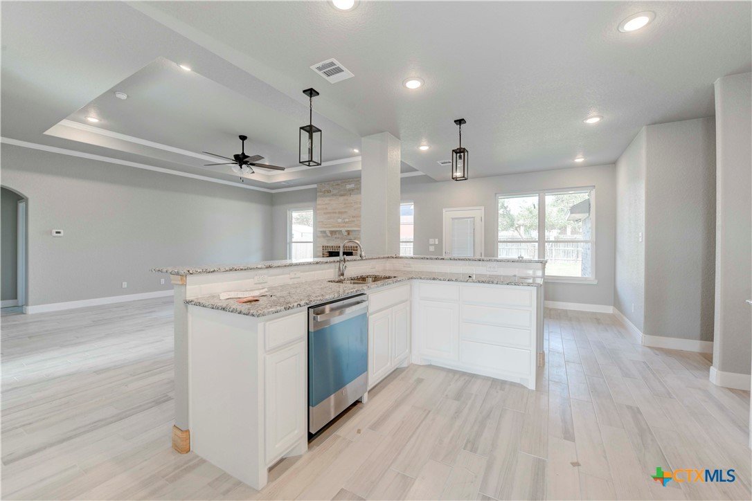 Manning Homes has done it again! This luxurious home's exterior features a beautiful mix of stone and brick. The interior features gorgeous ceramic tile floors throughout the home, with plush carpet in the bedrooms. Modern two-tone interior paint, Santa Fe style interior doors, crown molding and 5" baseboards in select areas. This home boasts stainless steel appliances, elegant granite counter-tops and gorgeous custom white custom cabinets. Enjoy the electric fireplace on cold winter days and the beautifully landscaped outdoor space during the rest of the year. Welcome to your dream home!