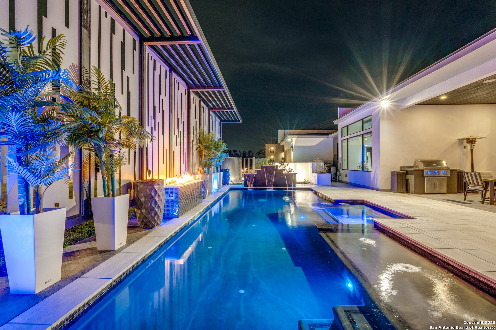 Contemporary & Stylish with a perfect floor plan and modern appeal... a true entertainer's dream. This custom 4 bedroom, 4.5 bath one-story home is located in the exclusive Canyons at Scenic Loop! Nestled on an elevated .6 acre lot, walk out the back doors to a level backyard, gorgeous pool/spa privatized with a 12 ft metal Pergola with custom lighting and stunning Hill Country views in the front. Upscale custom touches are found throughout the entire home including: open floor, all bedrooms with en-suite baths, metal roof, circular drive, oversize metal front door, great curb appeal, SOARING ceiling height, beautiful ceiling treatments, Rinnai Thankless water heater, 48 in built-in gas Thermador cook top with 6 burners + griddle, built-in Thermador refrigerator, Carrera Marble in primary bath, wood floors in all bedrooms, Porcelain tile, stacked stone black quartz fireplace, quartz countertops, Sedona outdoor grill, wrought iron fence and water softener. Highly rated Northside Independent School District. Located near I-10, 1604, Boerne and the finest restaurants/shopping.