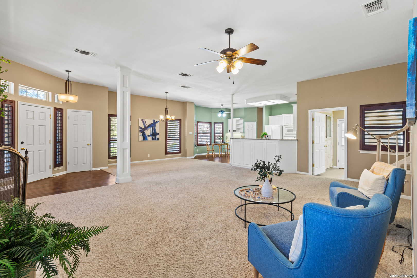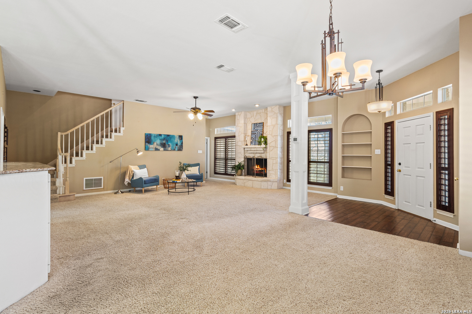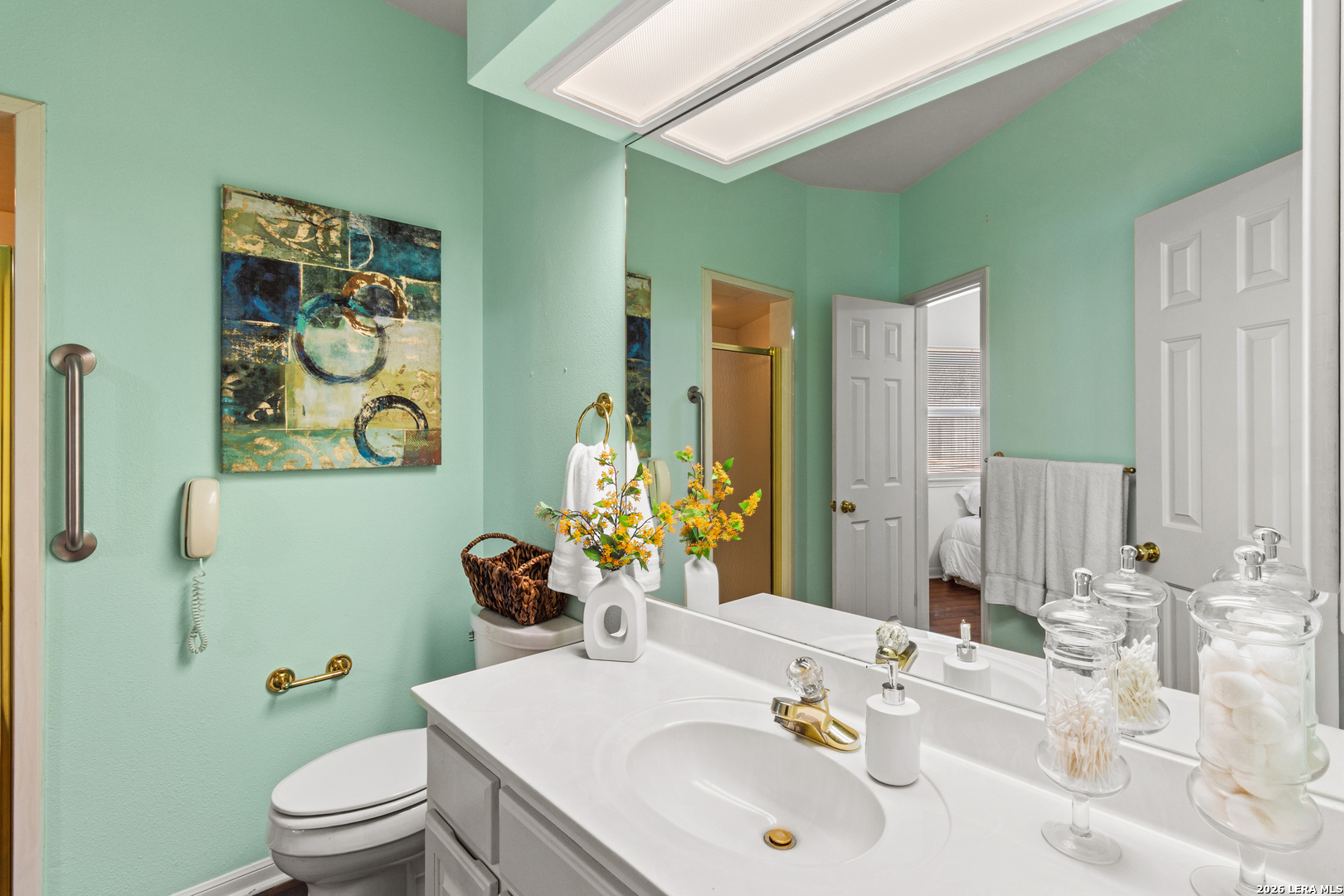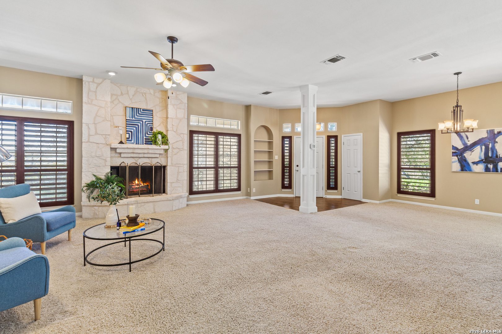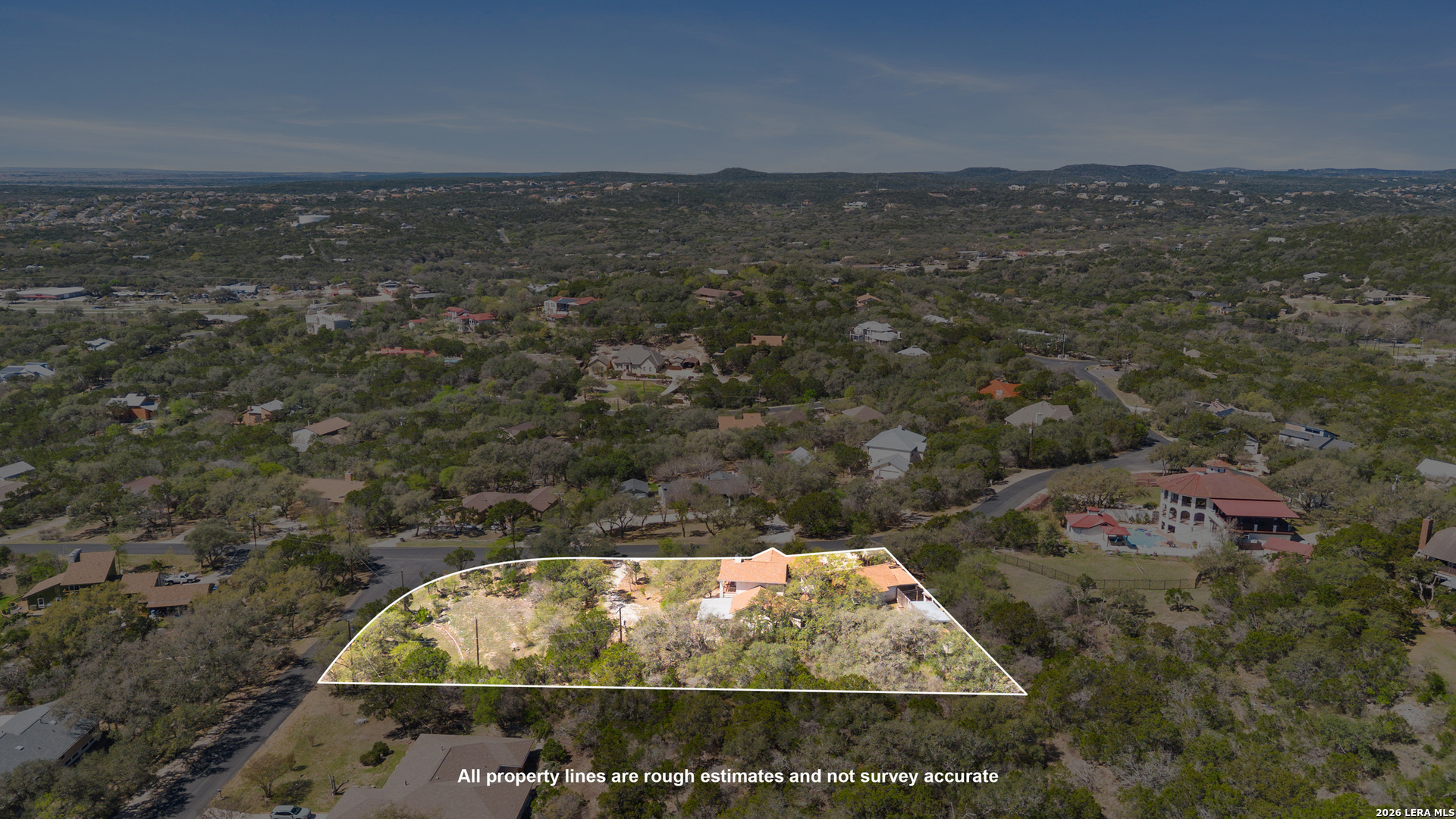 Are you looking for an amazing home that is located in Helotes Park Estates with almost an acre accented by beautiful mountain laurels? Then this is your next home! With a great location in Helotes, this home offers convenient access to shopping, dining and entertainment yet in a charming country setting. The spacious home features 4 bedrooms and 3 full baths with the primary bedroom and one additional bedroom and full bath downstairs. The spacious primary bedroom serves as a great owner's retreat with sufficient sitting room space and entrance into a relaxing spa room. There are two bedrooms upstairs and adjacent spacious common area with built-ins that offer multiple options as beds, play area or second living room. The second story also includes a porch with beautiful views that extend to downtown San Antonio. Don't stop there, there is an enclosed porch on the main level that can be used as a playroom, sewing room, office or home study area. Like other areas in the home, it's enhanced with natural light and also provides access to the backyard. Now we step into the open living/dining area with a beautiful rock fireplace. The spacious kitchen includes an island, desk area and second dining space adjacent to a large walk-in pantry. Another key feature of this home is storage space; well planned throughout the home and built-ins in the garage as well. A carport and two sheds add to the offerings of this home. The many features will be better described when you stop by to see this beautiful property. Don't miss out on the opportunity to make this your home.