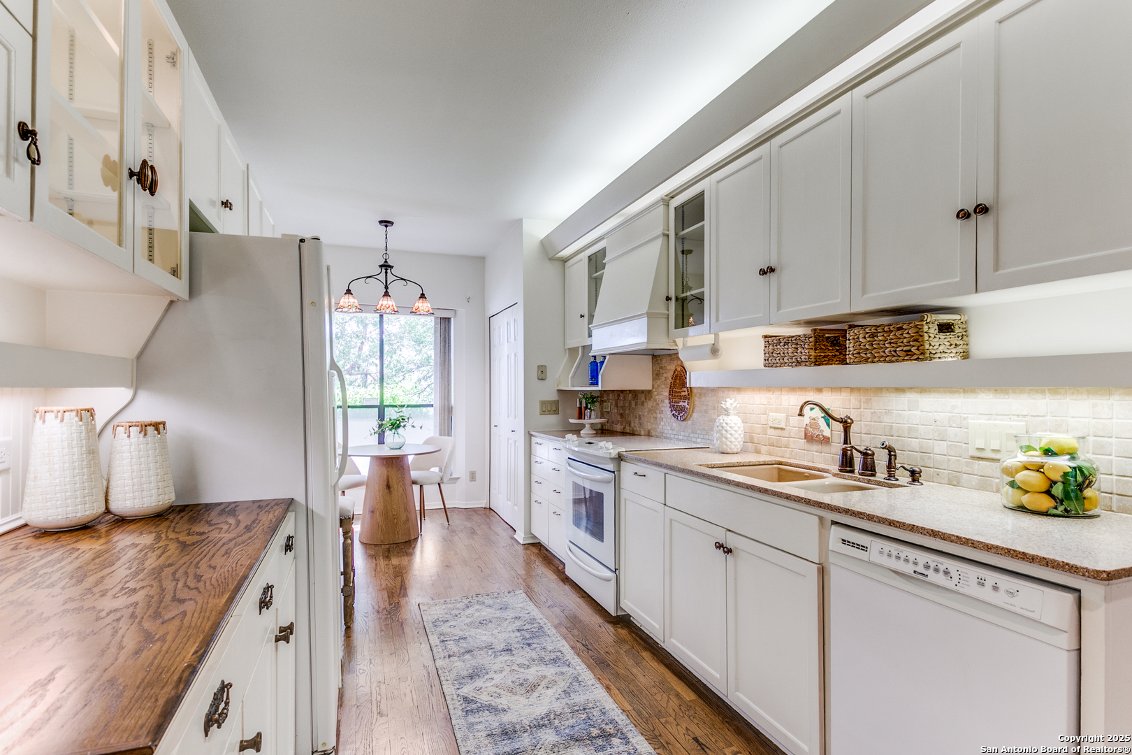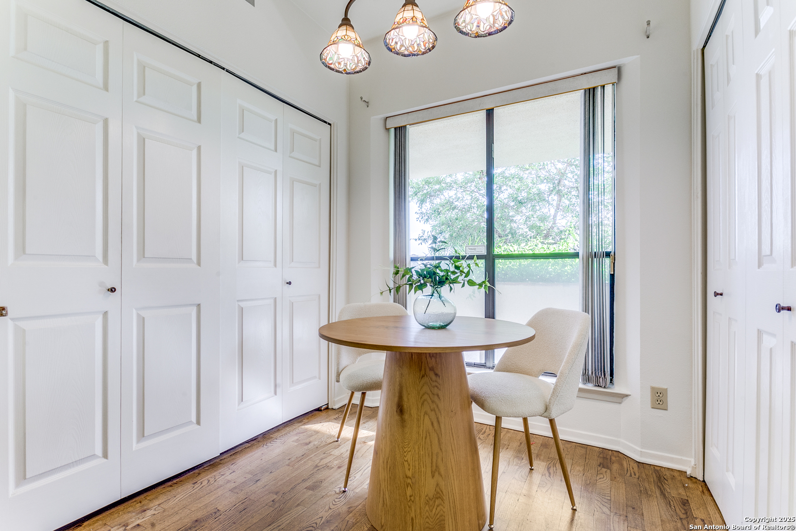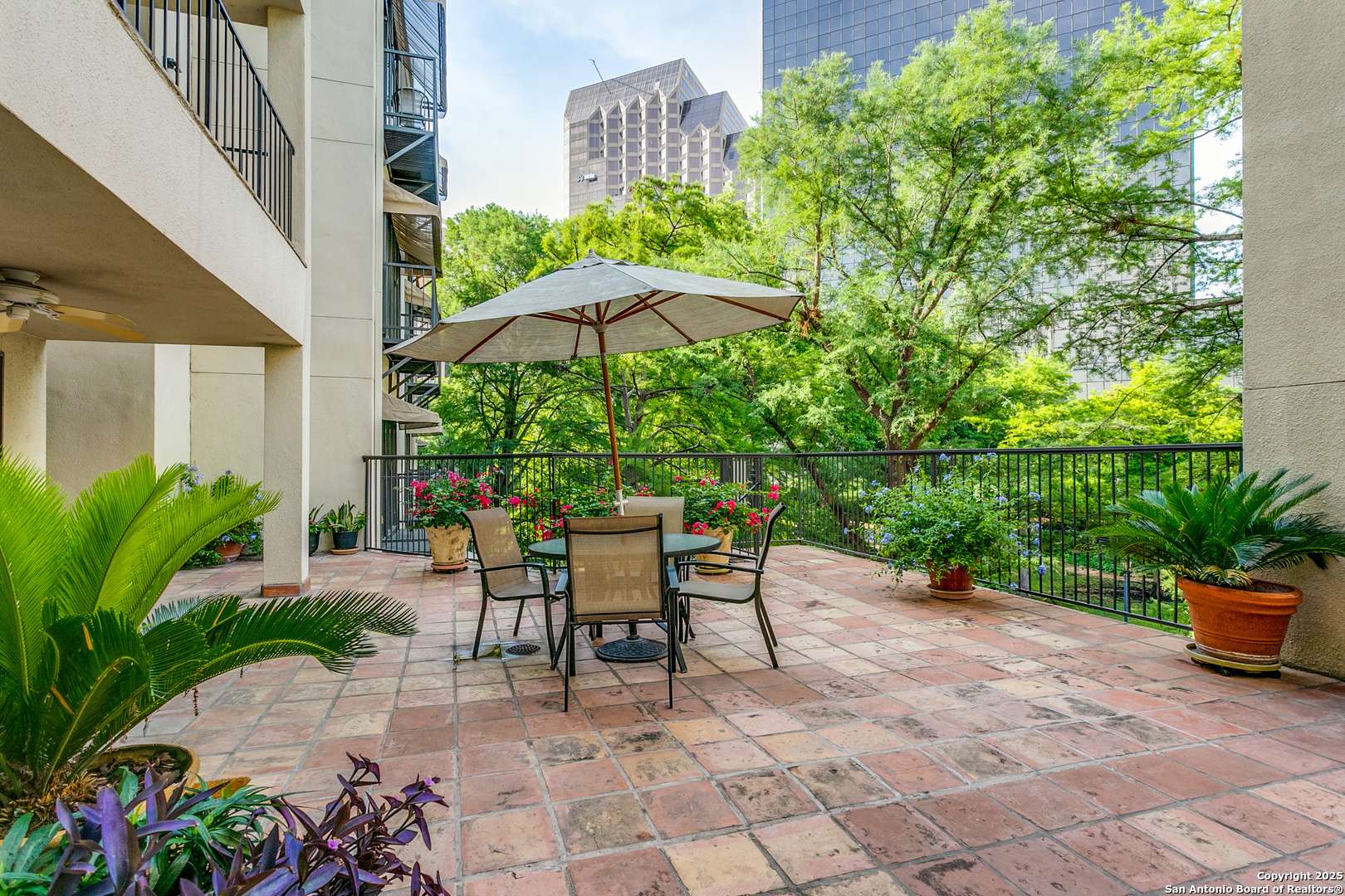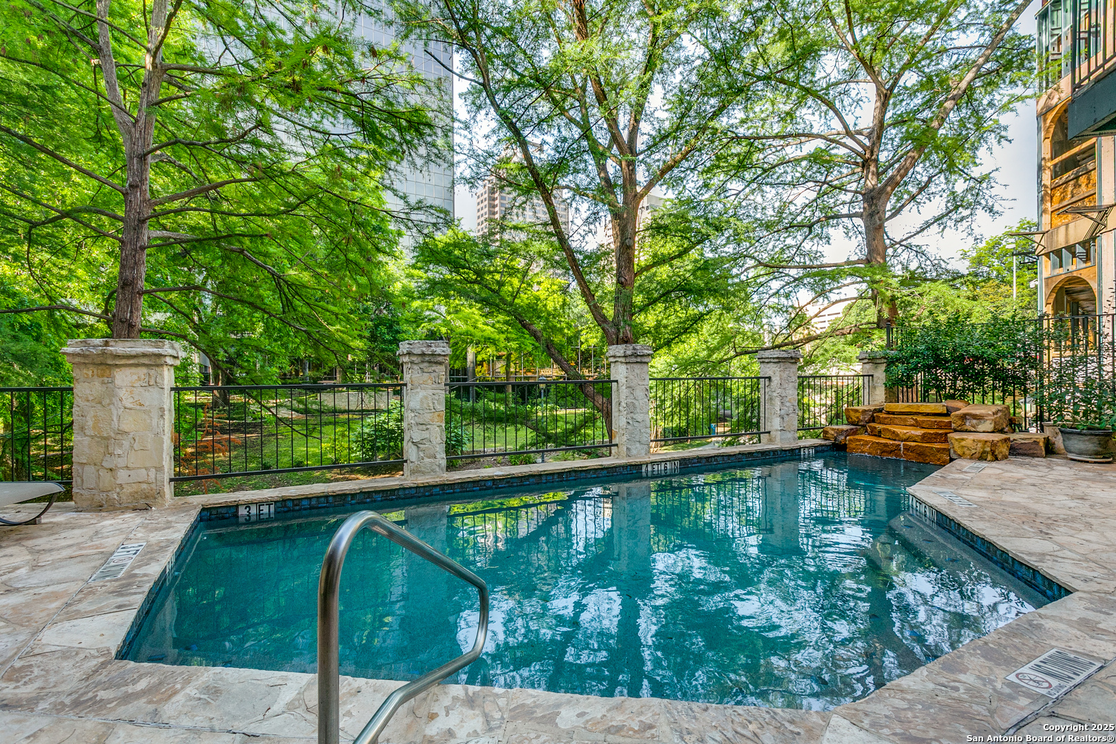 Perfect lock and leave! This is a rare opportunity to own a charming condo on the San Antonio River. The open living room and dining area has a fireplace and balcony access with lush treetop views. Hardwood floors flow throughout the main level. The nicely equipped kitchen has a breakfast area and there's an efficient little office tucked under the stairs. Upstairs primary with fireplace and balcony. Second bedroom being used as a family room. Two blocks from Tobin Center, one block from Central Library with all the conveniences of living downtown.