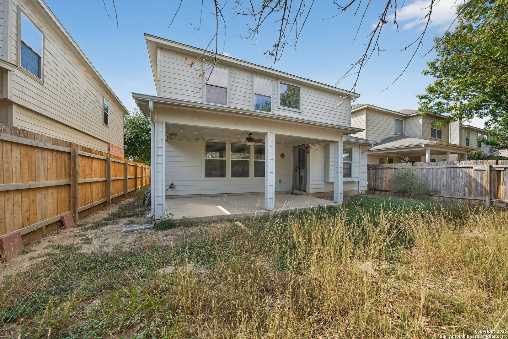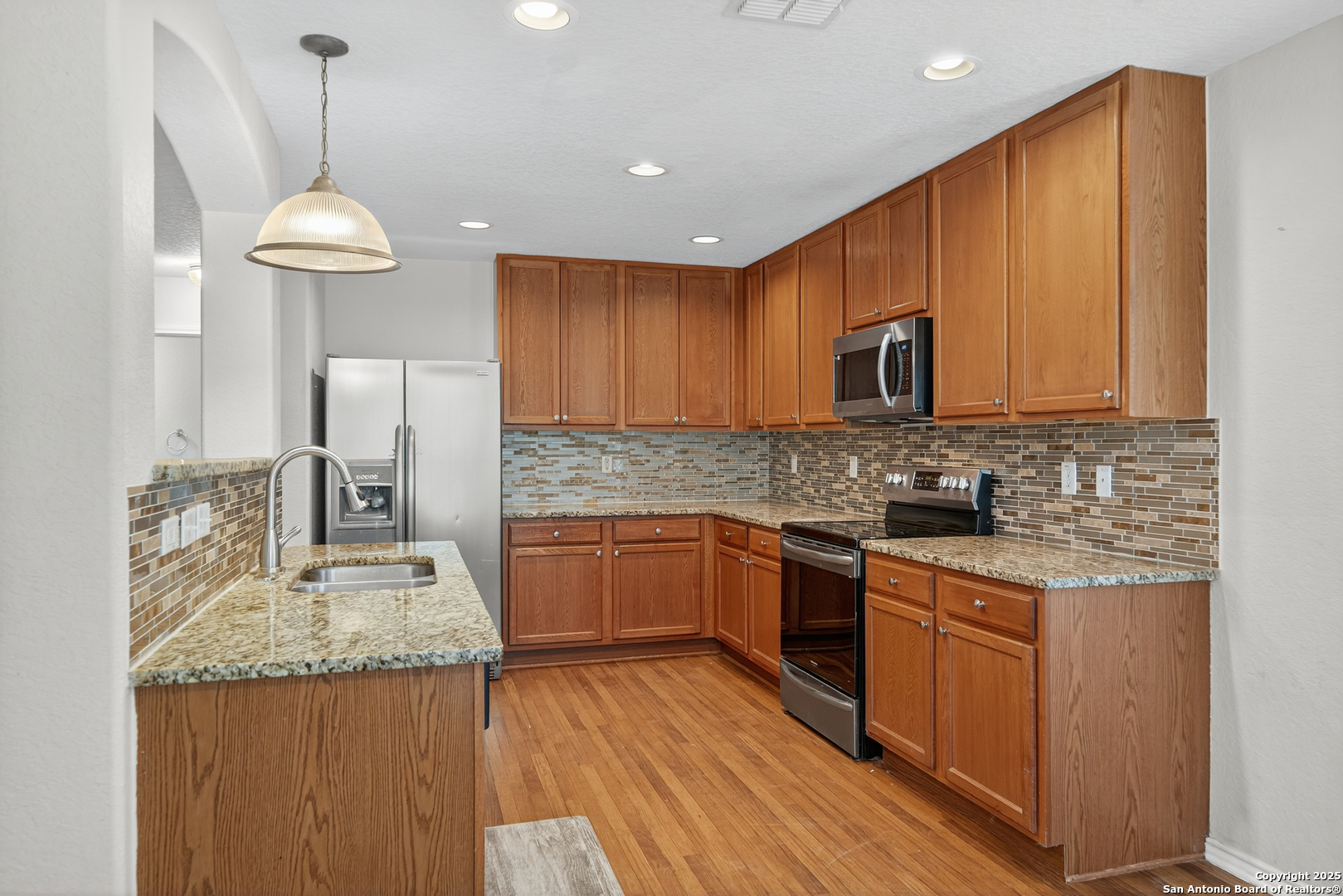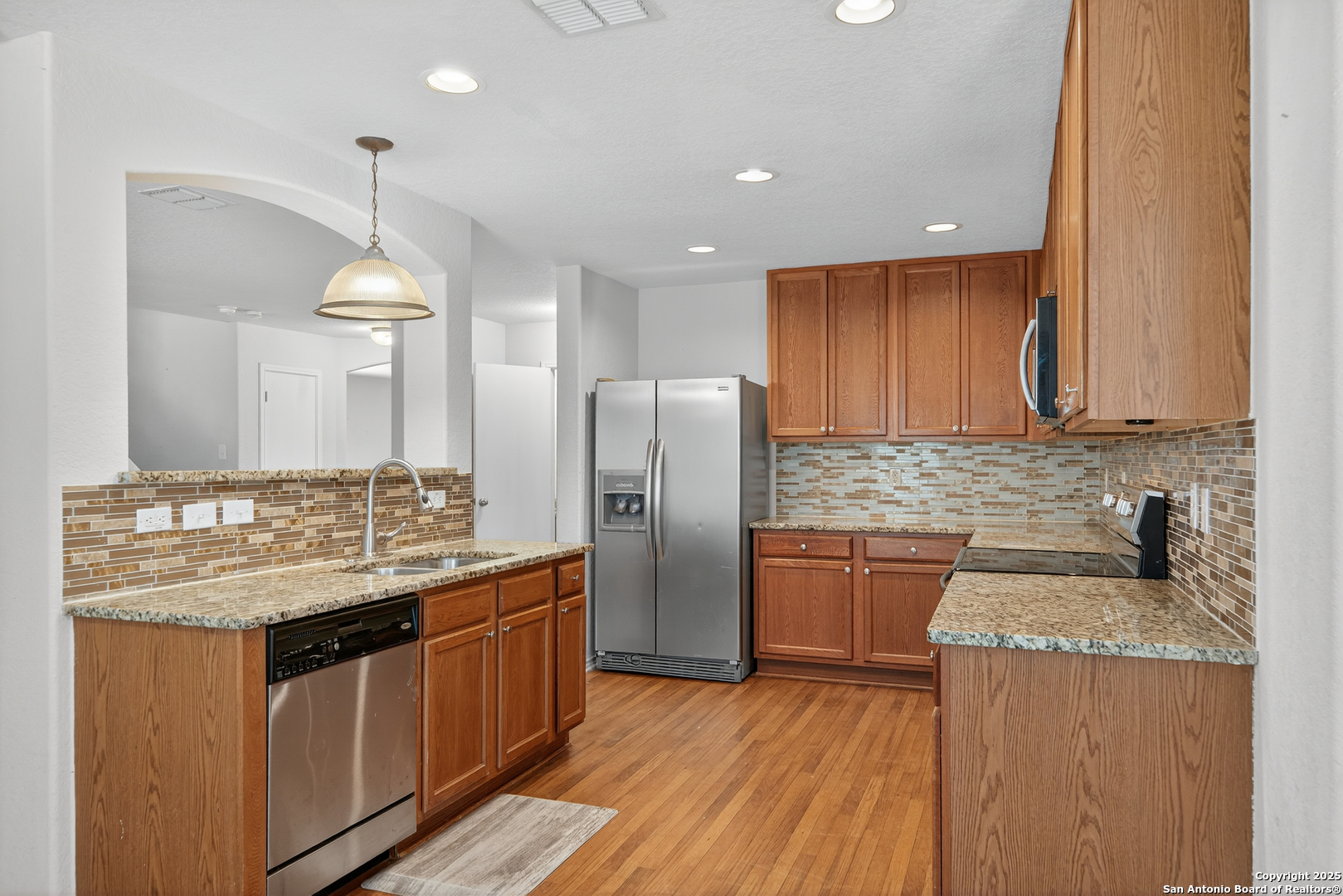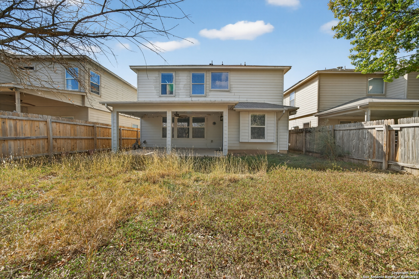 Beautifully updated 4-bedroom home in highly sought-after Laurel Canyon right at the Helotes line! Step into an open, airy layout with wood/laminate flooring throughout-no carpet anywhere. The kitchen features granite counters, stainless steel appliances, and a great breakfast-bar flow into the living area. All bedrooms are privately located upstairs along with a spacious game room perfect for movie nights, kids' space, or a second living area. The primary suite offers a true retreat with a large layout, separate garden tub and walk-in shower, and generous closet space. Out back, relax on the extended covered patio overlooking a peaceful greenbelt-ideal for quiet evenings or weekend BBQs. Neighborhood amenities include a pool, park, playground, covered swings, sand volleyball, basketball court, and community BBQ areas. Plus, you're minutes from Loop 1604, La Cantera, Helotes Marketplace, top dining, shopping, and entertainment. A fantastic Helotes-area find and we believe you will absolutely love it here!