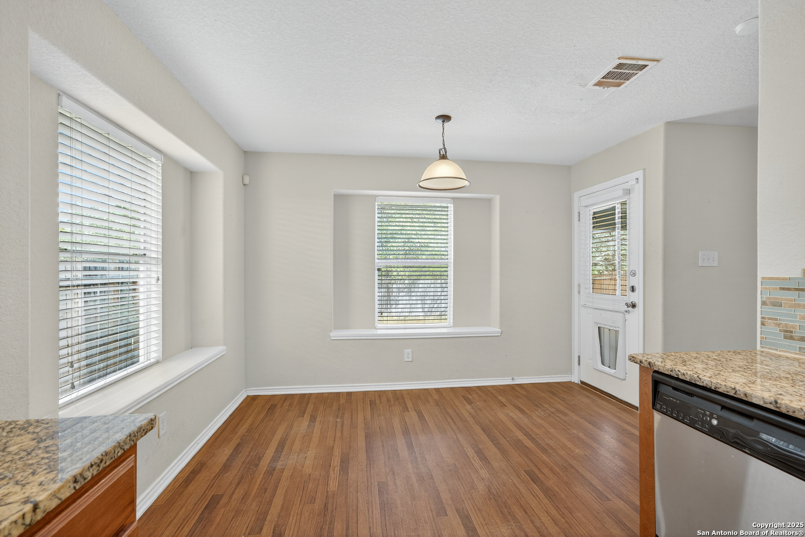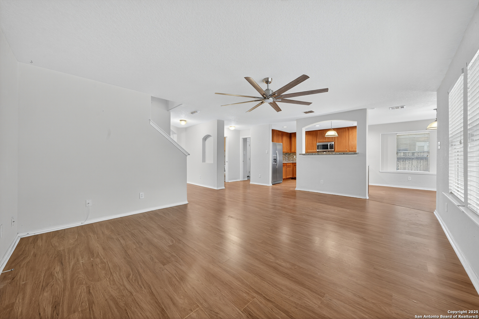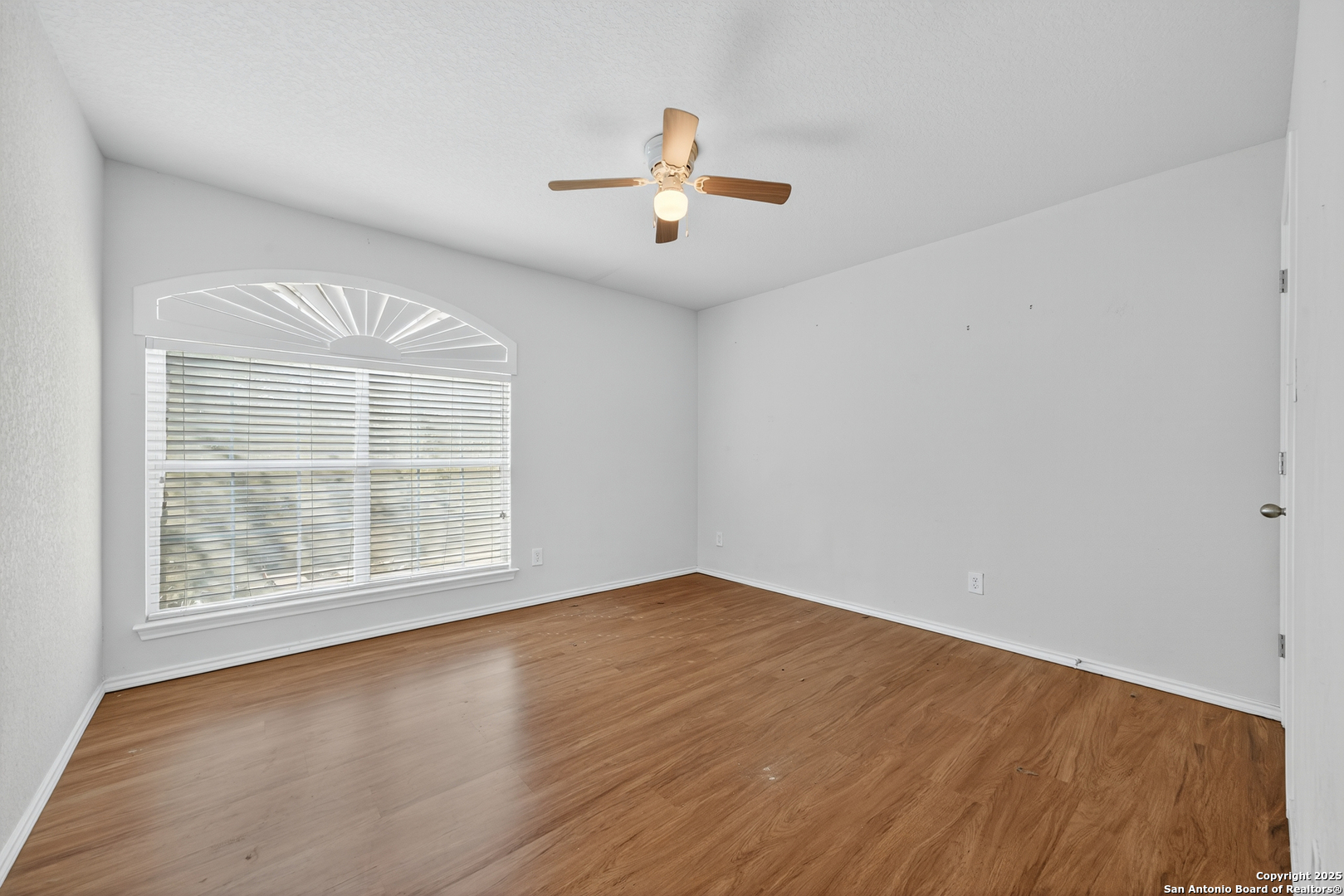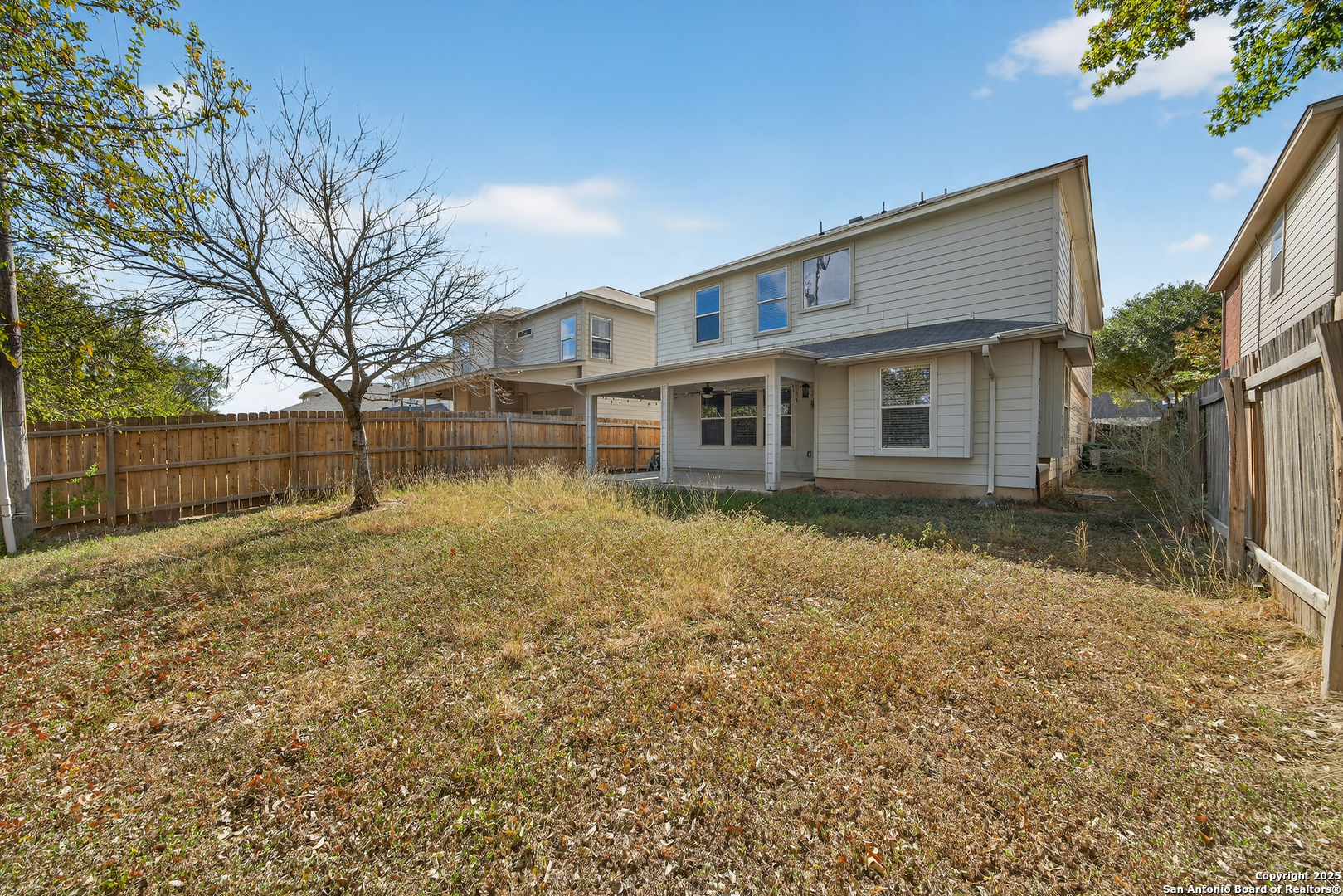 Beautifully updated 4-bedroom home in highly sought-after Laurel Canyon right at the Helotes line! Step into an open, airy layout with wood/laminate flooring throughout-no carpet anywhere. The kitchen features granite counters, stainless steel appliances, and a great breakfast-bar flow into the living area. All bedrooms are privately located upstairs along with a spacious game room perfect for movie nights, kids' space, or a second living area. The primary suite offers a true retreat with a large layout, separate garden tub and walk-in shower, and generous closet space. Out back, relax on the extended covered patio overlooking a peaceful greenbelt-ideal for quiet evenings or weekend BBQs. Neighborhood amenities include a pool, park, playground, covered swings, sand volleyball, basketball court, and community BBQ areas. Plus, you're minutes from Loop 1604, La Cantera, Helotes Marketplace, top dining, shopping, and entertainment. A fantastic Helotes-area find and we believe you will absolutely love it here!