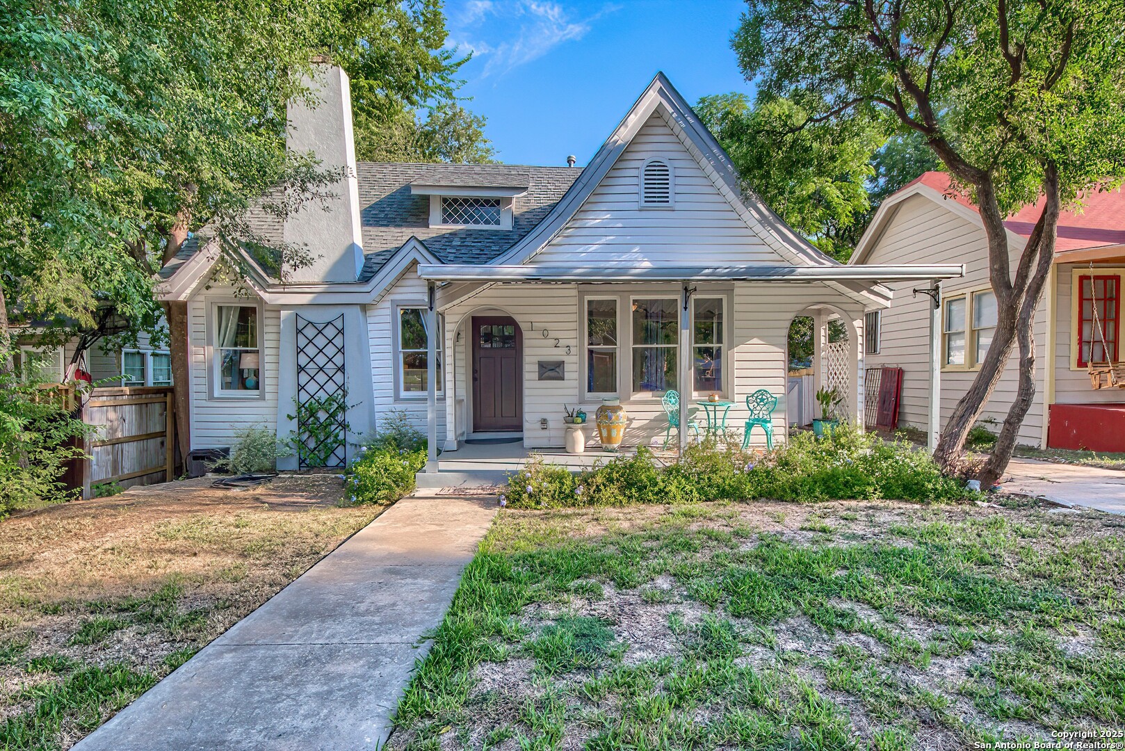 THIS IRRESISTIBLE TUDOR COTTAGE IN HISTORIC BEACON HILL WILL CHARM YOUR SOCKS OFF! Merely pulling up with give you a gasp as this doll literally calls to you from the street, so reminiscent of the peace of the English countryside and Jane Austen novels. Admire the sharply pitched roof and prominent chimney as you walk up to the adorable front porch where you can sit and watch the world go by. Step through the front door and find the past meets the present in a seamless mixture of historic elements and modern conveniences that adds up to a world full of character under high ceilings. Thick shiplap walls, painted in a soothing sage green, and natural shiplap ceilings with crown moulding resonate so that decorating them almost seems unnecessary. The fireplace sets a cozy atmosphere and large windows warm the living room with abundant natural light. Imagine long conversations with friends over dinner in the dusky blue dining room that sits strategically in the middle of the home, open to both living and the kitchen. Renovated so thoughtfully, the country kitchen invites you in with a beguiling warmth, making it the quintessential place for creativity and comfort. Light reflects off the new soft close white and blue shaker cabinetry and sleek marble countertops. Watch your favorite birds dance outside the window over the sink and cook with precision with your gas range as friends gather at the kitchen island to share a cocktail and chat. Lingering over coffee in the breakfast nook seems a given with its peaceful view of your very private backyard through french doors. The laundry closet is tucked off in a closet for convenience. On the other side of the home is the bedroom wing with the primary bedroom ready to surprise with walls of windows, two closets and an adjoining flex room with black and white mosaic tile, perfect for a classic sitting room, nursery, gym or office -- or should you want another bathroom plumbing under the home is already started to accommodate for that option. An adorable bathroom sits in the hallway another charming mix of historic and modern with bead board, chair rail accent and mosaic tile. Finally, be enchanted by the large front bedroom with its whimsical fabric wall cloth. Original hardwood floors throughout gleam with elegance and transition to ceramic tile in the kitchen. Now outside find more to love about this home -- a large deck, shaded by mature trees is elevated for a lovely view of the backyard, made even more private by a back alley. The level, fully fenced yard can be left alone as a lawn with decorative borders or get fancy add a pool, garden or playscape. A storage shed is ideal for lawn tools. The single car garage can be used for more storage, workshop or park a car, accessible through a driveway gate. Especially enjoy that the eastern fence was just replaced! Make note of the tankless water heater, water softener and stainless appliances. Now that you have found the perfect refuge, let's talk about how great this location is! Beacon Hill is one of the city's first neighborhoods and a designated Neighborhood Conservation District, which is evident as you drive the streets to admire the breadth of historical architecture and cozy neighborhood parks. Two blocks from famed restaurants and shops on Blanco and just a short walk to the mansions of Monte Vista, feel comfortably tucked into the heart of San Antonio while still being only a short bike ride or five minute drive to downtown, the Pearl, the Riverwalk, King William and Southtown. Commutes elsewhere are easy being so close to I-10 and a straight shot to 281 through neighborhoods. If you have dreamed urban living in a historic home that is still affordable, you have found it here. Bring a copy of Pride and Prejudice, sit on the porch and imagine staying forever!
