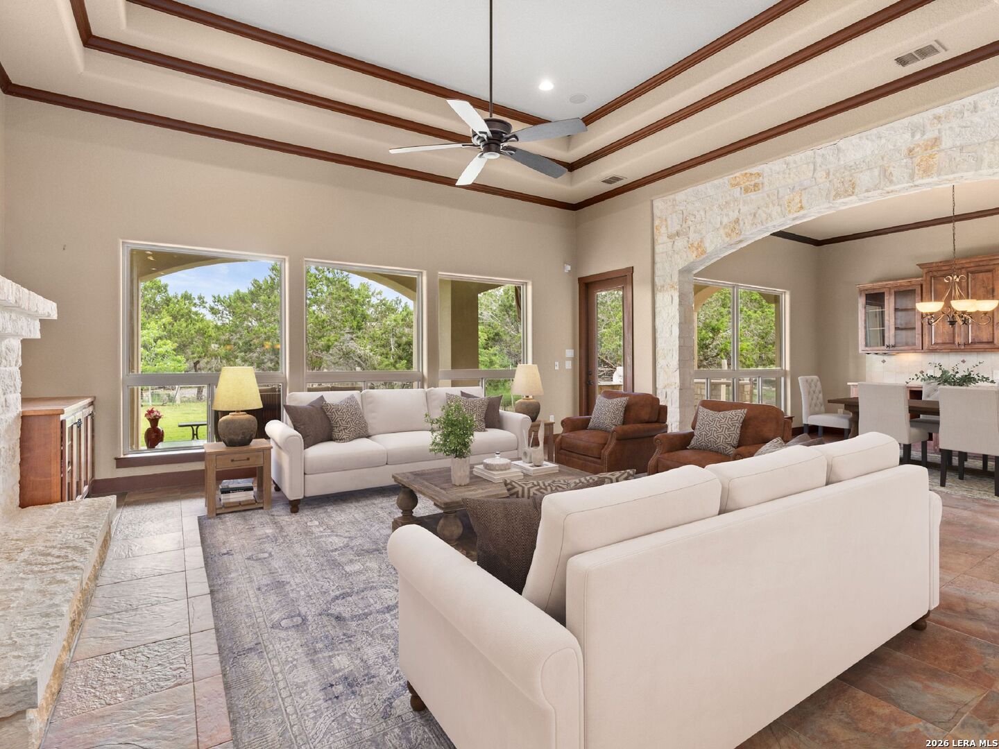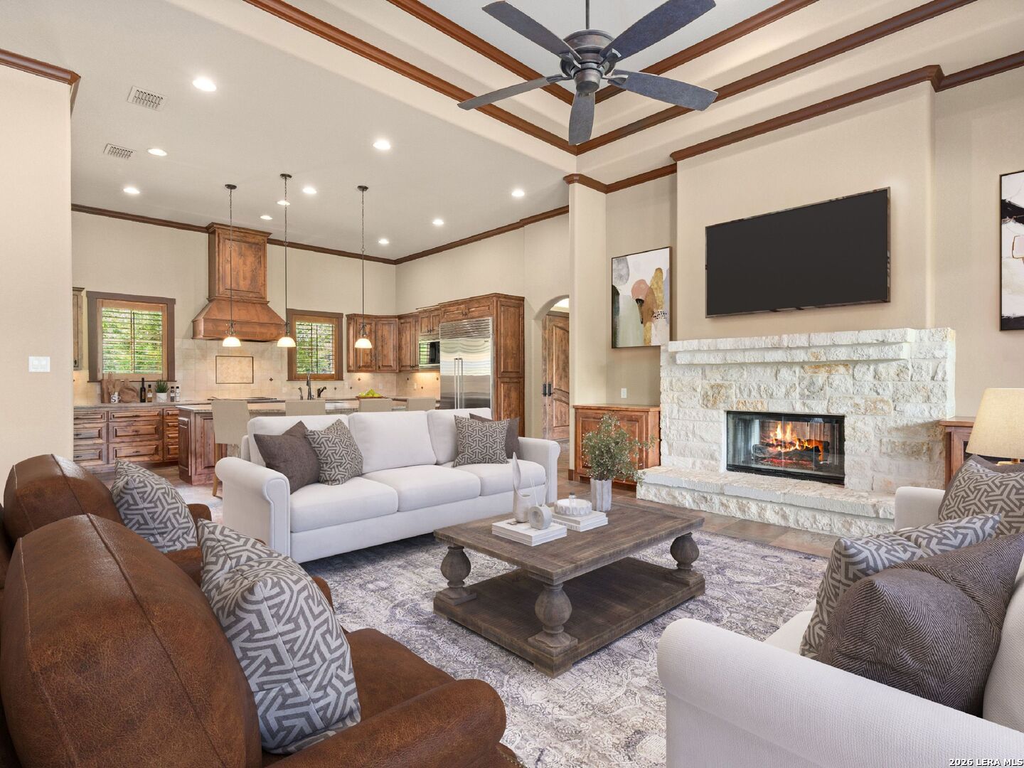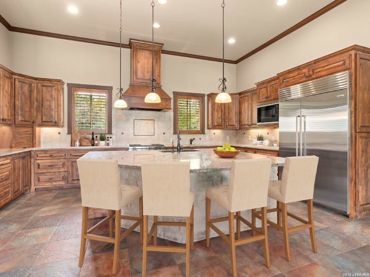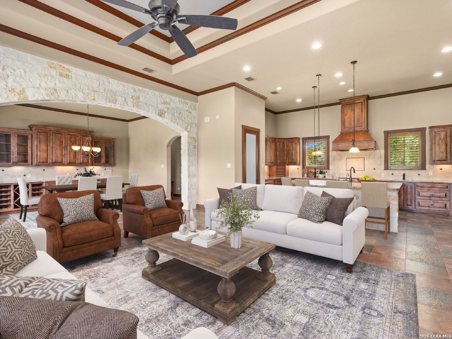 PRICE REDUCED. Nestled in the Heart of The Texas Hill Country, this Paul Allen Custom Built single-level residence offers unmatched privacy and refined elegance. Blending timeless architecture with modern amenities, this custom built beauty is a true sanctuary just minutes from the charming city of Boerne and a short drive to San Antonio. The gourmet kitchen features a massive island, top-of-the-line appliances including a Wolf gas cooktop/stove. More fabulous details include an Insta Hot on kitchen sink, giant pet shower in the laundry room, and two-way fireplace from living room to study. Gorgeous Alder wood throughout with multiple built-ins including dining room wine fridge and wine racks. The home was built with an oversized propane tank, septic system and A/C unit! Outside entertainer's kitchen with covered patio and views galore. The generous three car garage provides ample space and extra storage- a huge plus!, wiring to put in a front gate if desired. The superior Cordillera Ranch Amenity Center and Golf Course include club house, pool, tennis courts, park/playground, jogging and bike trails, lake/river park, bridle path, waterfront access. 24 Hour guarded access.