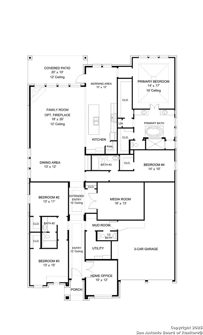 Welcoming entry framed by home office with French doors. Extended entry flows past a media room with French door entry. Open dining room flows into the family room with a wood mantel fireplace and sliding glass door. Island kitchen features a corner walk-in pantry, 5-burner gas cooktop and extends to the morning area. Secluded primary suite with wall of windows. Primary bathroom offers a French door entry with dual vanities, freestanding tub, separate glass enclosed shower, a linen closet and two walk-in closets. Secondary bedrooms with walk-in closets. Two full bathrooms and a half bathroom complete this design. Covered backyard patio and 6-zone sprinkler system. Utility room and mud room just off the three-car garage.