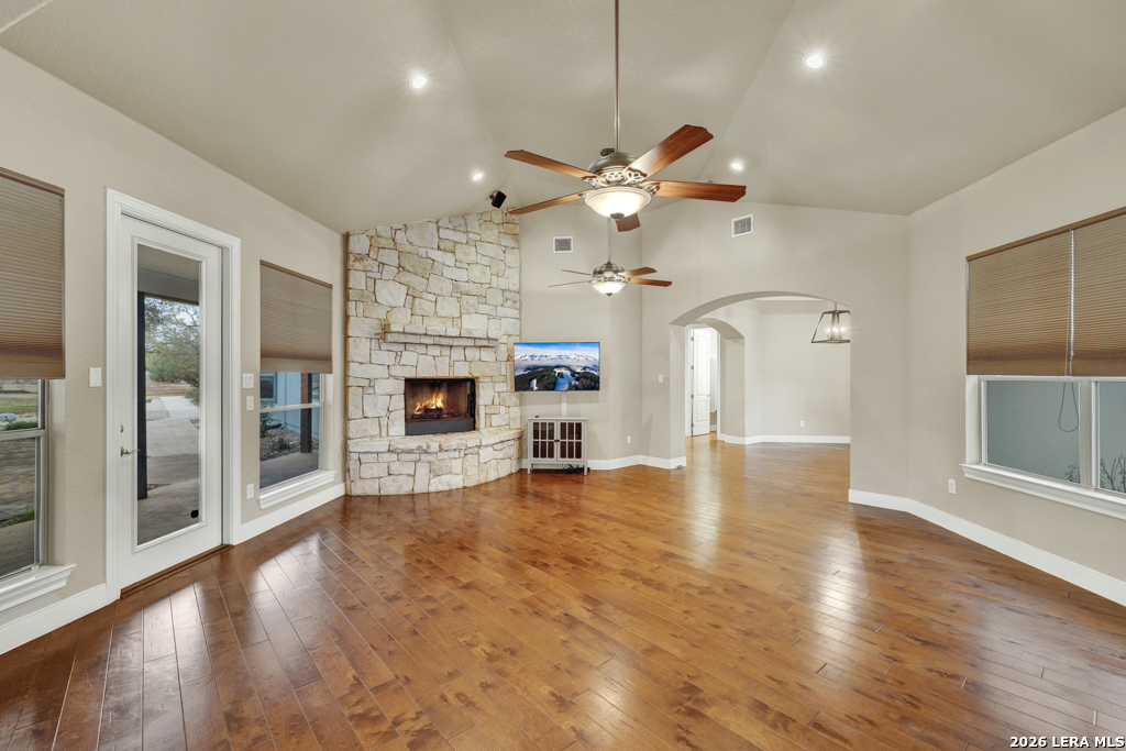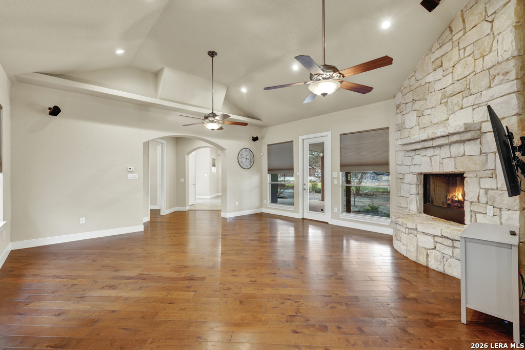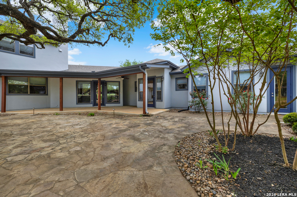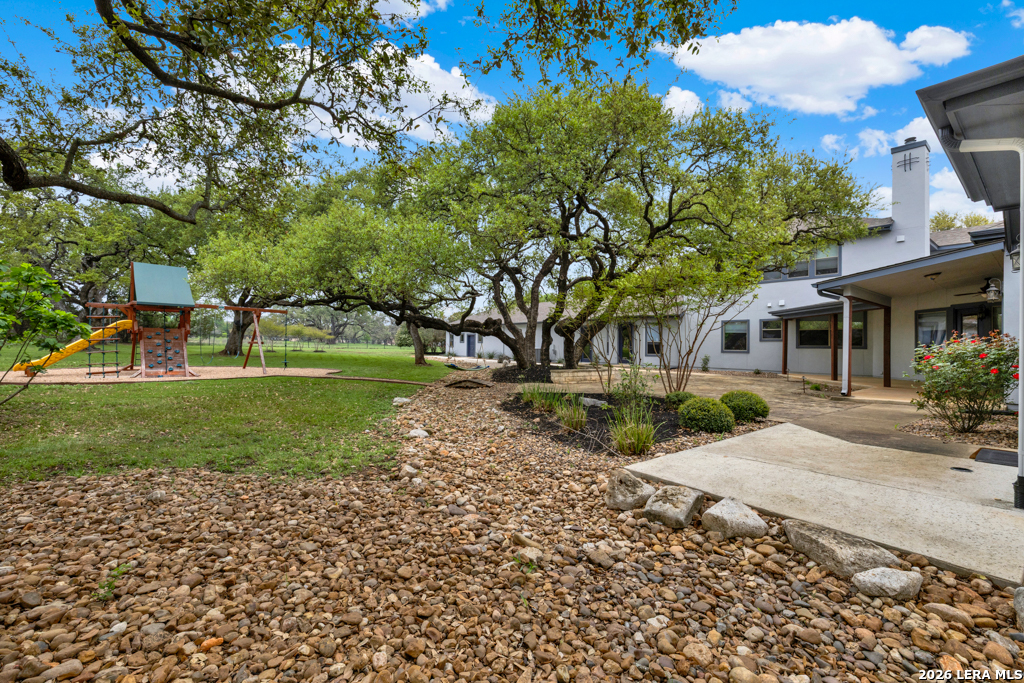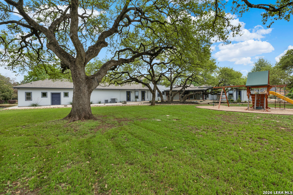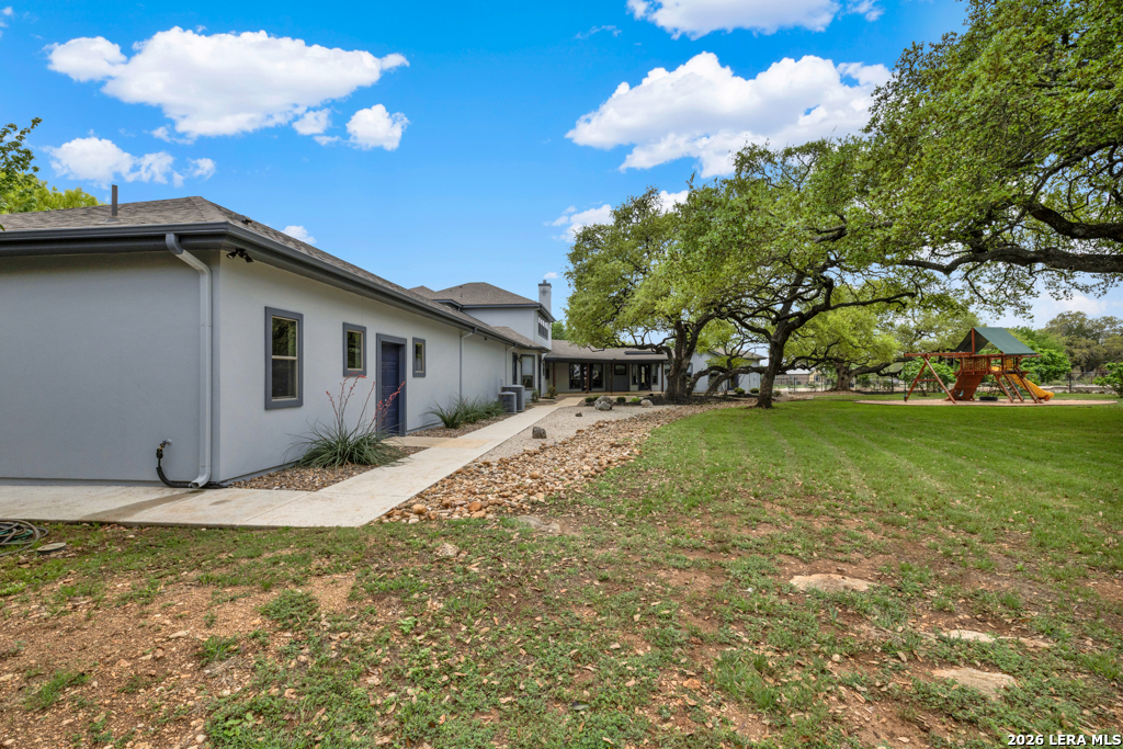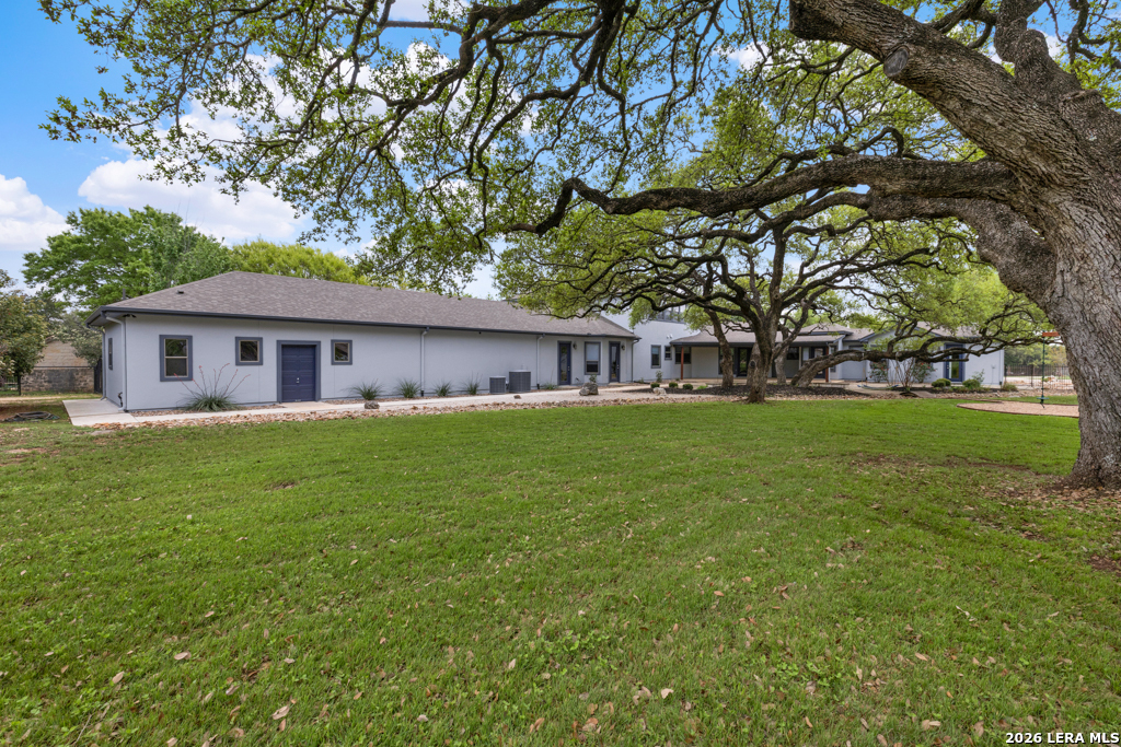 A beautifully designed custom home tucked beneath mature oak trees on a spacious 1.24-acre lot in the sought-after Rockwall Ranch community of New Braunfels. With 4,752 square feet of thoughtfully planned living space, this home offers room to grow, entertain, and relax-all in one place. Inside, the open layout showcases rich wood flooring, tile in wet areas, elegant crown molding, and a stunning floor-to-ceiling stone fireplace as the heart of the living area. The island kitchen is a true centerpiece, featuring granite countertops, stainless steel appliances, a raised dishwasher for added comfort, a prep sink, breakfast bar, and a generous 136 walk-in pantry. Whether you're hosting guests or making quiet family meals, this space is ready to handle it all. The primary suite is a peaceful retreat with a beach-entry shower, dual vanities, and a spacious walk-in closet. With eight total bedrooms-including a separate guest suite on the main floor-and four flexible bonus rooms, you'll have plenty of options for offices, hobby spaces, a gym, or additional bedrooms to fit your lifestyle. Upstairs, enjoy a large 3017 game room with a wet bar-perfect for movie nights, games, or entertaining. The oversized four-car pass-through garage includes its own air-conditioned half bath, which makes for a perfect future pool bath or workshop restroom. Recent upgrades include a new roof in 2022, fresh landscaping, and exterior paint. A central vacuum system, covered patio for outdoor gatherings, and appliances that convey round out this home's long list of thoughtful features. Located in the Comal County School District, this home blends comfort, space, and flexibility in one of the area's most desirable neighborhoods.