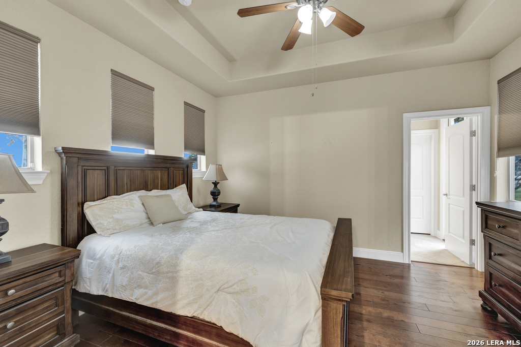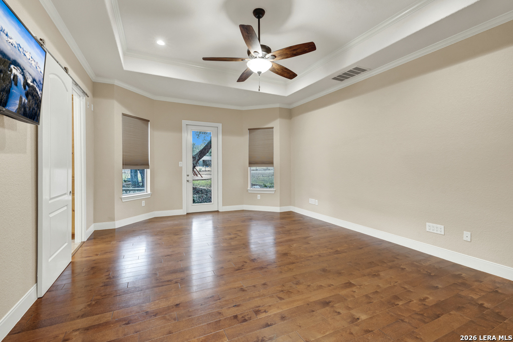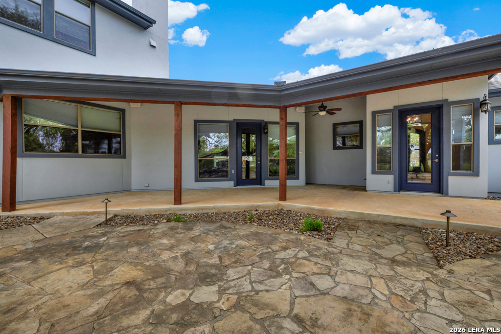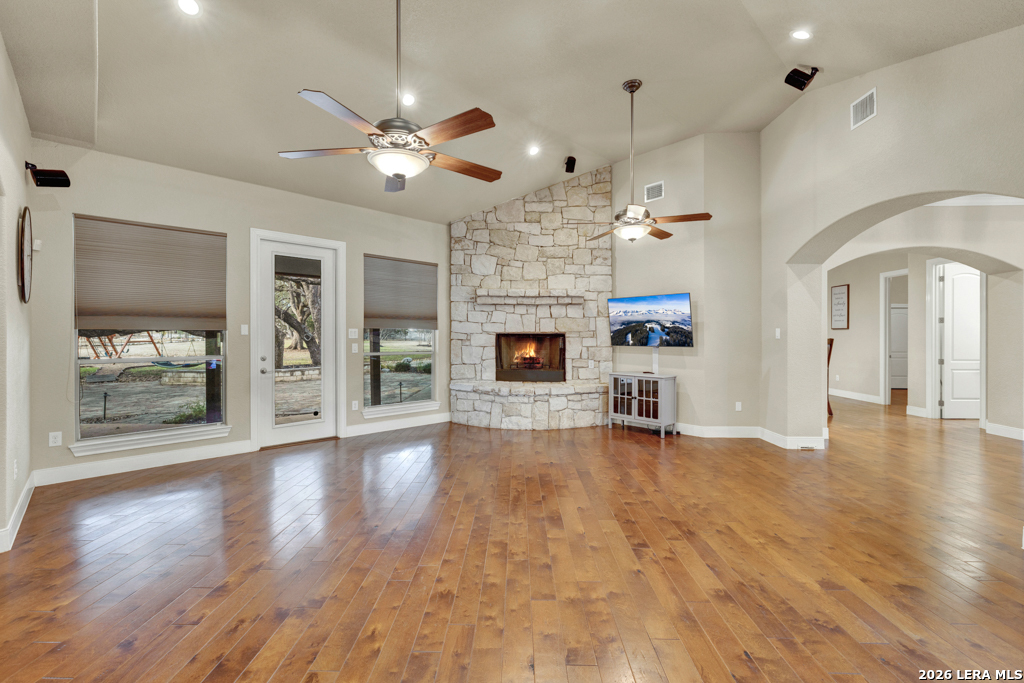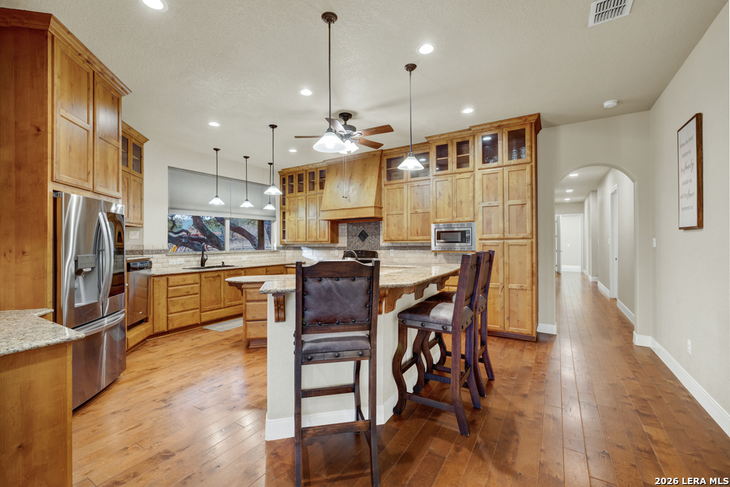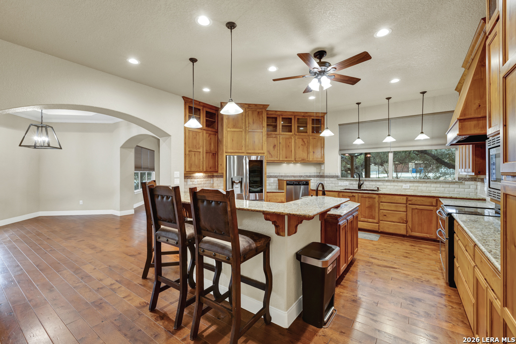 A beautifully designed custom home tucked beneath mature oak trees on a spacious 1.24-acre lot in the sought-after Rockwall Ranch community of New Braunfels. With 4,752 square feet of thoughtfully planned living space, this home offers room to grow, entertain, and relax-all in one place. Inside, the open layout showcases rich wood flooring, tile in wet areas, elegant crown molding, and a stunning floor-to-ceiling stone fireplace as the heart of the living area. The island kitchen is a true centerpiece, featuring granite countertops, stainless steel appliances, a raised dishwasher for added comfort, a prep sink, breakfast bar, and a generous 136 walk-in pantry. Whether you're hosting guests or making quiet family meals, this space is ready to handle it all. The primary suite is a peaceful retreat with a beach-entry shower, dual vanities, and a spacious walk-in closet. With eight total bedrooms-including a separate guest suite on the main floor-and four flexible bonus rooms, you'll have plenty of options for offices, hobby spaces, a gym, or additional bedrooms to fit your lifestyle. Upstairs, enjoy a large 3017 game room with a wet bar-perfect for movie nights, games, or entertaining. The oversized four-car pass-through garage includes its own air-conditioned half bath, which makes for a perfect future pool bath or workshop restroom. Recent upgrades include a new roof in 2022, fresh landscaping, and exterior paint. A central vacuum system, covered patio for outdoor gatherings, and appliances that convey round out this home's long list of thoughtful features. Located in the Comal County School District, this home blends comfort, space, and flexibility in one of the area's most desirable neighborhoods.