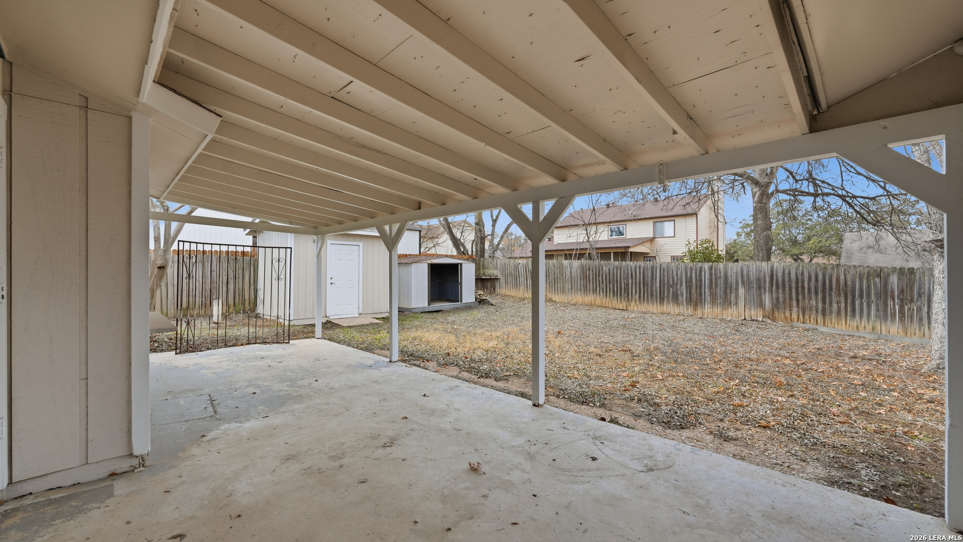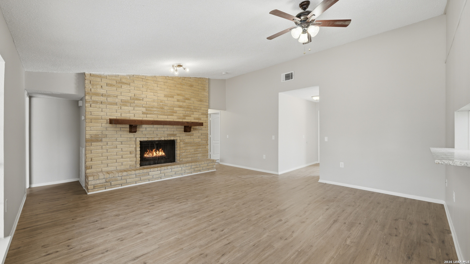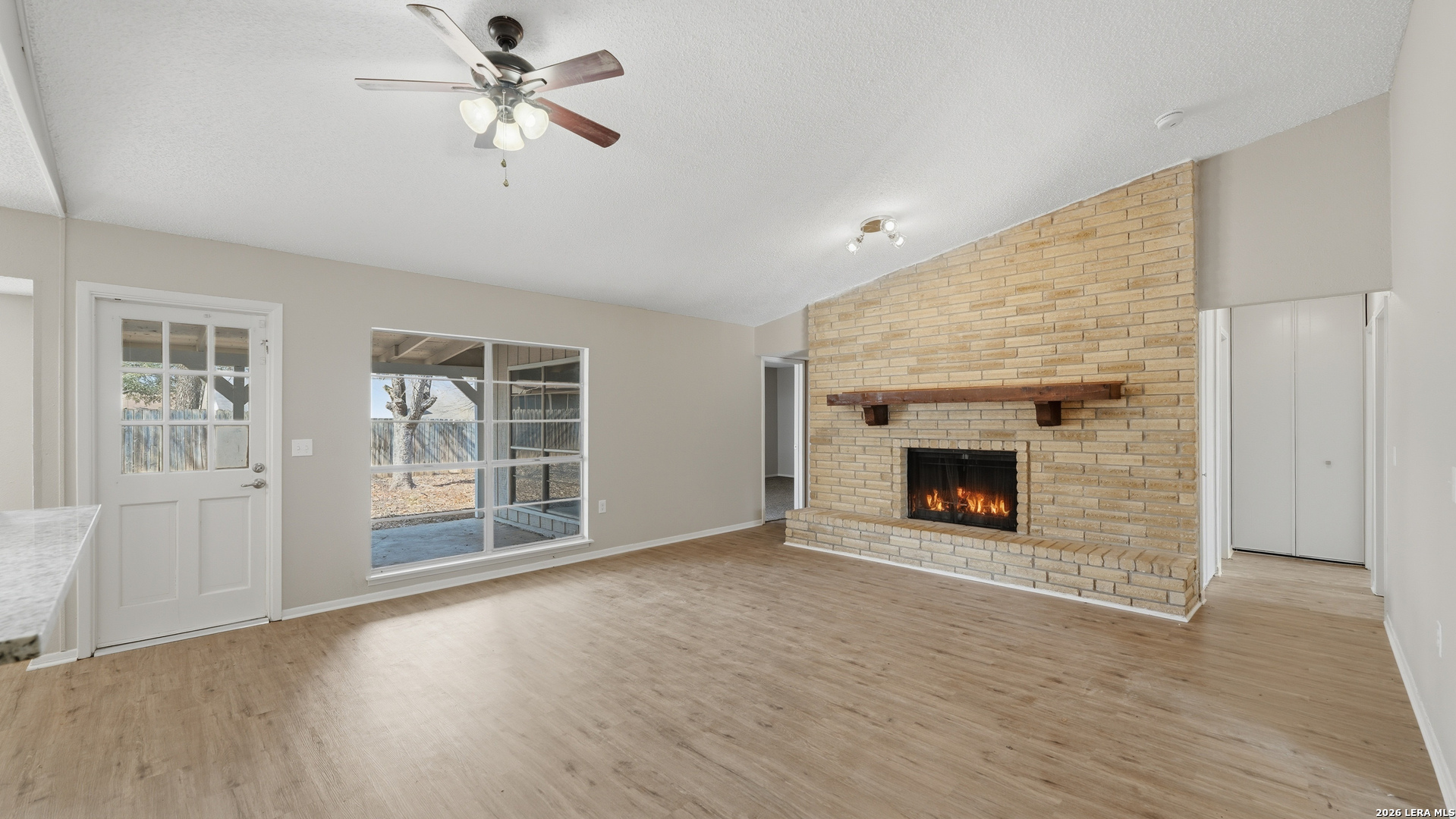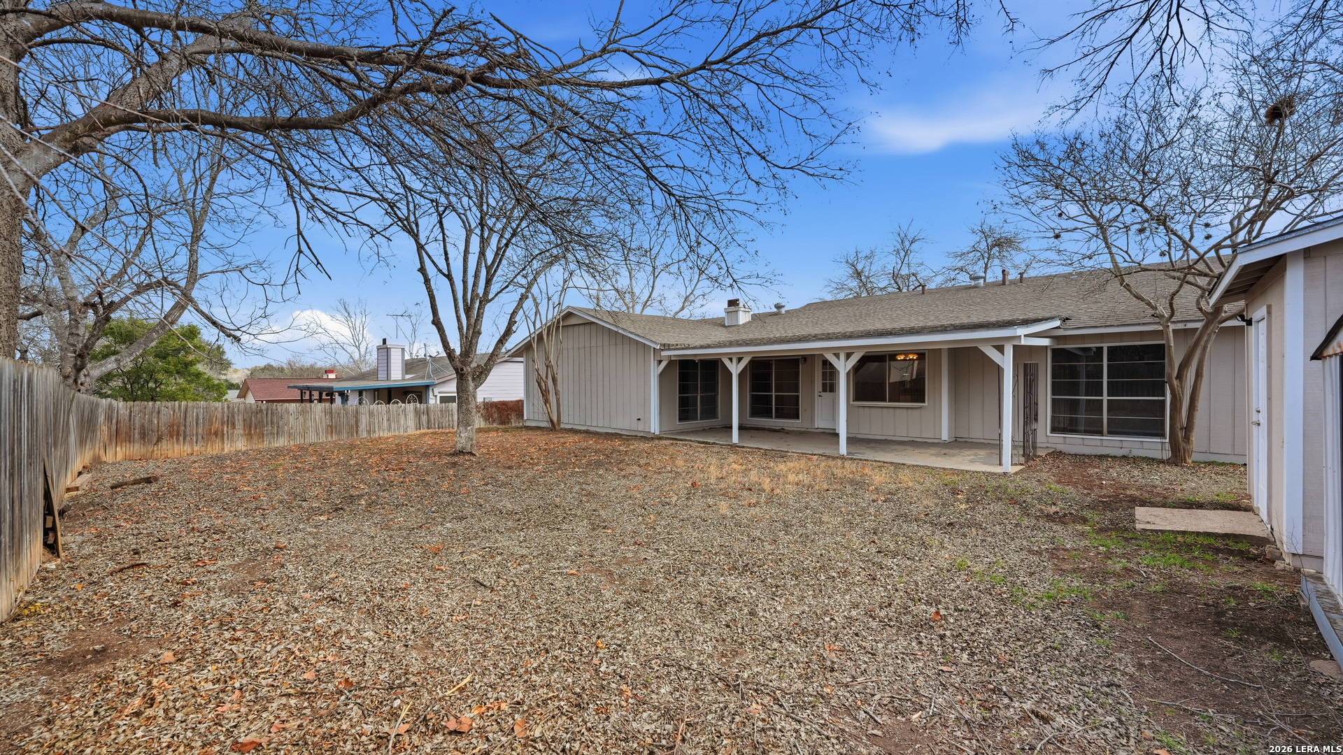 Charming one story home offering thoughtful updates and timeless character in the established Cimarron neighborhood. The inviting living area features a cozy brick fireplace and vaulted ceilings that enhance the sense of space and natural light. Fresh interior paint and recently installed floors throughout provide a clean, cohesive look. The split floor plan offers functional separation between the primary suite and secondary bedrooms. The kitchen has been updated and opens comfortably to the main living space, creating an ideal layout for everyday living and entertaining. Recent exterior paint adds to the home's curb appeal. The spacious backyard includes mature trees, a covered patio for outdoor enjoyment, and storage sheds for added convenience. Conveniently located near schools, shopping, dining, and Randolph AFB, this property offers accessibility while being tucked into a well established neighborhood.