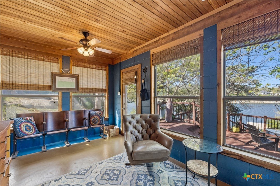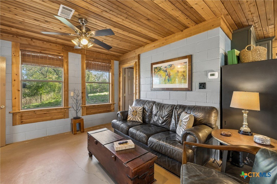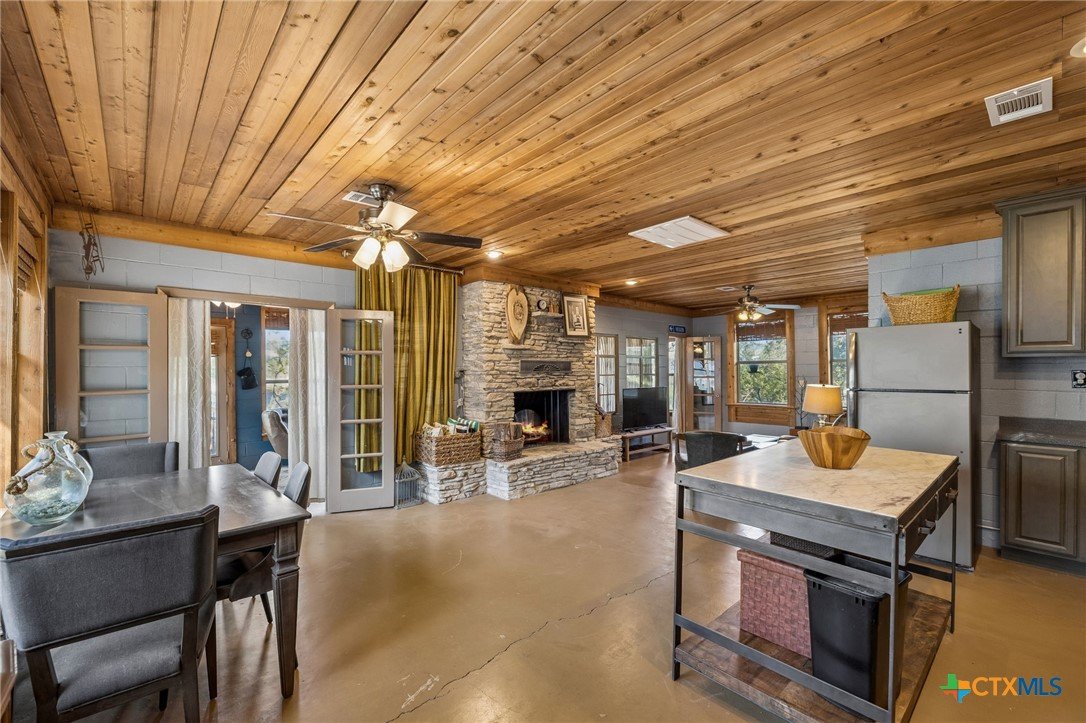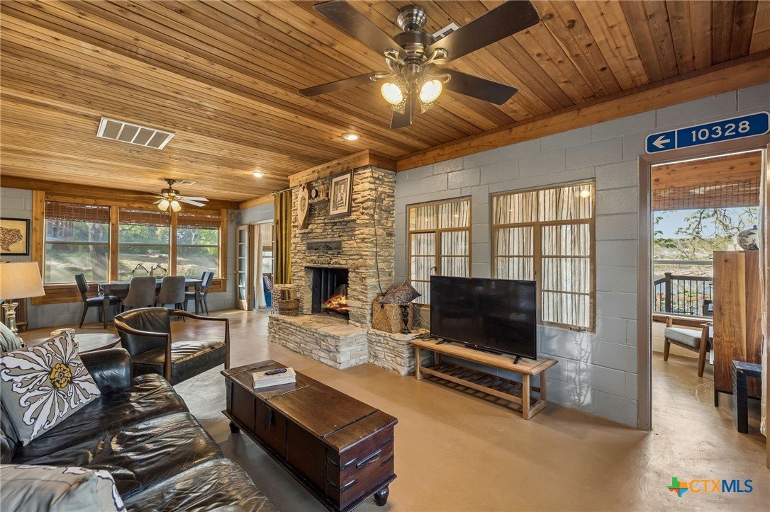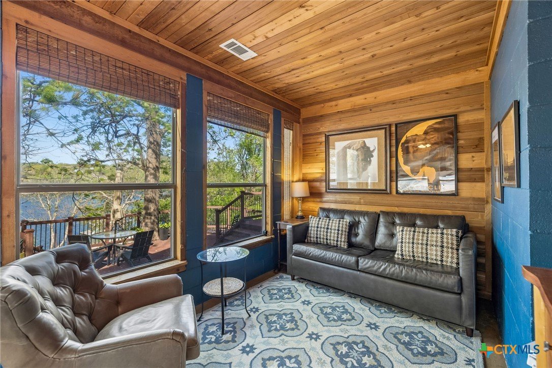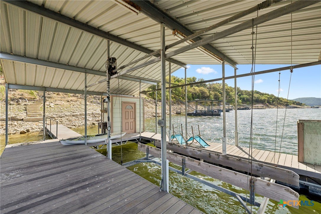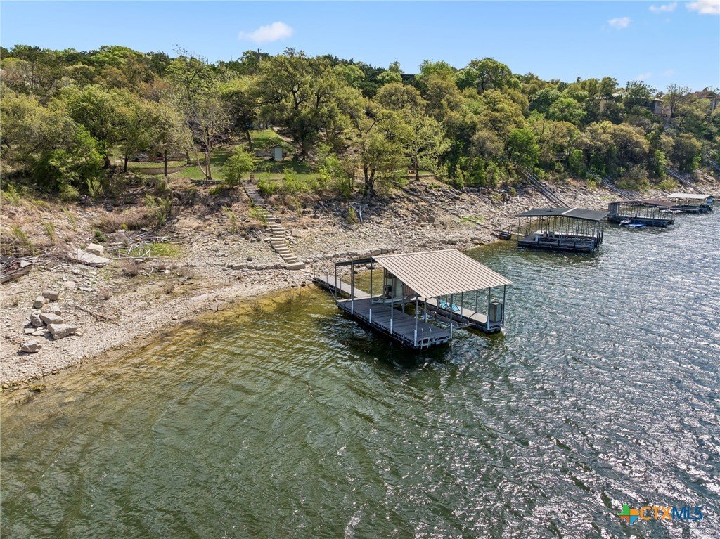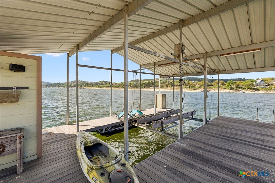 Rustic Lake Travis waterfront cabin with 150’ of shoreline, covered floating dock and 1.5 acres. This updated 1960s fishing cabin blends original character with a setting designed for enjoying the outdoors. The property features a large shaded deck facing the lake, substantial stone outdoor fireplace, and separate stone grilling area with panoramic lake views. A covered floating dock makes boating, fishing, and swimming simple, while multiple storage sheds—including one on the dock—provide space for gear and equipment. Inside, the home offers a lodge-style feel with rough-hewn wood trim, abundant windows, and a decorative stone fireplace. Sleeping areas face the lake, bringing natural light and water views into daily living. The lot provides flexibility for future plans, making this an ideal weekend retreat, guest quarters, or foundation for building a new home higher on the property. A wooded reserve across the street adds privacy and attracts local wildlife, creating a peaceful setting just minutes from Cedar Park shopping and dining. Voluntary HOA membership provides access to lakefront amenities, including a boat ramp. Water access. Outdoor living. Future potential.