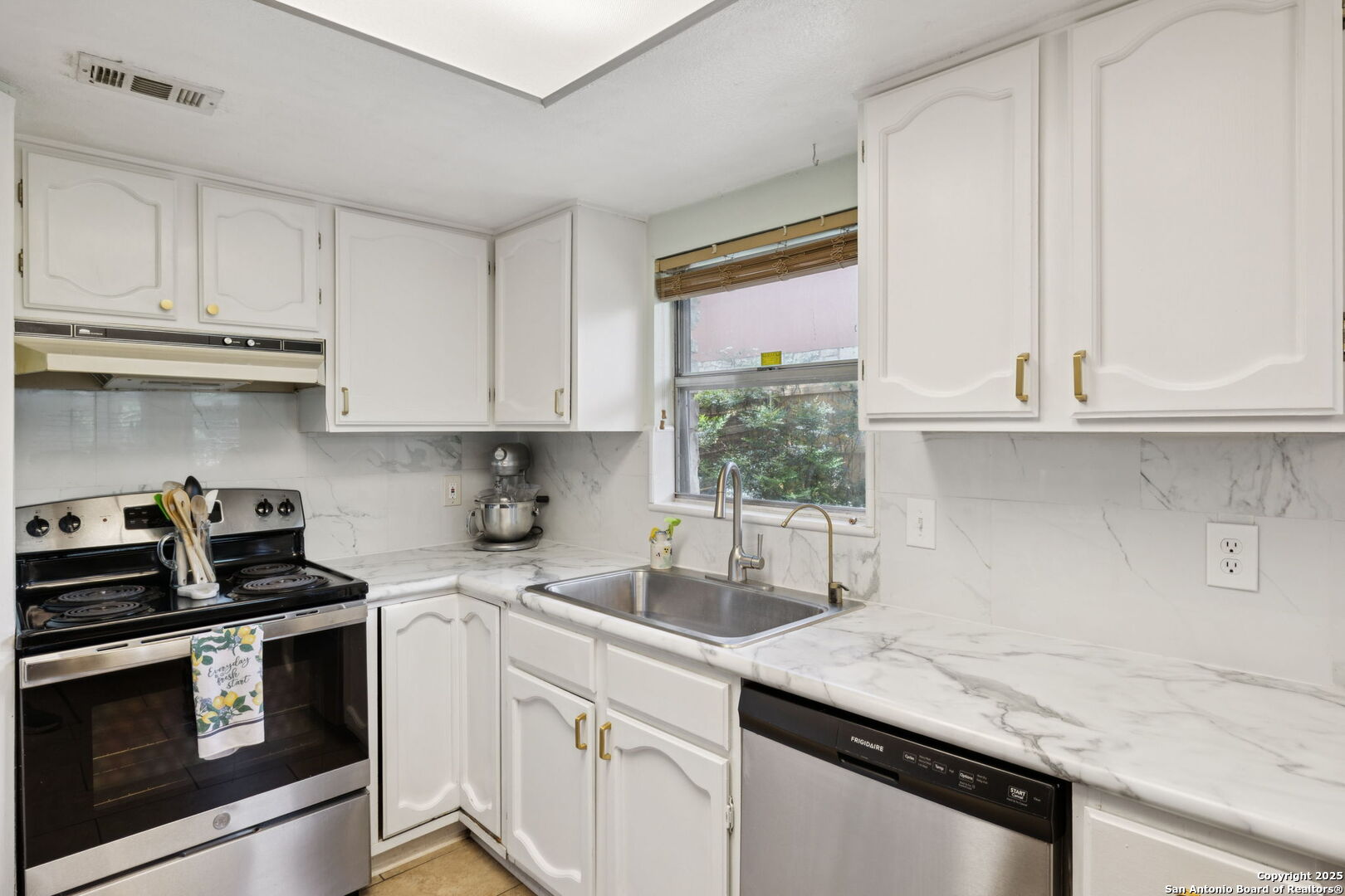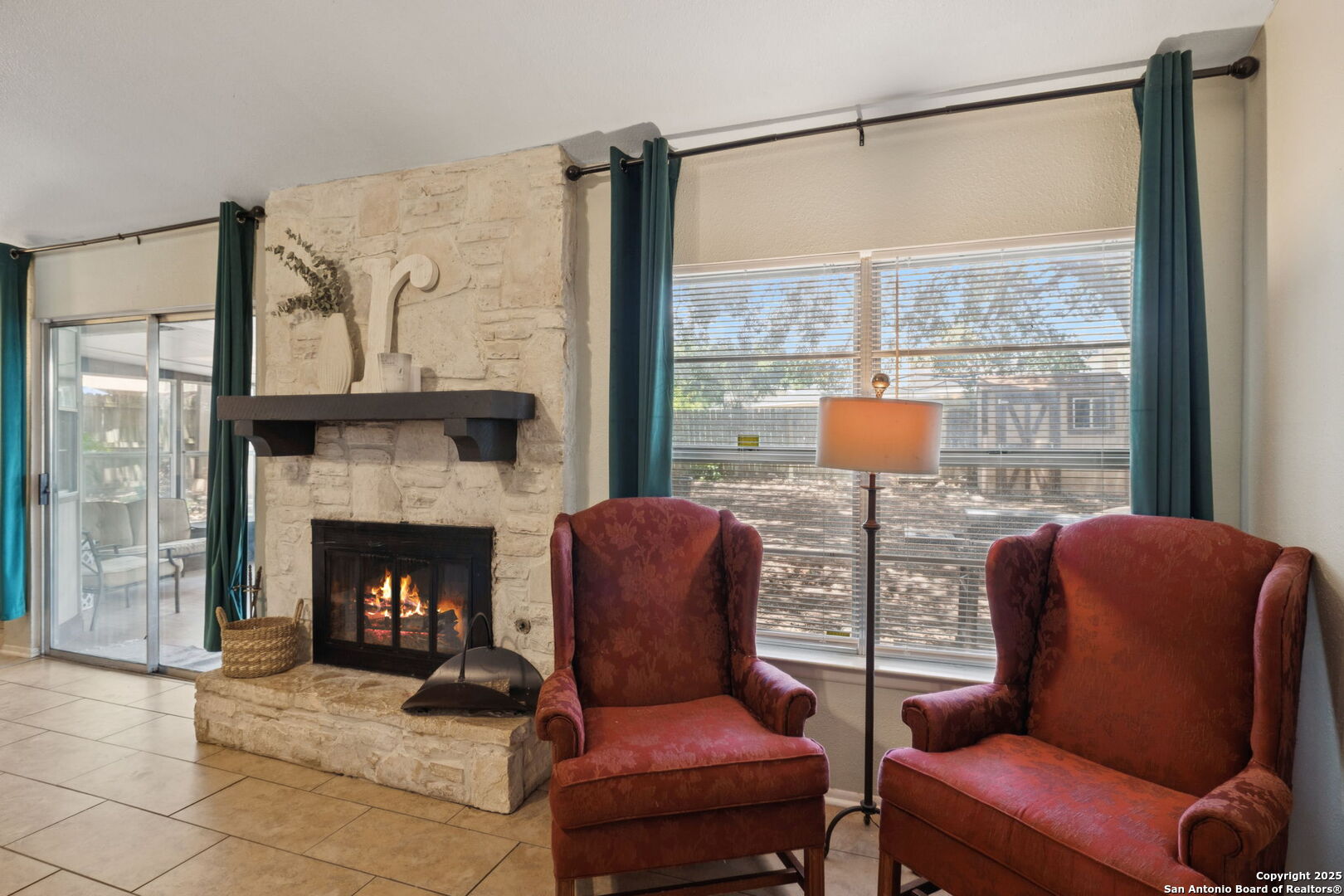 Tastefully upgraded and well-maintained home with a charming stone exterior and spacious interior. The interior boasts a fully remodeled kitchen with Carrera-look counters, white cabinetry, and gold hardware. Both the primary and secondary bathrooms have been tastefully remodeled. Features include an entry with a mudroom nook, a spacious living area with a high ceiling, and a wood-burning fireplace with a stone surround. The oversized primary suite offers dual sinks, walk-in closets, and a private water closet. Two secondary bedrooms and a secondary bathroom complete the private spaces. An enclosed patio provides year-round enjoyment, and the backyard has two storage buildings. This home offers classic appeal with modern upgrades for comfortable living. Recent upgrades include a new roof (2024), water heater (2023), water softener (2022), and HVAC condenser/components (2025).