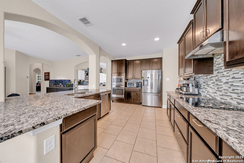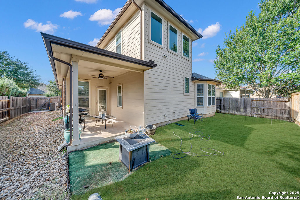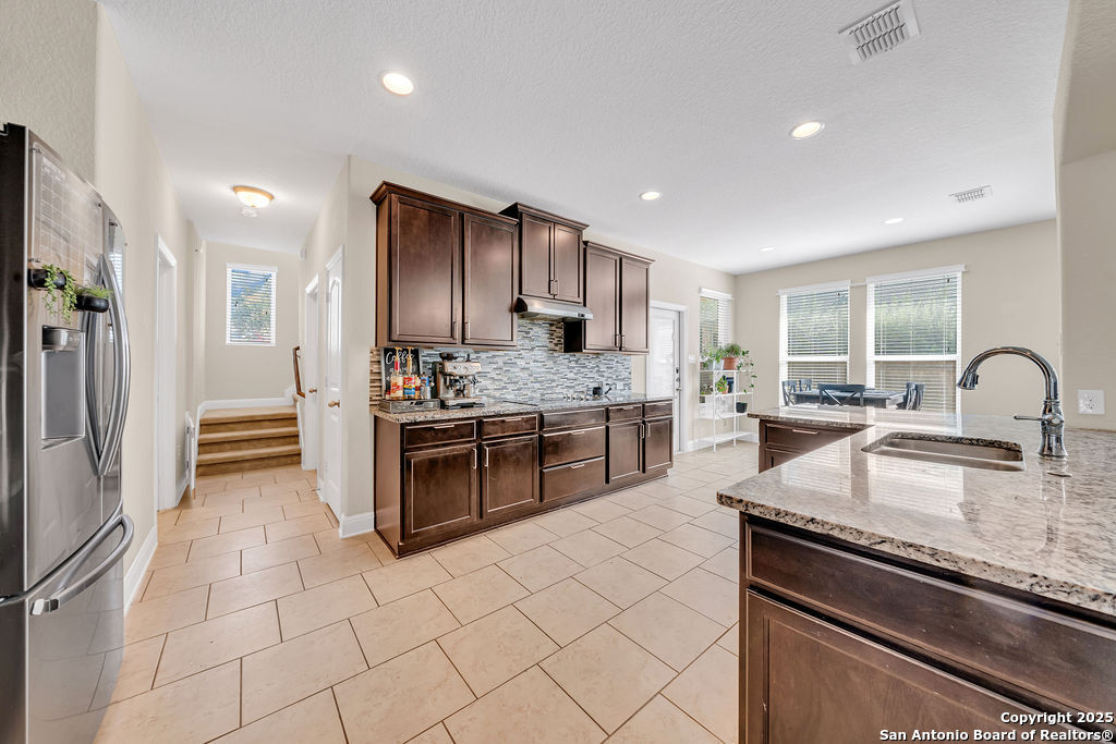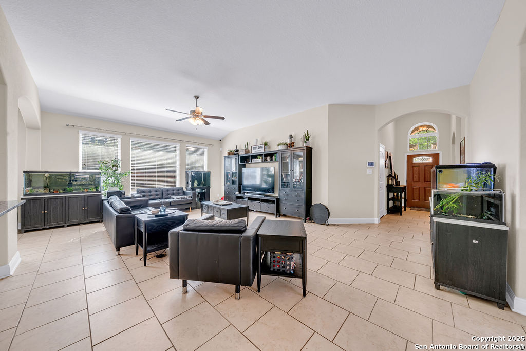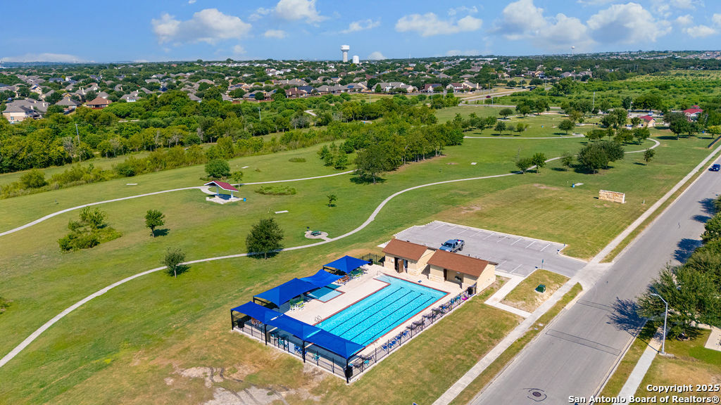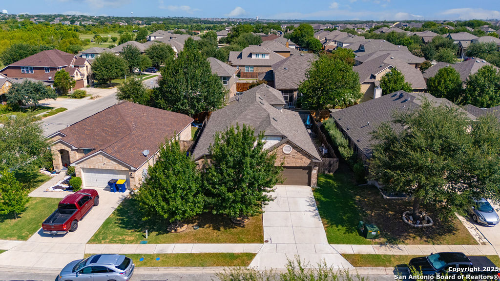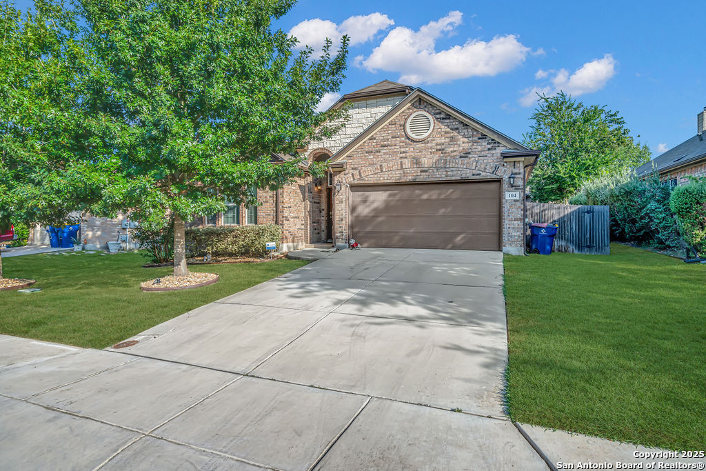 Welcome to your dream home in the sought-after Buffalo Crossing neighborhood! This beautifully maintained 4-bedroom, 3-bathroom residence features a spacious open floor plan with soaring high ceilings, a grand entryway, and abundant natural light streaming through expansive energy-efficient windows. The chef's kitchen is the heart of the home, boasting upgraded granite countertops, a large breakfast bar, stainless steel appliances, and a generous pantry-perfect for all your cooking and entertaining needs. Enjoy multiple dining areas, ideal for hosting family gatherings or dinner parties. The luxurious primary suite is a private retreat with a spa-like bathroom, providing the ultimate space to unwind. Designed for flexibility, this single-story layout also offers a bonus room or 4th bedroom with a full bath upstairs-perfect as a guest suite, home office, or media room. Step outside to enjoy outdoor living on your covered porch overlooking a lush backyard with a sprinkler system for low-maintenance landscaping. Located in a prime location near Randolph Air Force Base, this home offers an easy commute and quick access to shopping, dining, and top-rated schools.