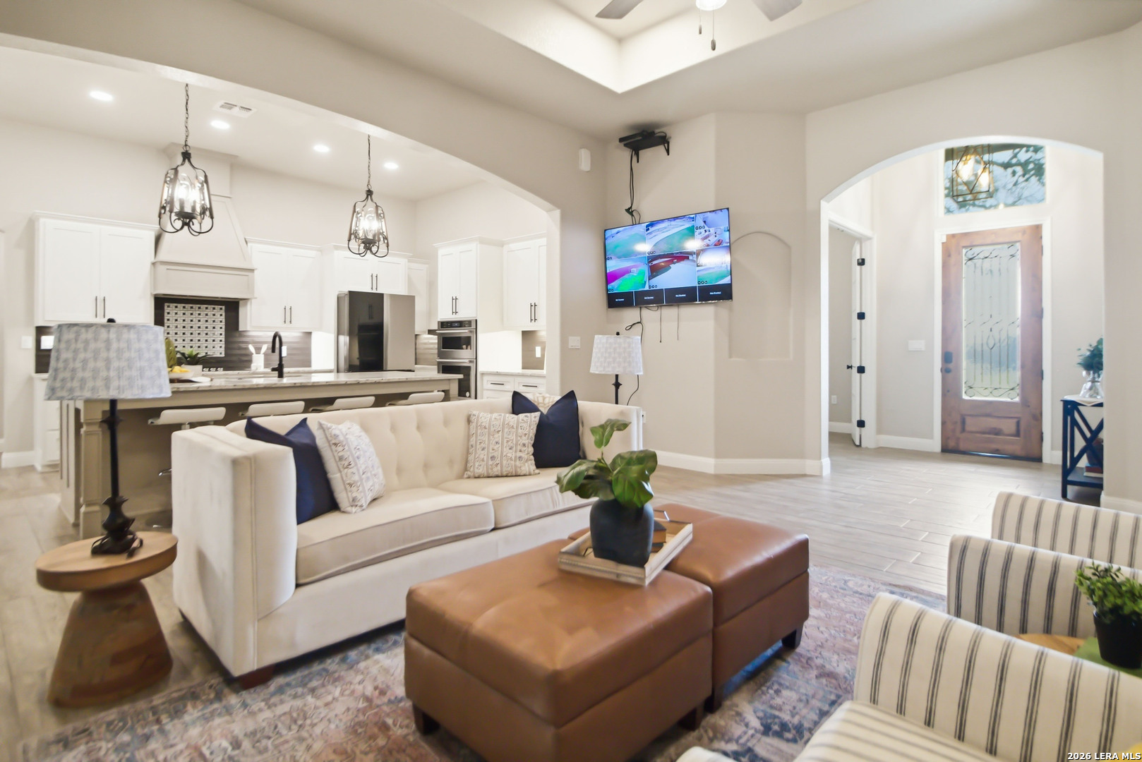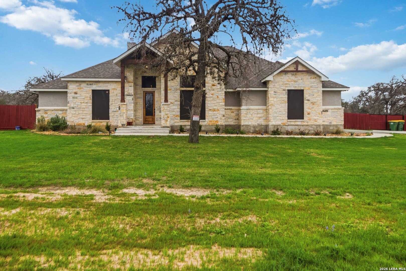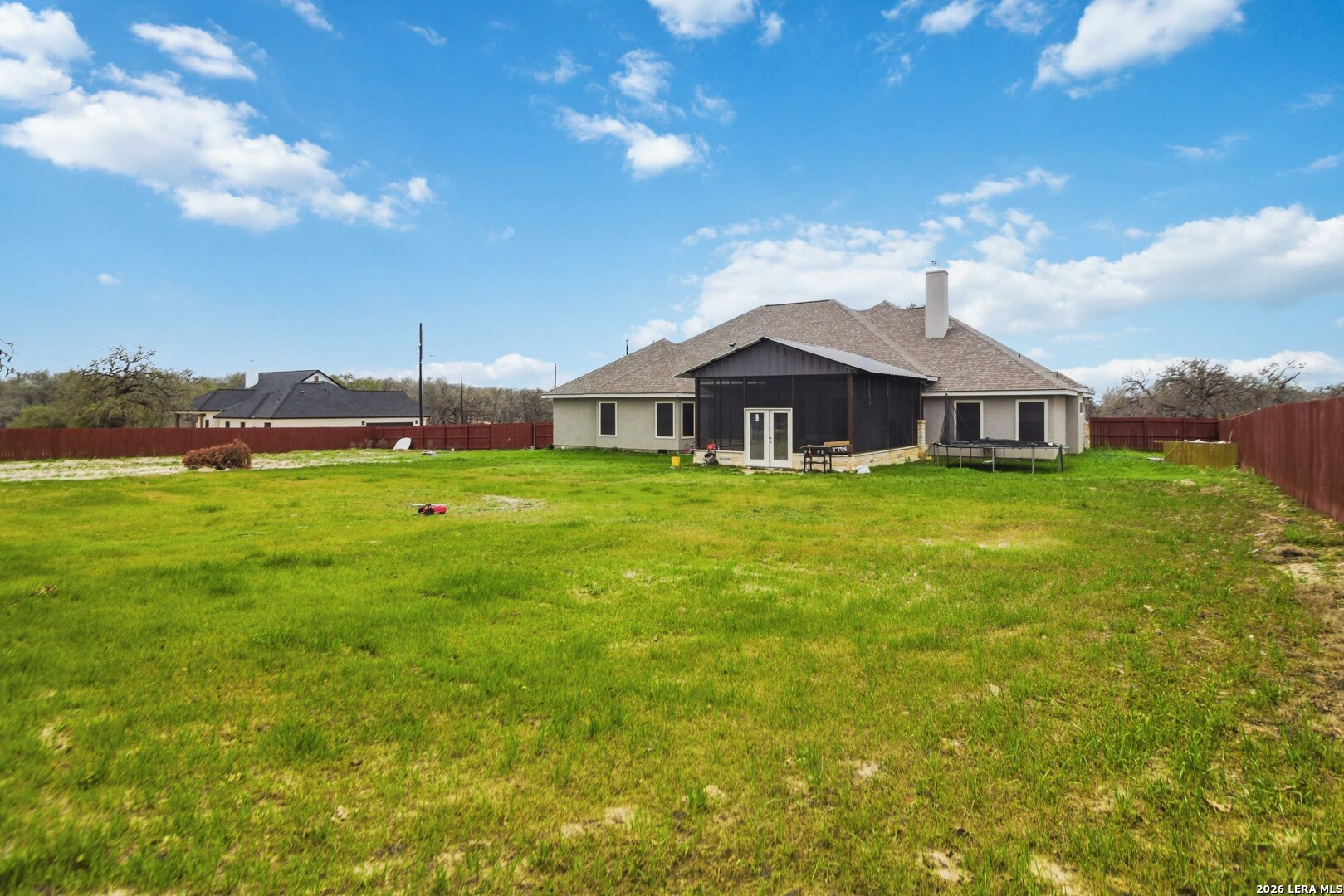 Welcome to the perfect blend of modern comfort and peaceful country living. Situated on a fully fenced 1-acre lot, this beautiful new home offers space, privacy, and the kind of sunsets you'll want to enjoy every evening from the fully screened-in back porch. Inside, the open and inviting floor plan features 4 spacious bedrooms plus a private office with elegant French doors-ideal for working from home or creating a quiet flex space. The kitchen is designed to be the heart of the home, featuring custom cabinetry, granite countertops, a large pantry, and a brand-new refrigerator. The primary suite offers a true owner's retreat with two walk-in closets and a spa-like bath complete with a soaking tub, separate shower, and double vanity. Three additional bedrooms provide flexibility for family, guests, or hobbies, with select wall-mounted TVs conveying with the home. Additional highlights include a fully wired security system with multiple exterior cameras, a Ring doorbell, and the added benefit of no city taxes. Located in La Vernia Independent School District, this property delivers the space buyers want with the features they need.