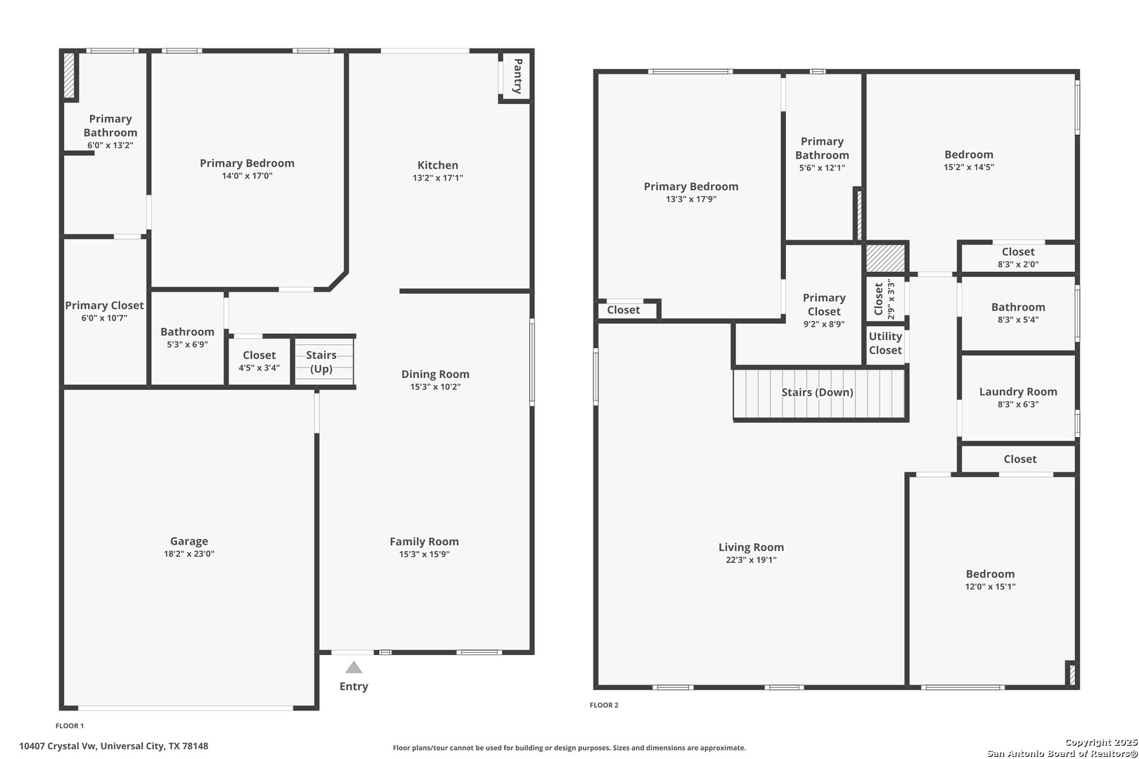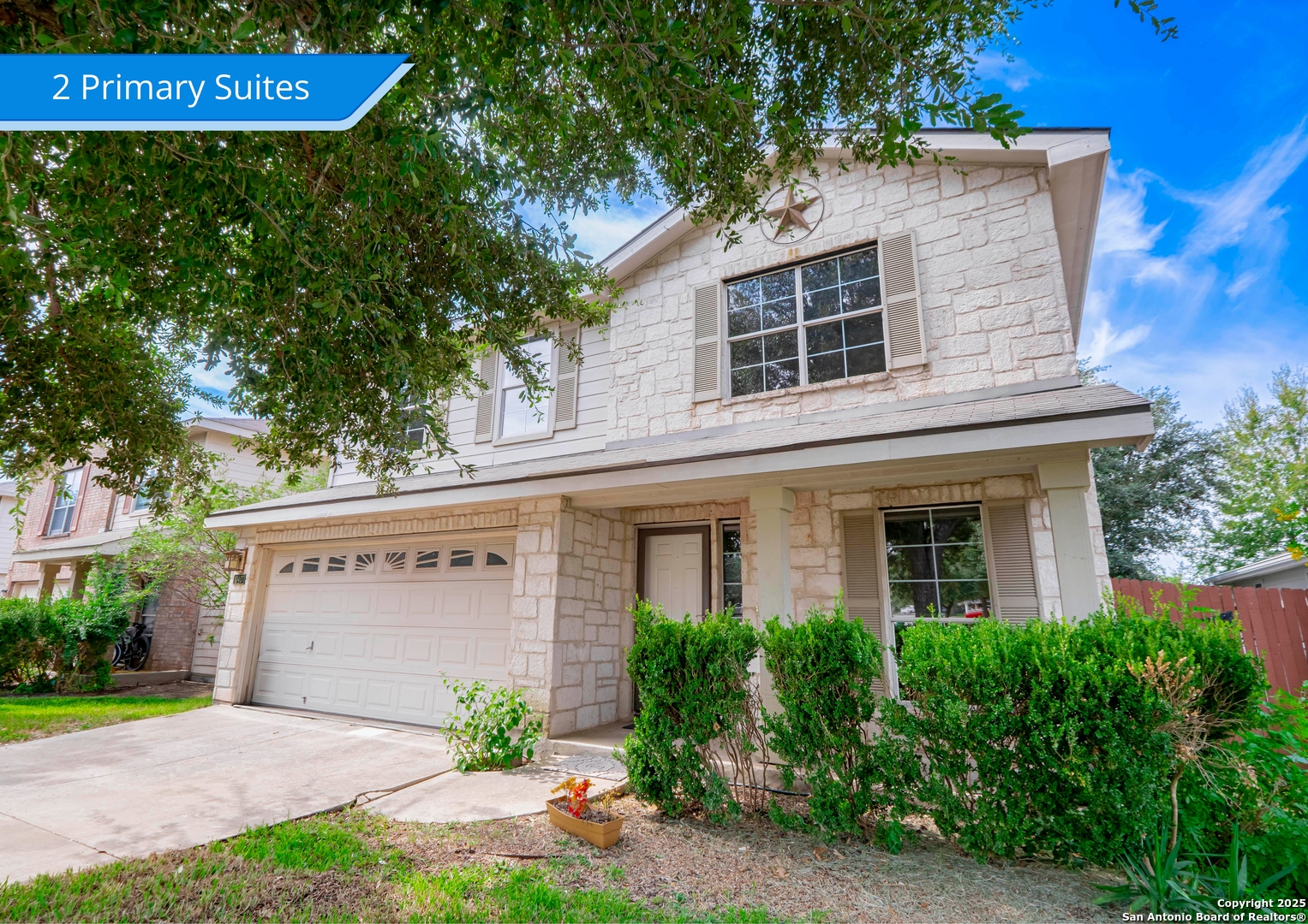 2 Primary Suites + Recent Upgrades in a Gated Community. This 4-bedroom, 3.5-bath home in Universal City offers 2,675 sq. ft. of living space with two primary suites - one downstairs and one upstairs, each with walk-in closets and ensuite baths. Built in 2005, it's move-in ready with numerous updates, including a new A/C (2025), newer carpet (2024), dishwasher, oven, microwave (2024), a 7-year-old roof, new breaker box, radiant barrier, and tinted windows for energy efficiency. A foundation repair with warranty provides peace of mind. The first floor features a spacious family room that flows seamlessly into the dining area and an open kitchen with a pantry, perfect for gatherings. The downstairs primary suite offers convenience and privacy, while an additional half bath accommodates guests. Upstairs, you'll find a second oversized living area that can serve as a game room or media space, two additional bedrooms, and the second primary suite. The thoughtful floor plan balances shared living areas with private retreats. Outdoors, enjoy a manageable 0.14-acre lot with a sprinkler system in a gated neighborhood. The location is unbeatable, just minutes from Randolph Air Force Base, shopping at H-E-B, Walmart, and nearby restaurants. Salinas Elementary is just around the corner, and the home offers quick access to major San Antonio destinations. Vacant and previously a rental, this home is ready for its next chapter - whether as an investment or your new residence.