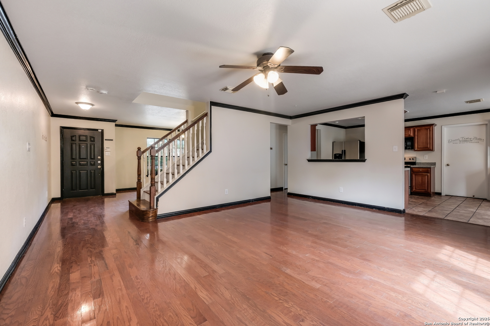 Two-story home offering easy access to Lackland AFB, the 151 Business Corridor, shopping, dining, and more. The first floor features a well-designed layout with a separate dining room, an eat-in kitchen, and a spacious living area. There is no carpet on the first floor, adding both style and easy maintenance. The kitchen is a standout with abundant cabinetry and generous storage, complemented by an oversized coffee bar in the breakfast nook-perfect for daily routines or casual gatherings. The home includes a refrigerator for added move-in convenience. Upstairs, enjoy a sizable loft along with all bedrooms, providing a private and functional retreat. Outdoors, the large backyard offers a patio and mature trees, creating a relaxing setting for outdoor enjoyment. This home combines comfort, space, and convenience in a well-connected location.