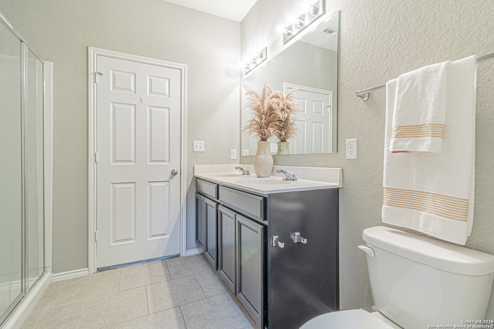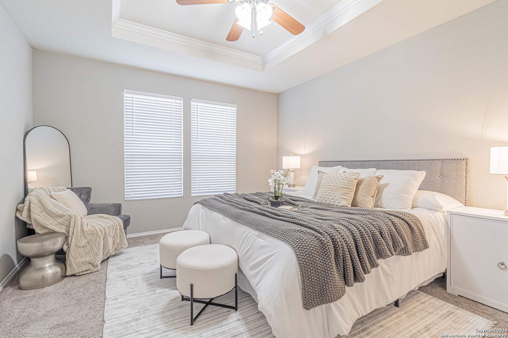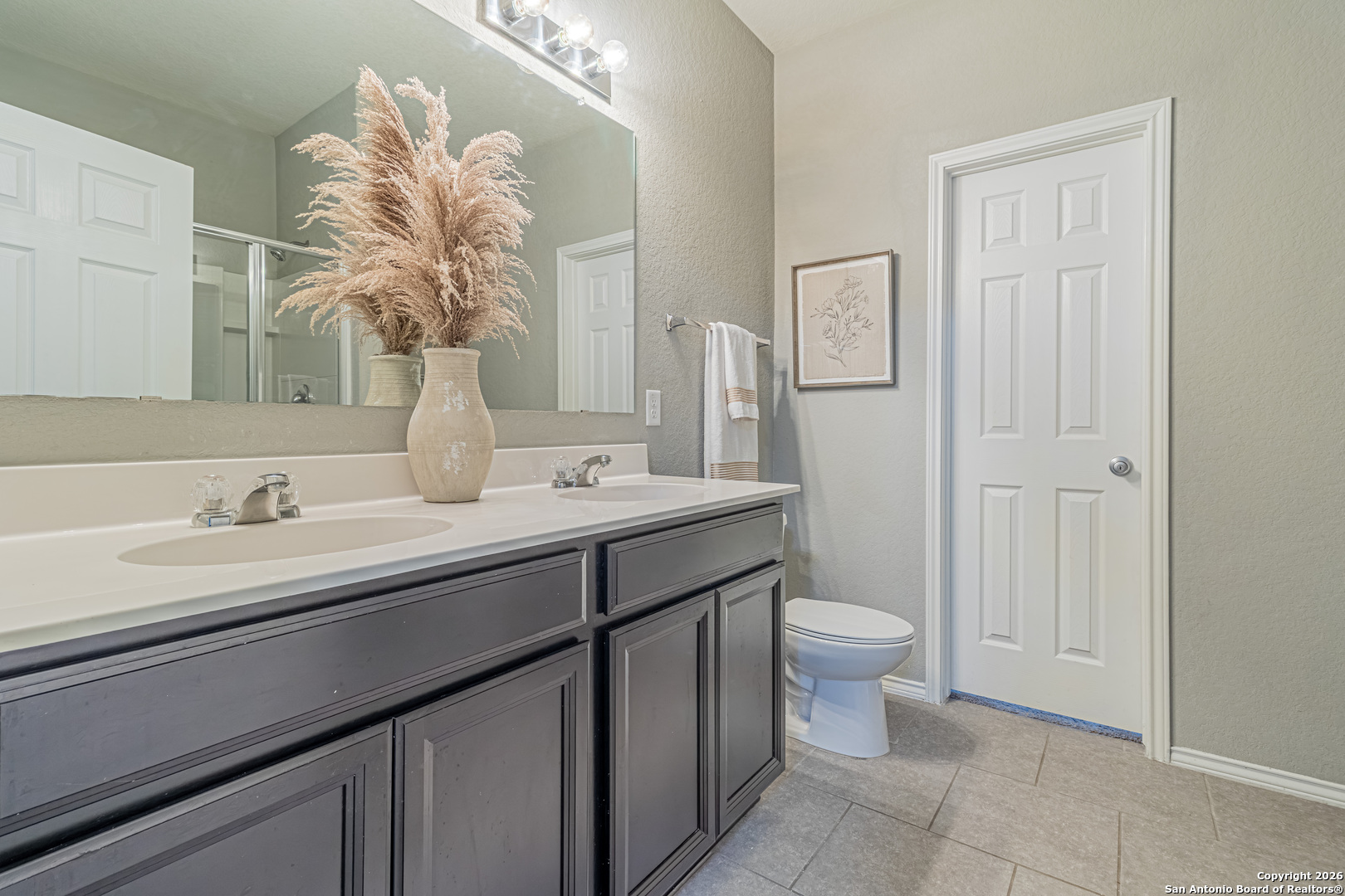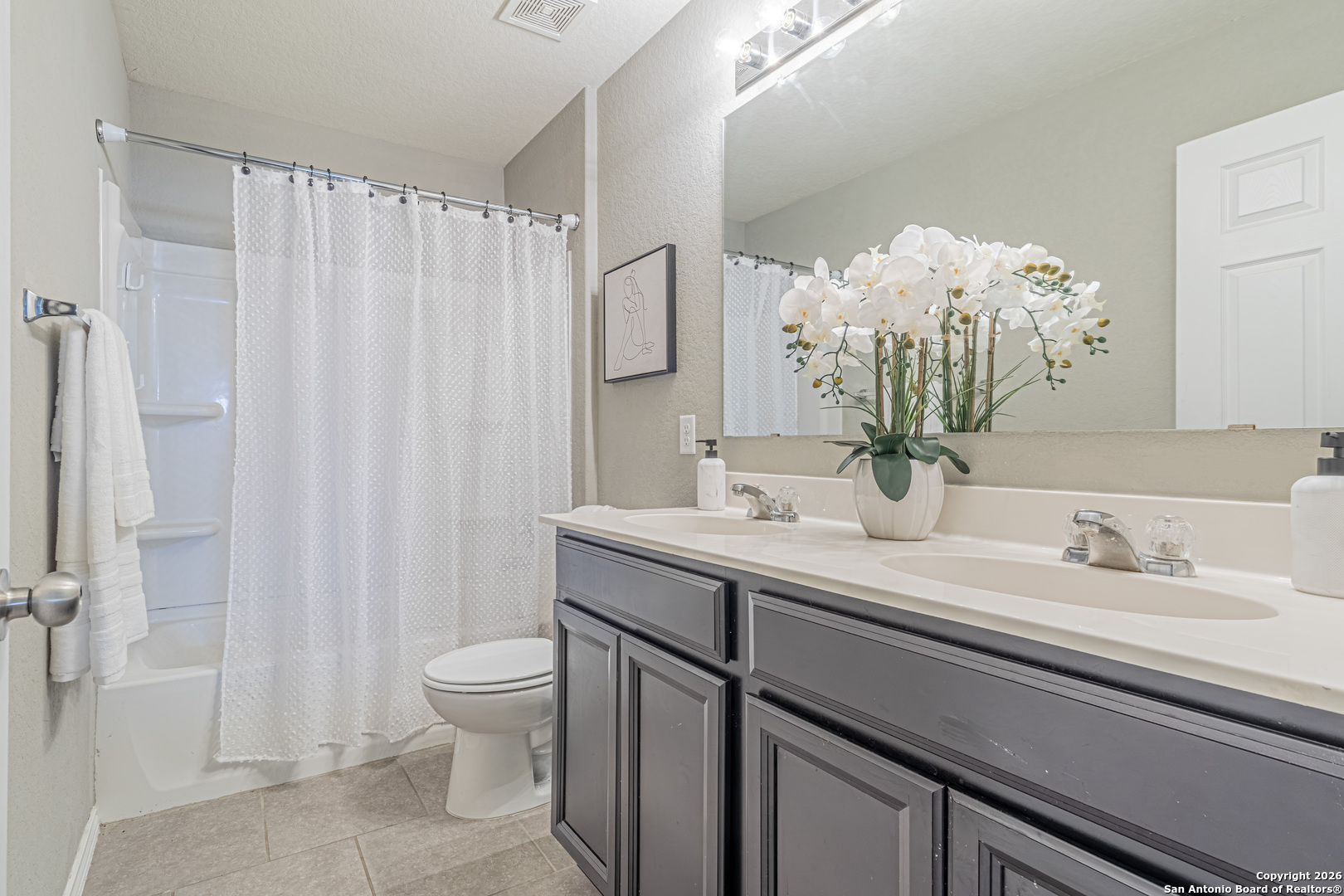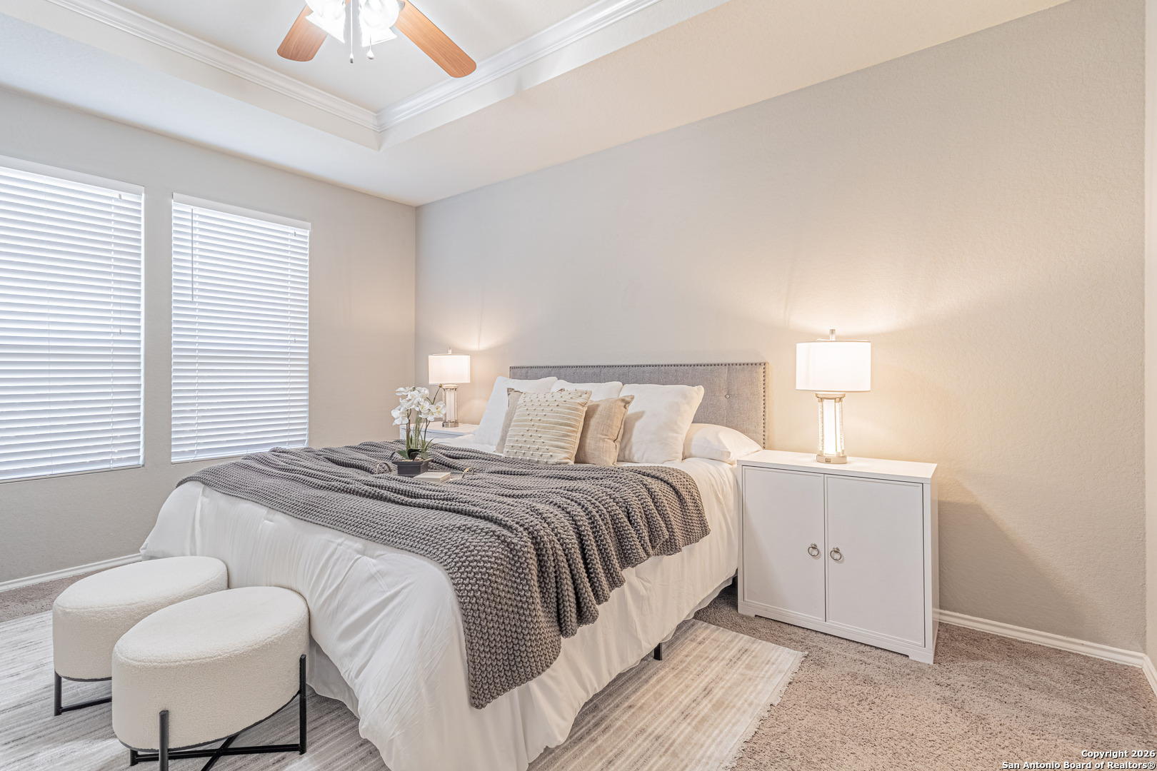Welcome to 10442 Castello Canyon, a stunning two-story home located in the sought-after Silver Canyon community. This spacious 2394 sq ft home offers 4 bedrooms, 2.5 bathrooms, and a flexible layout ideal for modern living. The open floor plan is thoughtfully designed, featuring 9-foot ceilings, tile flooring throughout the main level, and plush carpeting upstairs. The primary bedroom is located downstairs, offering convenience and privacy, with a generous en-suite bathroom, walk-in shower, and expansive walk-in closet. Upstairs, you'll find three additional bedrooms, a full bathroom with double sinks, and a huge game room-perfect for entertaining or relaxing. There's also a dedicated office/study downstairs, ideal for remote work or a quiet retreat. The kitchen boasts stainless steel appliances, granite countertops, and plenty of cabinet space, opening up to the dining and living areas for seamless entertaining. Step outside to a private backyard that backs to a greenbelt, offering peace, privacy, and a perfect setting for gatherings under the covered patio. This home combines style, comfort, and location-just minutes from Loop 1604, major employers, shopping, and top-rated NISD schools. Come see why this Silver Canyon gem is the perfect place for New Beginnings!