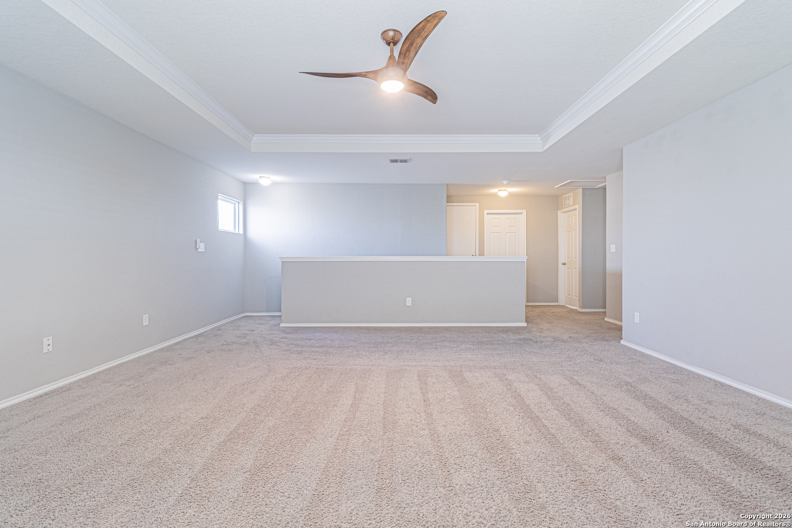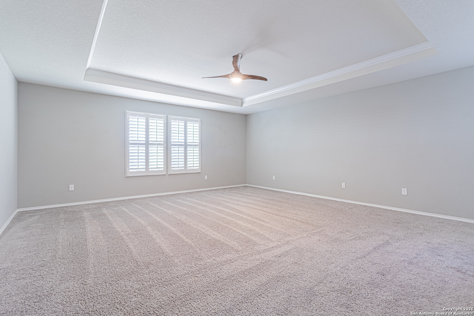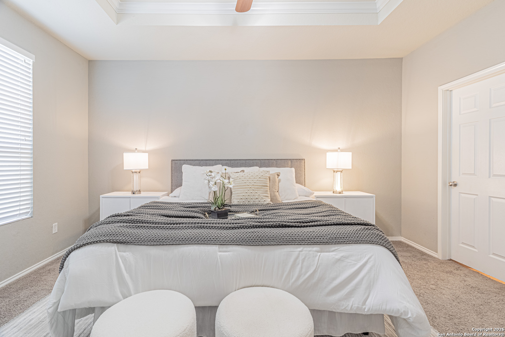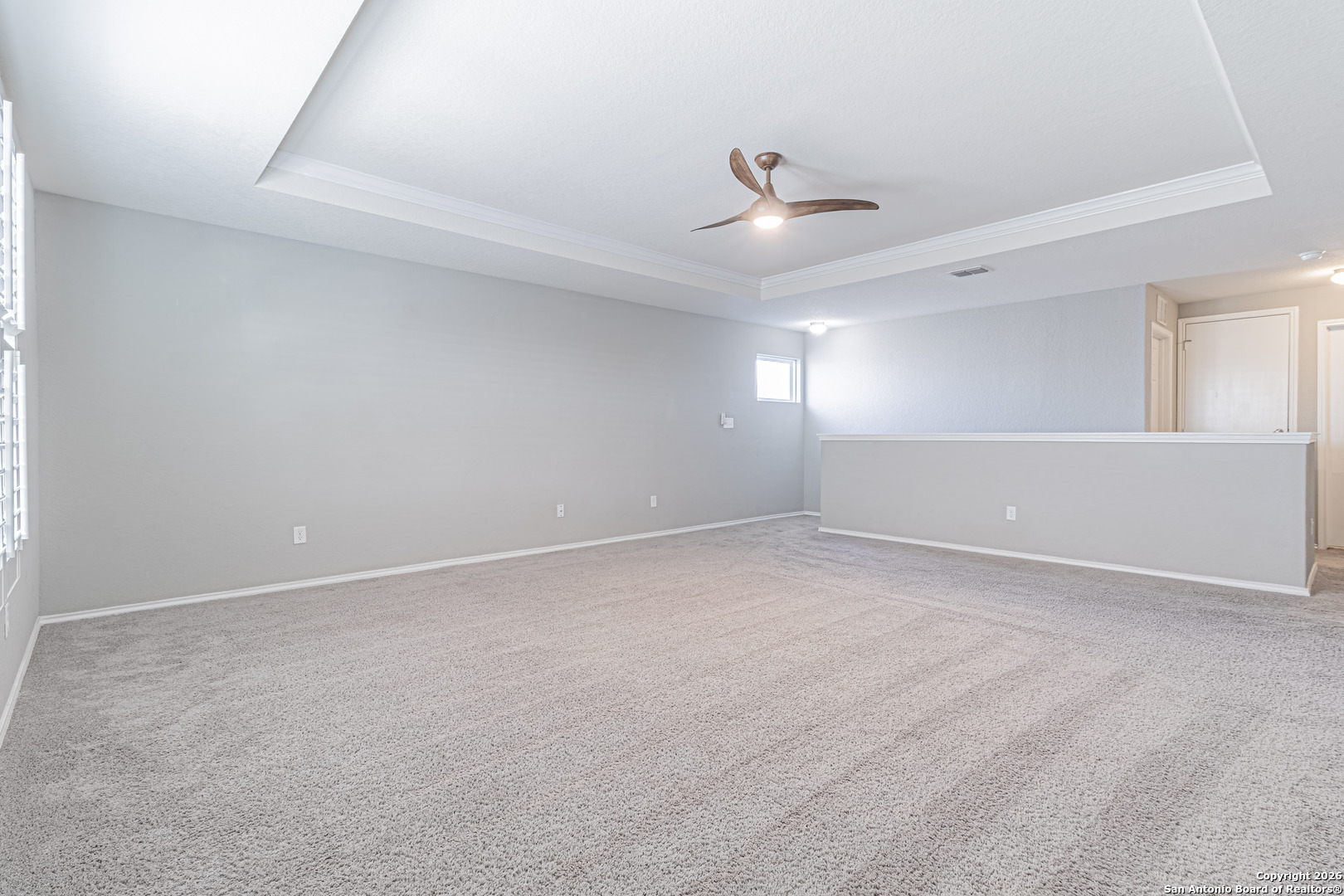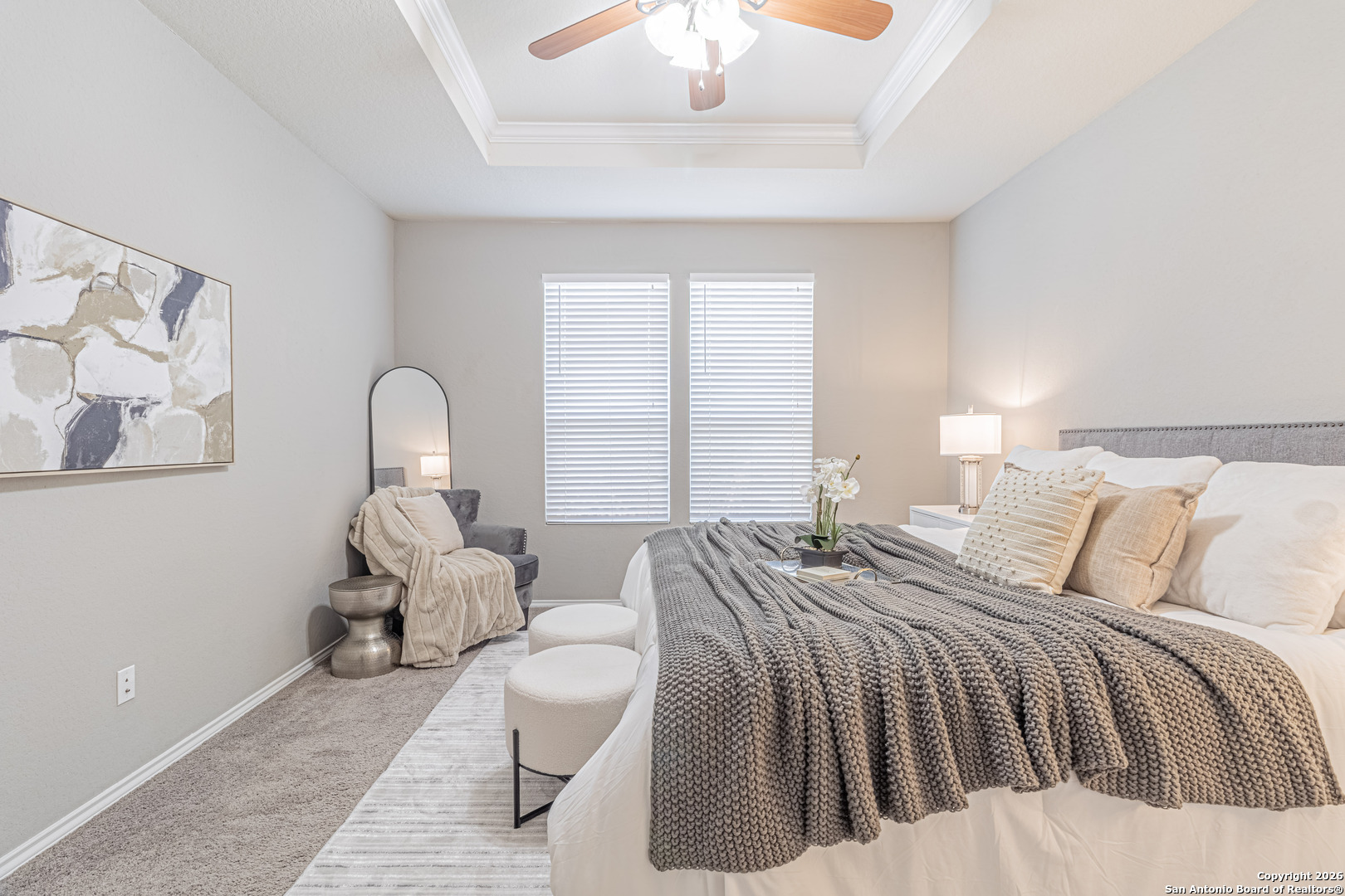 Welcome to 10442 Castello Canyon, a stunning two-story home located in the sought-after Silver Canyon community. This spacious 2394 sq ft home offers 4 bedrooms, 2.5 bathrooms, and a flexible layout ideal for modern living. The open floor plan is thoughtfully designed, featuring 9-foot ceilings, tile flooring throughout the main level, and plush carpeting upstairs. The primary bedroom is located downstairs, offering convenience and privacy, with a generous en-suite bathroom, walk-in shower, and expansive walk-in closet. Upstairs, you'll find three additional bedrooms, a full bathroom with double sinks, and a huge game room-perfect for entertaining or relaxing. There's also a dedicated office/study downstairs, ideal for remote work or a quiet retreat. The kitchen boasts stainless steel appliances, granite countertops, and plenty of cabinet space, opening up to the dining and living areas for seamless entertaining. Step outside to a private backyard that backs to a greenbelt, offering peace, privacy, and a perfect setting for gatherings under the covered patio. This home combines style, comfort, and location-just minutes from Loop 1604, major employers, shopping, and top-rated NISD schools. Come see why this Silver Canyon gem is the perfect place for New Beginnings!