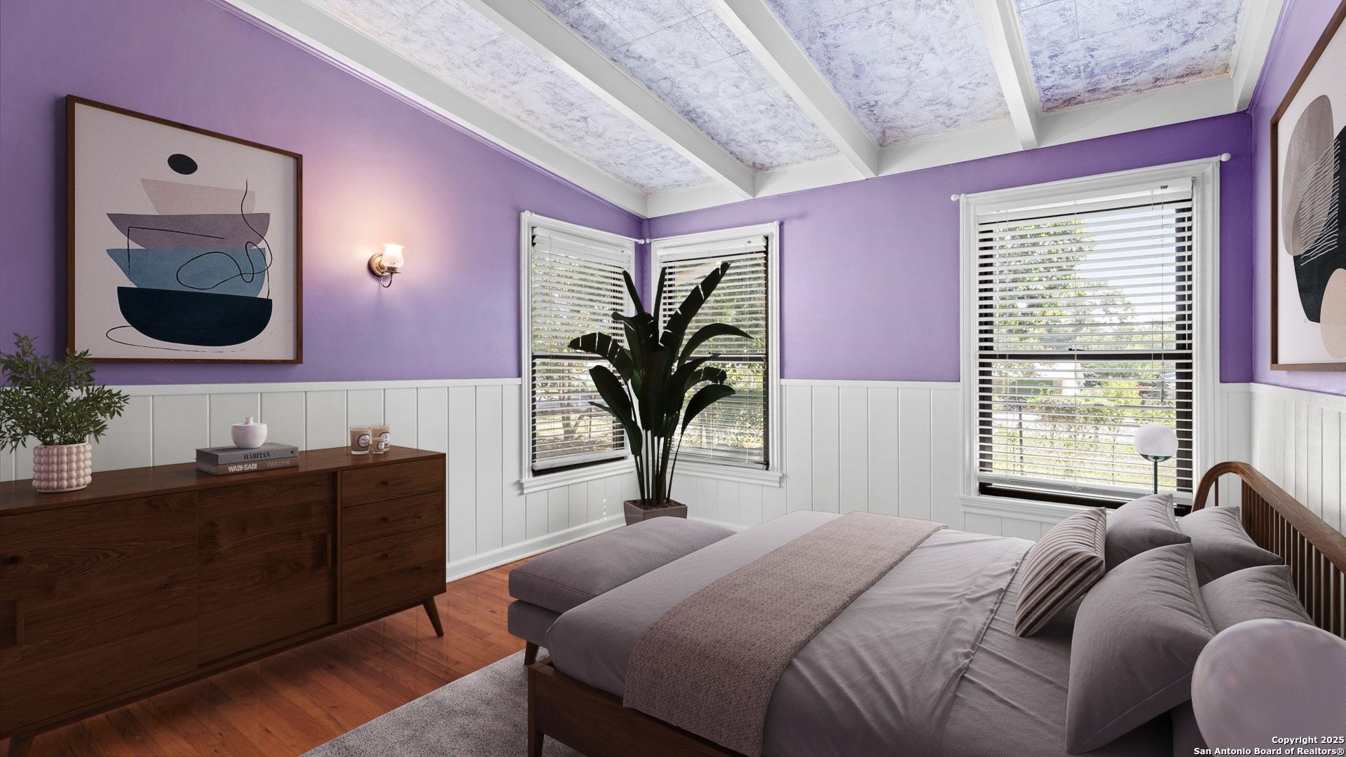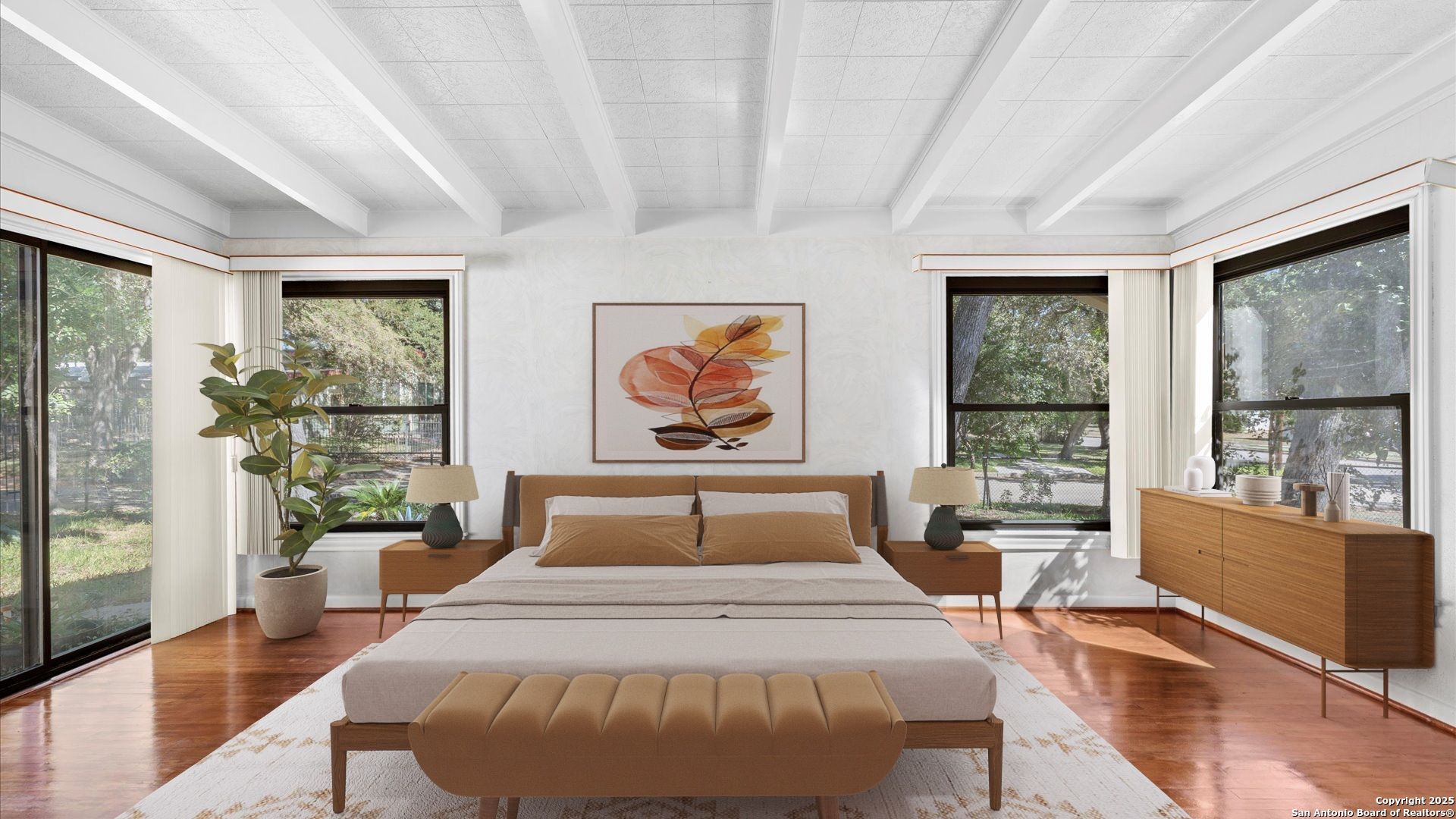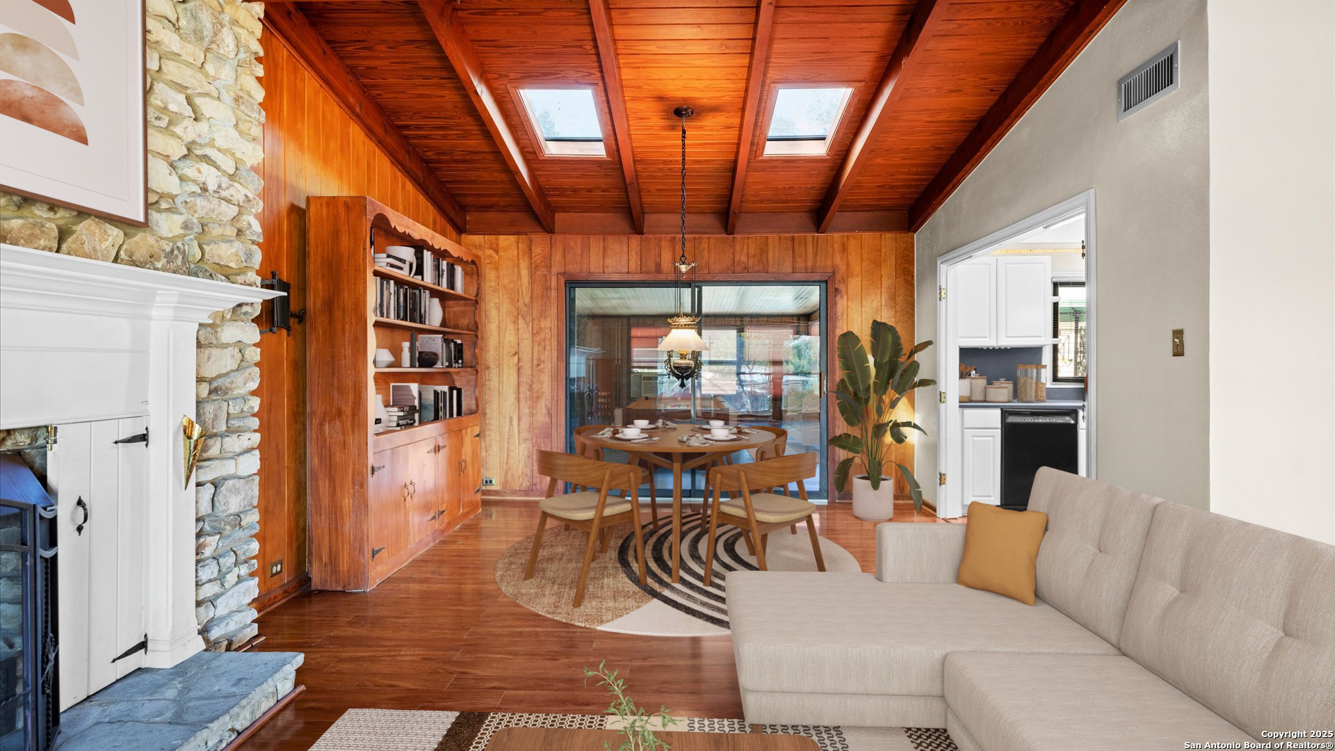 Vintage charm meets modern comfort in this beautiful one-story ranch-style home located in the highly desirable Terrell Hills area. Resting on a picturesque park-like corner lot of over one-third acre, this property is surrounded by mature trees, lush landscaping, and multiple outdoor spaces perfect for entertaining or relaxing by the custom-designed pool. Step inside to discover an inviting open-concept living, dining, and kitchen area that feels both spacious and warm. The main living room features a striking floor-to-ceiling stone gas fireplace, a vaulted wood-lined ceiling with exposed beams, and three large picture windows that fill the space with natural light. Skylights in the dining area enhance the bright and airy atmosphere, while a side nook offers a convenient spot for a home office. A bonus room off the dining area adds flexibility. Ideal for use as a sunroom, game room, craft space, or cozy second living area. Throughout the home, wood, laminate and tile flooring and vaulted ceilings with exposed beams blend timeless style with practical comfort - and there's no carpet in the house. The primary suite includes private backyard access, a spacious ensuite bath with both a tub and separate shower, and generous natural light. The secondary bedrooms are equally inviting, featuring vaulted ceilings and multiple windows. Both bathrooms retain their original vintage character, maintaining the home's nostalgic appeal. Outdoors, you'll find several seating areas to enjoy the shade and scenery, along with a detached two-car garage and a charming casita complete with kitchenette, full bath, and its own private outdoor area, perfect for guests or a studio space. Additional highlights include a metal roof, newer HVAC system (10-year warranty, which includes twice a year service Maintenance, 10 years parts & labor), gutter system, cedar closet with double doors, separate storage area and a utility area with sink behind the garage that can easily be relocated to the main home if desired. Located in the coveted Terrell Hills community, this home enjoys access to its own dedicated police department, located less than two miles away, and a shared fire department with Alamo Heights. You'll love the convenient location, just one mile to several shopping centers including H-E-B, Walmart, Lowe's, and Target, and only a quarter-mile to numerous restaurants. It's also minutes from major freeways, close to Ft. Sam Houston, and just a few blocks from Terrell Hills Kiddie Park. Nearby, enjoy bike and walking trails along the San Antonio Riverwalk, lined with cafes and entertainment, and the DoSeum (Children's Museum) across from Brackenridge Park, all just a short drive away. This home perfectly combines vintage charm, modern conveniences, and an unbeatable location, making it a rare find in one of San Antonio's sought-after neighborhoods.
