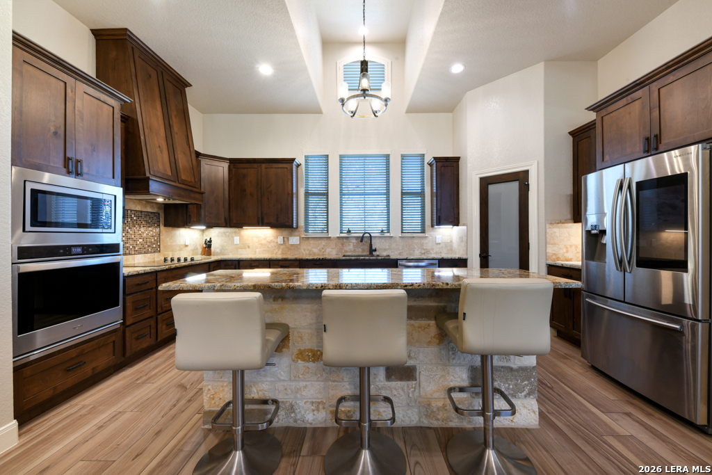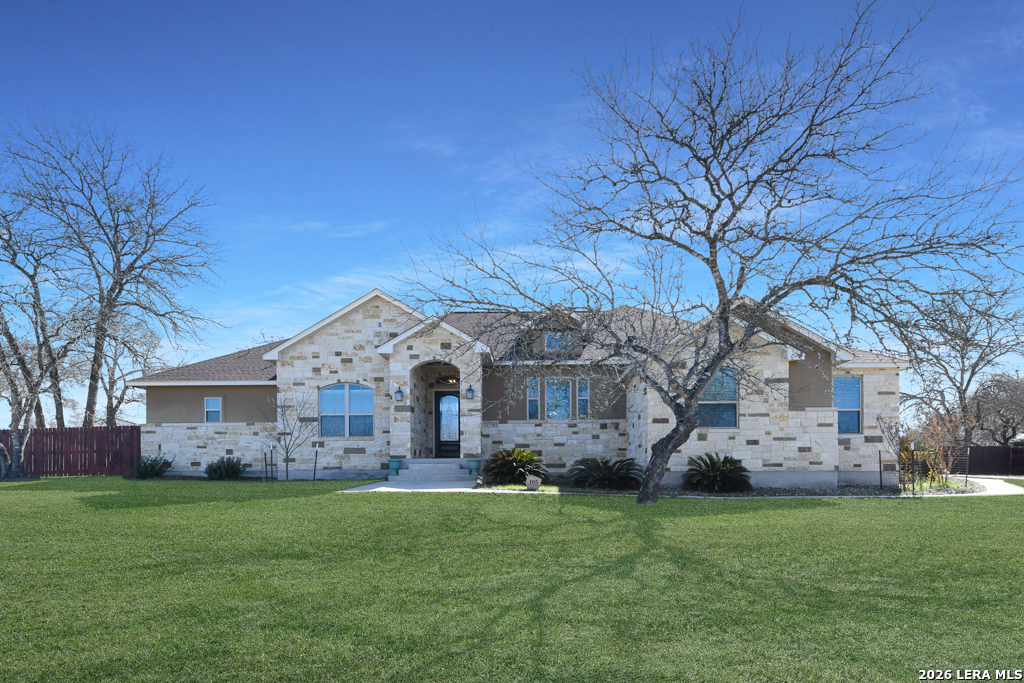 Welcome to 105 Bobby Lynn Drive in Adkins, TX! Situated on 1.07 acres in Eden Crossing, this well-maintained one-story home offers 4 bedrooms, 2.5 baths, and approximately 2,533 square feet of open, functional living space. The spacious living room features a stone wood-burning fireplace and flows seamlessly into the kitchen with granite countertops, large island, walk-in pantry, and abundant cabinetry. The private primary suite includes dual walk-in closets, separate vanities, soaking tub, and walk-in shower. Secondary bedrooms offer flexibility for guests, office, or hobbies. Step outside to enjoy the extended covered patio with wood ceiling, custom outdoor kitchen, and pool with waterfall feature. The privacy fence with double driveway gates provides additional parking or RV storage options. Additional features include a three-car garage, mature trees, sprinkler system, and plenty of space to enjoy peaceful country living within La Vernia ISD. Schedule your showing today!