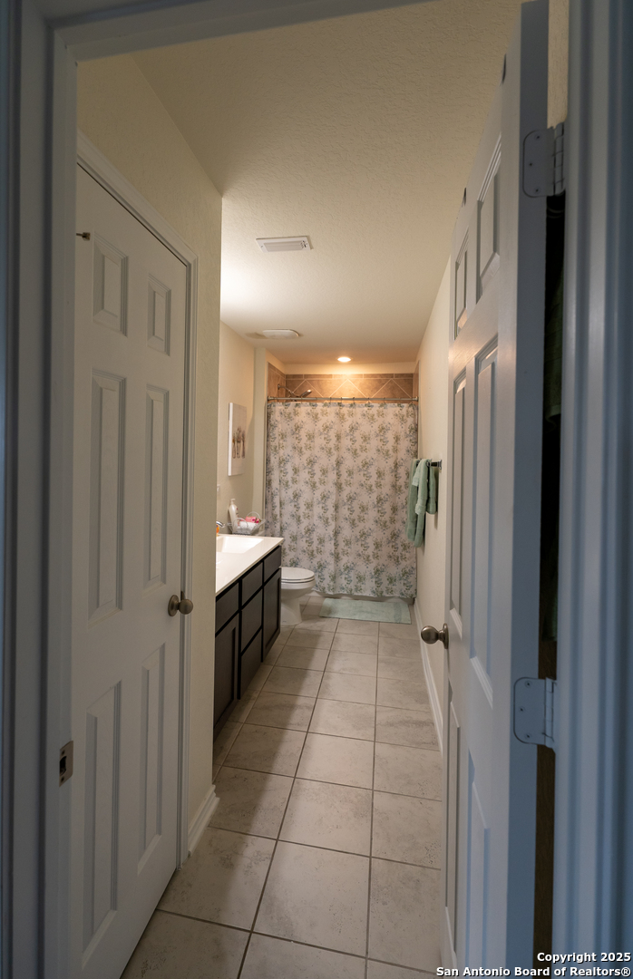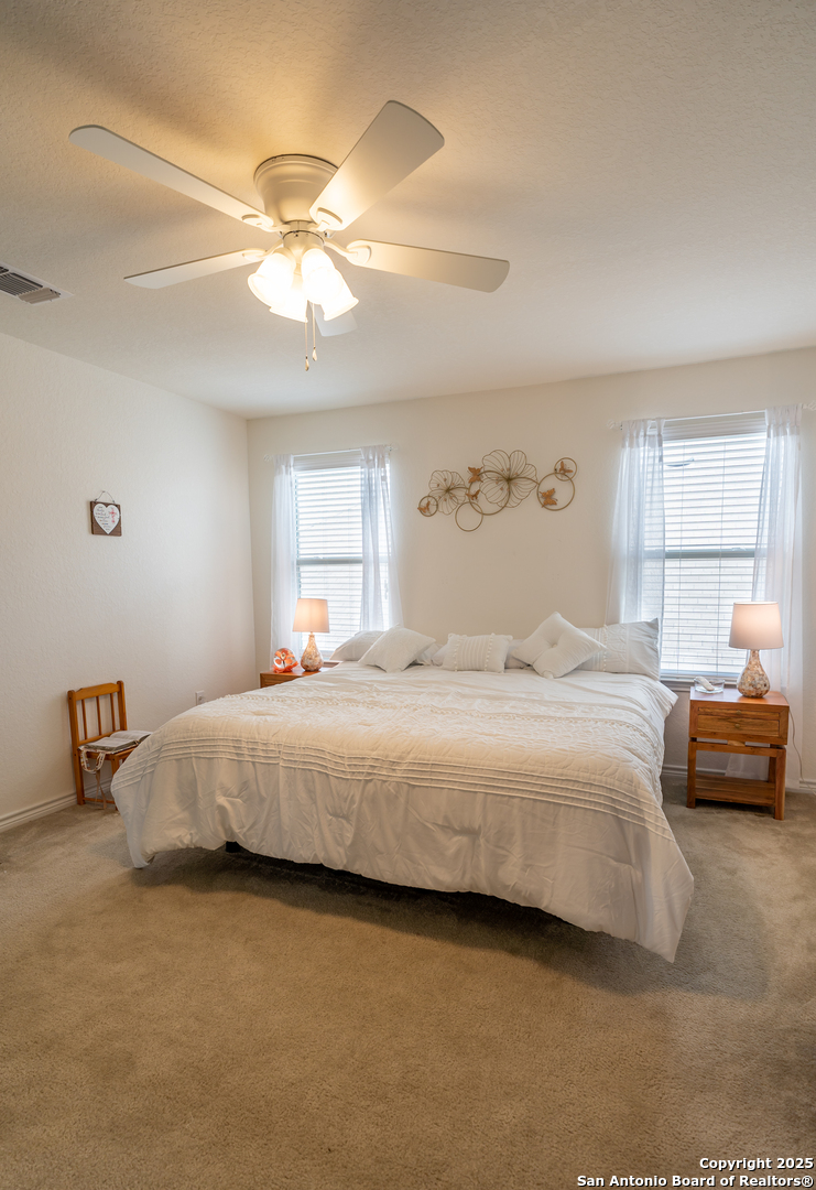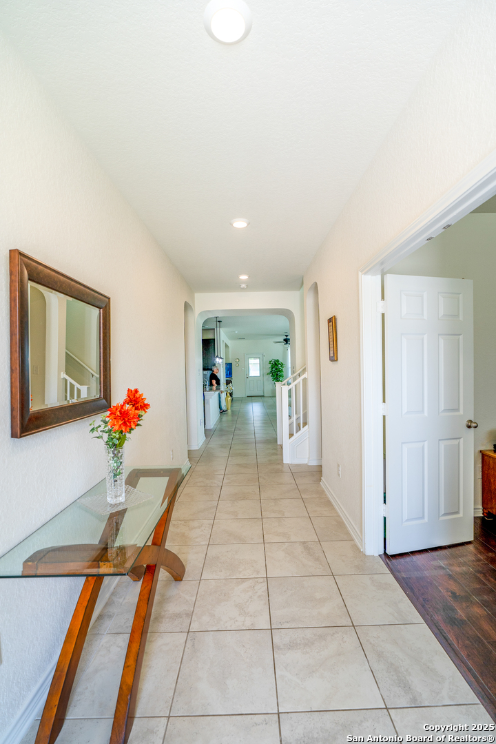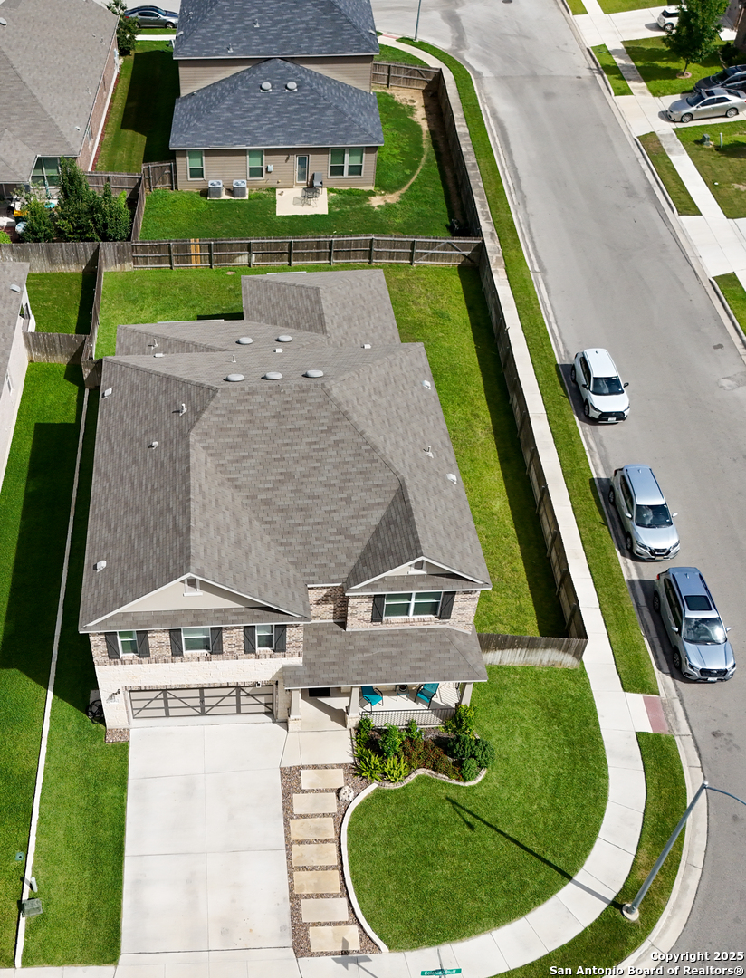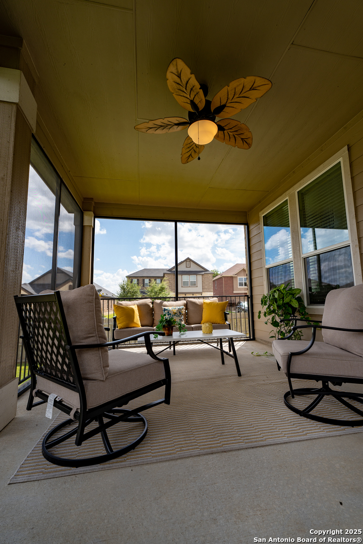 Perfect for multigenerational living. Ideal for military families-7 minutes from Randolph AFB. Move in ready! Welcome to this beautifully designed two-story home built in 2018, offering a spacious and modern open floor plan with five bedrooms, an office, two full bathrooms, and one-half bathroom. The home also includes a large upstairs media or family room, perfect for entertaining or relaxing with loved ones. Step inside to find an inviting layout with high ceilings, abundant natural light, and a seamless flow between the living, dining, and kitchen areas. The kitchen features modern cabinetry, stainless steel appliances, and an oversized island with bar seating, creating the perfect space for cooking and gathering. The primary suite is located on the main level and offers privacy and comfort with a large walk-in closet and a spa inspired bathroom that includes a double vanity, soaking tub, and separate shower. The additional bedrooms are generously sized and provide plenty of space for family or guests. Enjoy outdoor living in the covered back patio with full screen enclosure, ideal for evening relaxation or weekend barbecues. The backyard is easy to maintain and perfect for family gatherings or quiet moments of peace. This home combines comfort, functionality, and modern elegance, including energy efficient features, updated flooring, and smart home technology. Located just minutes from Randolph Air Force Base, Interstate 35, and Loop 1604, this property offers convenient access to major highways. It is only five minutes from Loop 410, twenty-five minutes from the San Antonio International Airport, and thirty-five minutes from downtown San Antonio. Experience the perfect balance of modern living, convenient location, and community charm in Universal City.