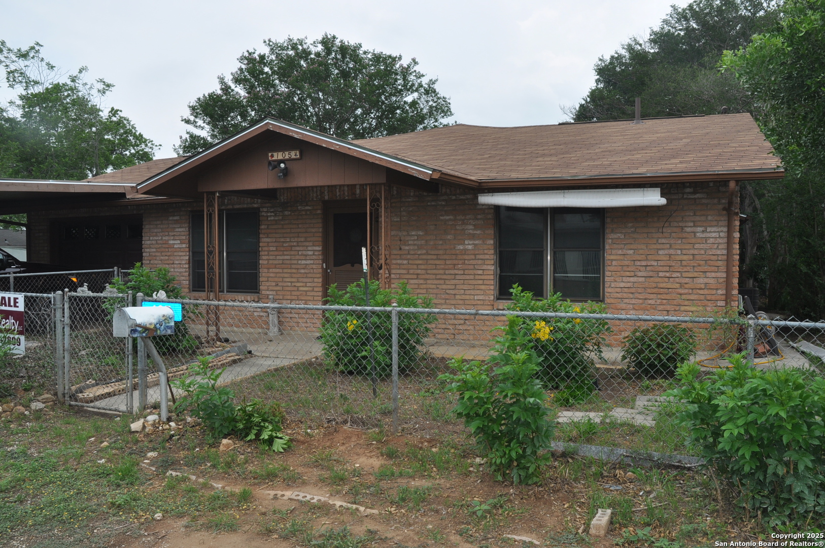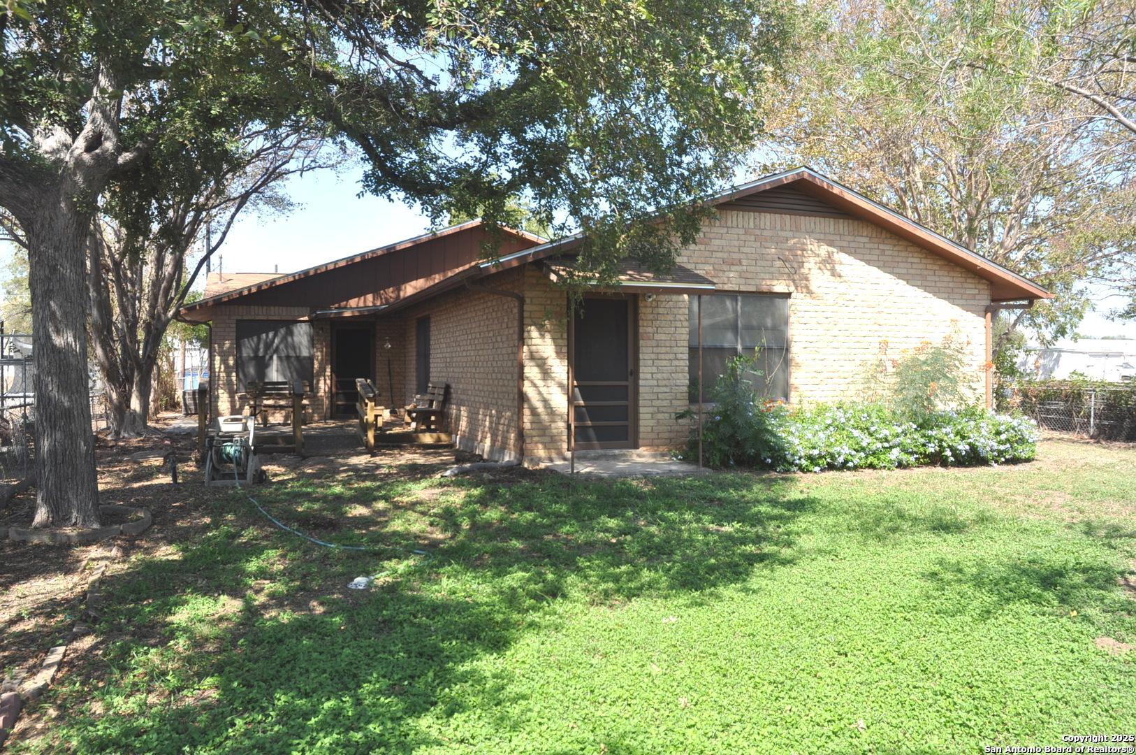 Spacious charming home nestled in the heart of Devine. This 3 bedroom, 2 full bath boasts a generous amount of square footage, giving it an open, airy feel. Two bedrooms and one full bath are located off of the main living area at the entry of the home. The oversized master suite has a large living space, built in cabinets, private bath and exterior door. The kitchen is located in between the front living and boasts new granite countertops, new sink, fixtures and new paint. The oversized additional second living area and dining area is perfect for entertaining! Attached back deck with a wheel-chair ramp. Entire front and back yard is fenced - detached storage building - attached one car garage - and two car attached carport - New roof installed.