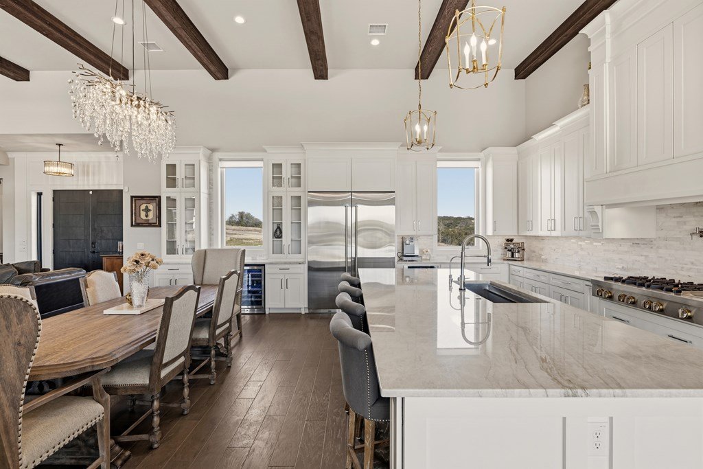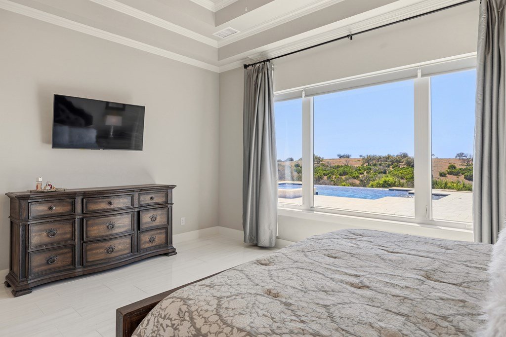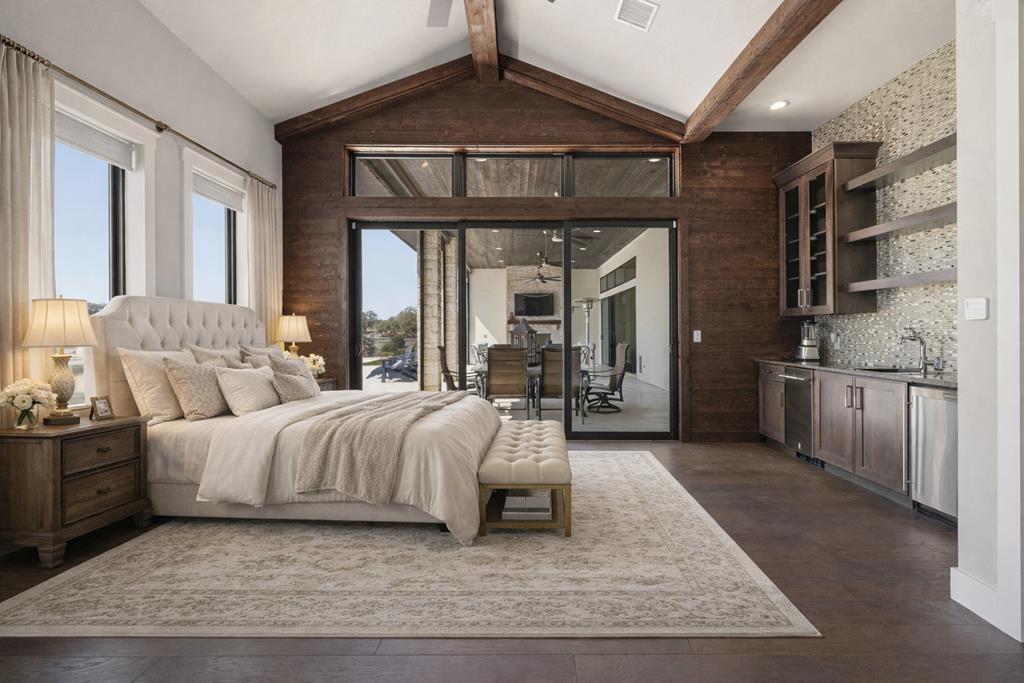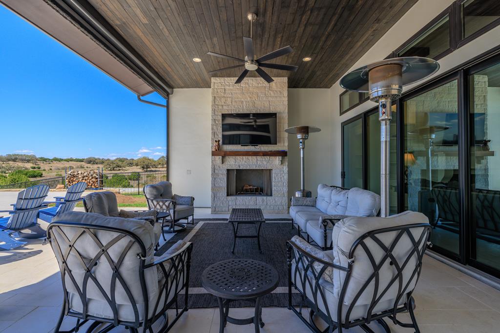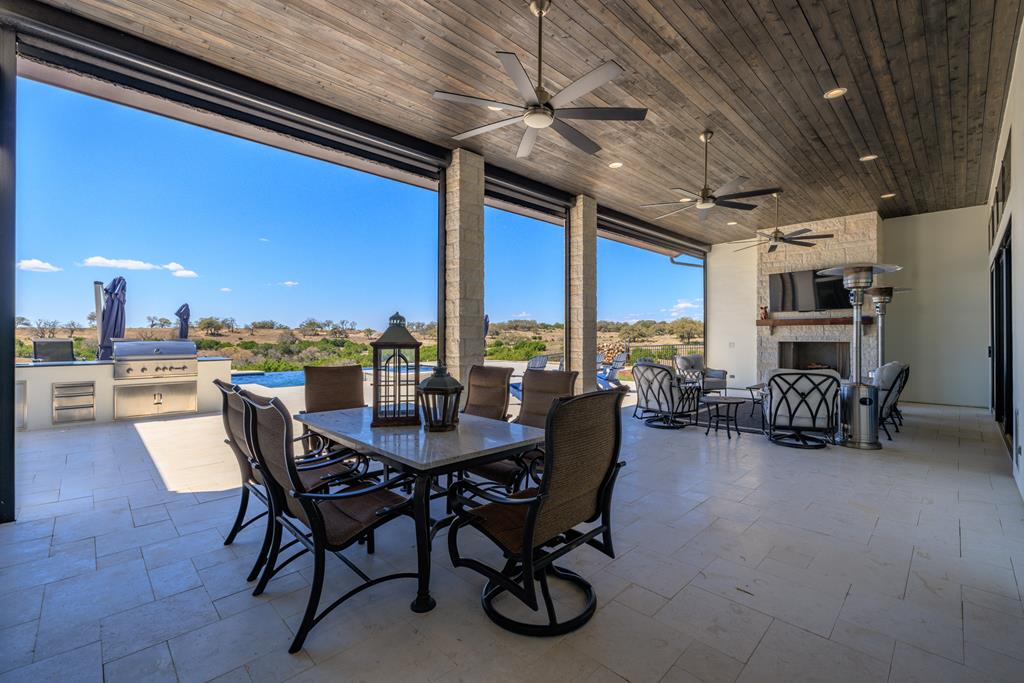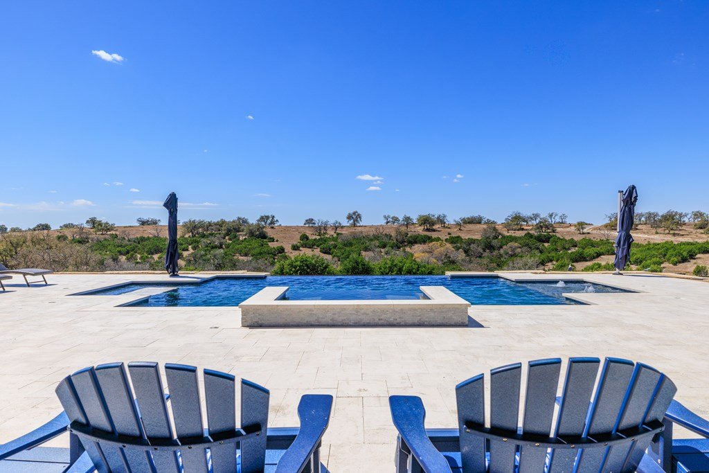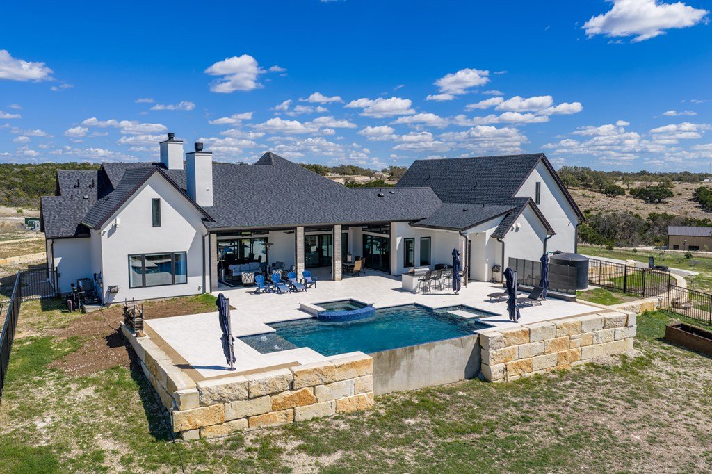 Set on over five acres in gated Loma Vista Ranch, this striking Hill Country estate unfolds as an experience, one that feels both architecturally bold and effortlessly livable from the moment you arrive. Clean lines and expansive scale create a sense of quiet sophistication, while warm hickory floors and curated finishes soften the space, inviting you to settle in and stay awhile. The home was designed for both everyday comfort and exceptional living. With four bedrooms and five baths, including a private guest suite, the layout offers flexibility without sacrificing intention. Tucked away as its own retreat, the primary suite is a true sanctuary; heated floors underfoot and a spa-inspired bath that feels more like a destination than a necessity. A glass-enclosed walk-through double shower, a freestanding soaking tub framed by picture windows and sweeping Hill Country views create a setting that is equal parts serene and indulgent. Thoughtfully designed for both beauty and function, the home features expansive custom closets and a dedicated glam room perfectly suited for elevated daily routines or full-scale hair and makeup preparation. At the heart of the home, the kitchen makes a statement. A dramatic Taj Mahal quartzite island anchors the space, surrounded by 54 inch custom maple soft-close cabinetry, a 48” propane range, double ovens, double dishwashers, dual refrigerators and a full scullery pantry designed to perform just as beautifully as it presents. Overhead, soaring ceilings and exposed beams add architectural presence, while walls of glass open seamlessly to the outdoors, blurring the line between inside and out. Step outside and the experience continues. The backyard unfolds like a private resort centered around a 21,000-gallon pool, expansive patios, an outdoor fireplace and a fully equipped outdoor kitchen, all positioned to take in uninterrupted views of the surrounding acreage. It's a space designed for gathering, unwinding, and making the most of Hill Country evenings. Wellness and security are seamlessly integrated into the home's design. A private gym offers space to recharge, while a discreet safe/IT room, hidden behind a custom bookcase, adds both function and a touch of intrigue. Above it all, a finished attic complete with its own bathroom and pre-plumbed for a kitchenette, offers endless potential for a guest retreat, studio, or private office tailored to your vision. Beyond its visible beauty, this home was built with intention at every level. Constructed in collaboration with Build Green, the owner was hands on throughout the process, resulting in a level of craftsmanship that extends far beyond what meets the eye. From 2x6 framing and LVL engineered supports to reinforced structural elements, insulated piping, and meticulous inspection oversight, every detail was thoughtfully executed. Practicality meets luxury with a climate-controlled three-car garage, a 600 foot water well, 2,500 gallon water tank and a 500 gallon buried propane tank; features designed for long-term efficiency and reliability. And just beyond the main living spaces, a gentle, spring fed creek winds along the edge of the property, adding a final layer of tranquility to this private Hill Country setting. Loma Vista Ranch further elevates the experience with a gated entrance, paved private roads, underground utilities, and access to two private property owner parks featuring picturesque ponds, walking trails, and a stocked fishing lake offering a blend of privacy, natural beauty, and thoughtfully planned community amenities. Built without compromise and designed to endure, this is more than a home, it's a retreat, a statement and a place to create a lasting legacy.