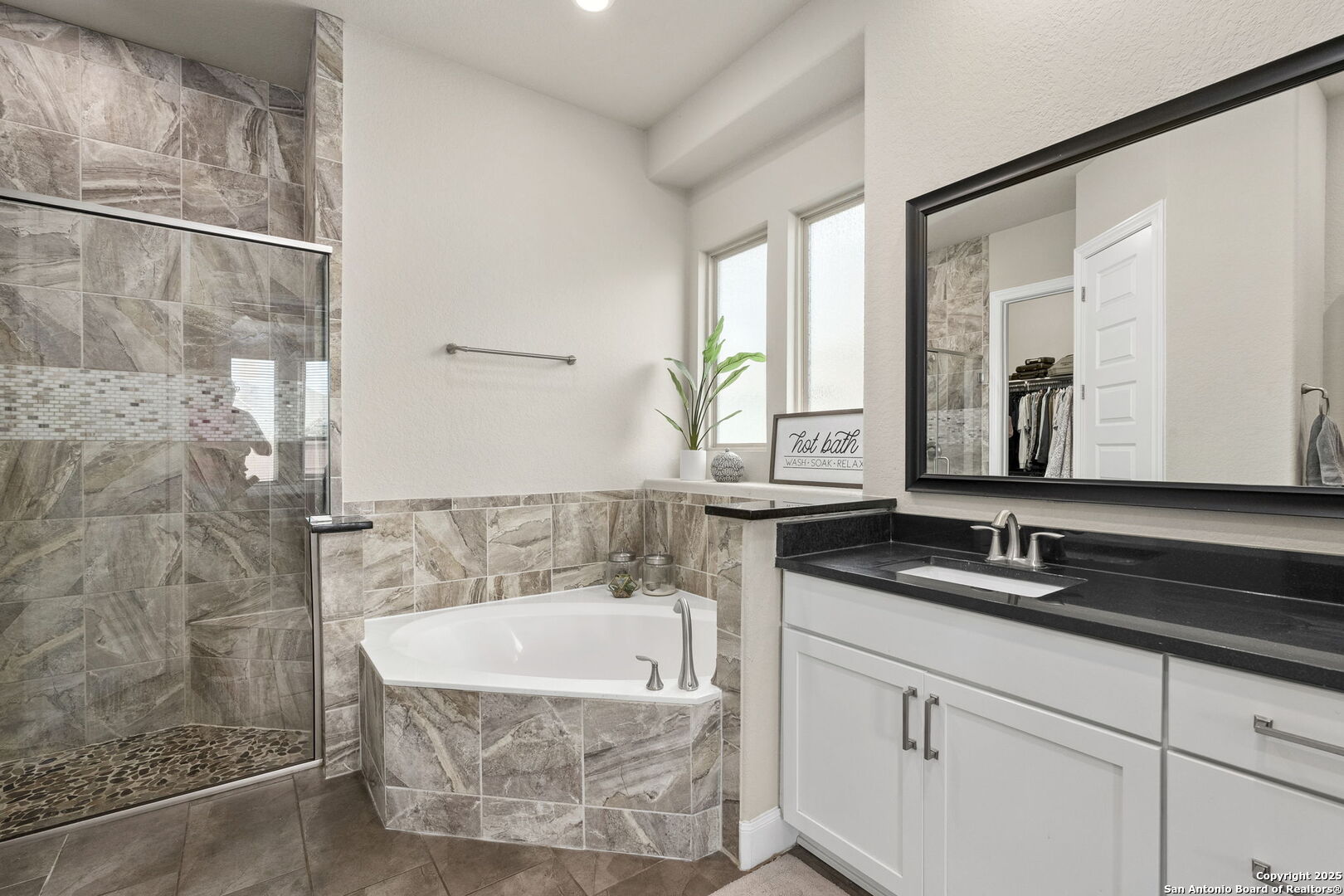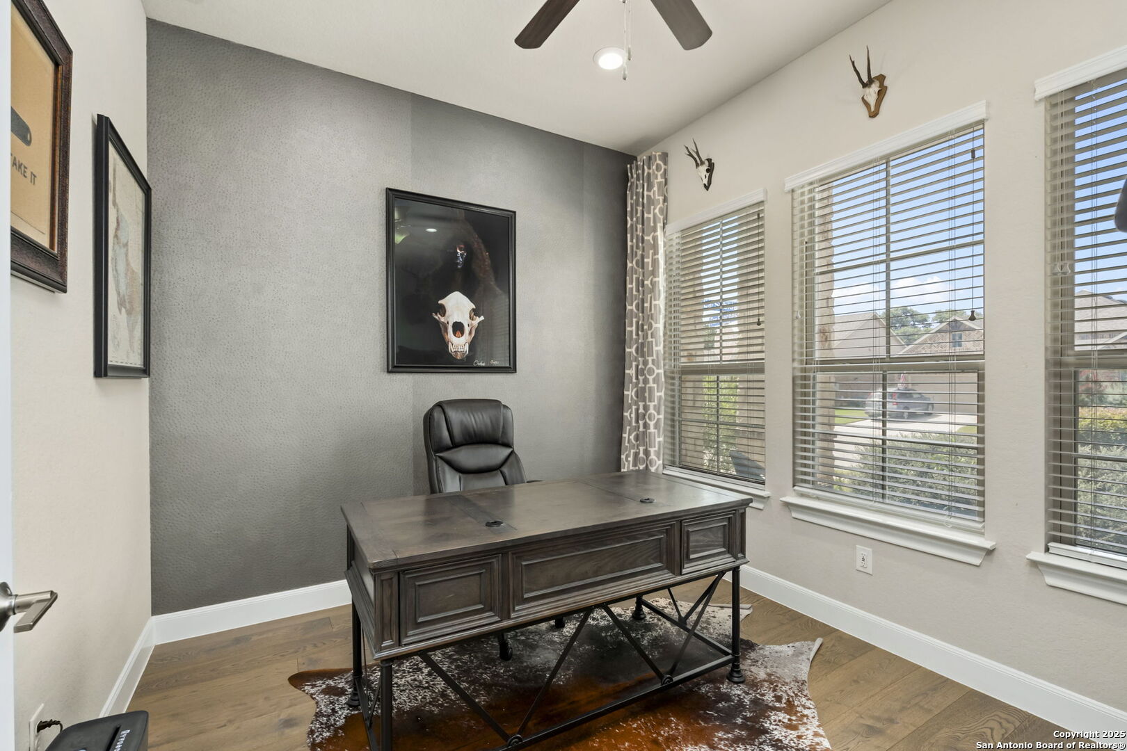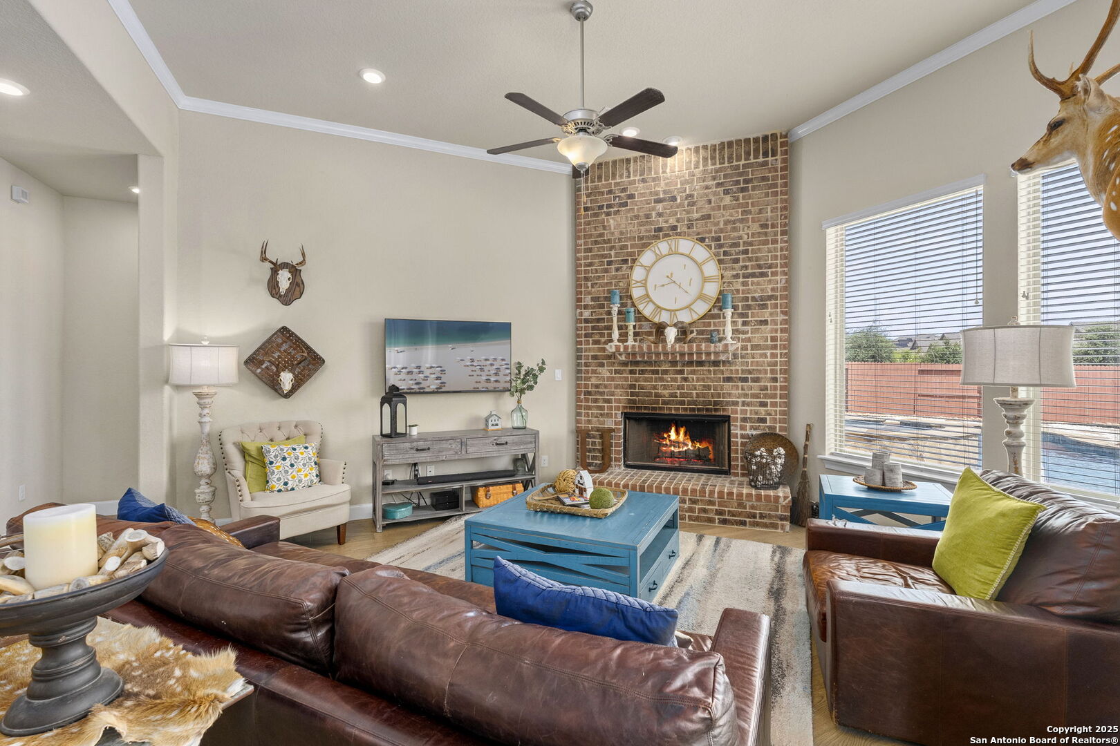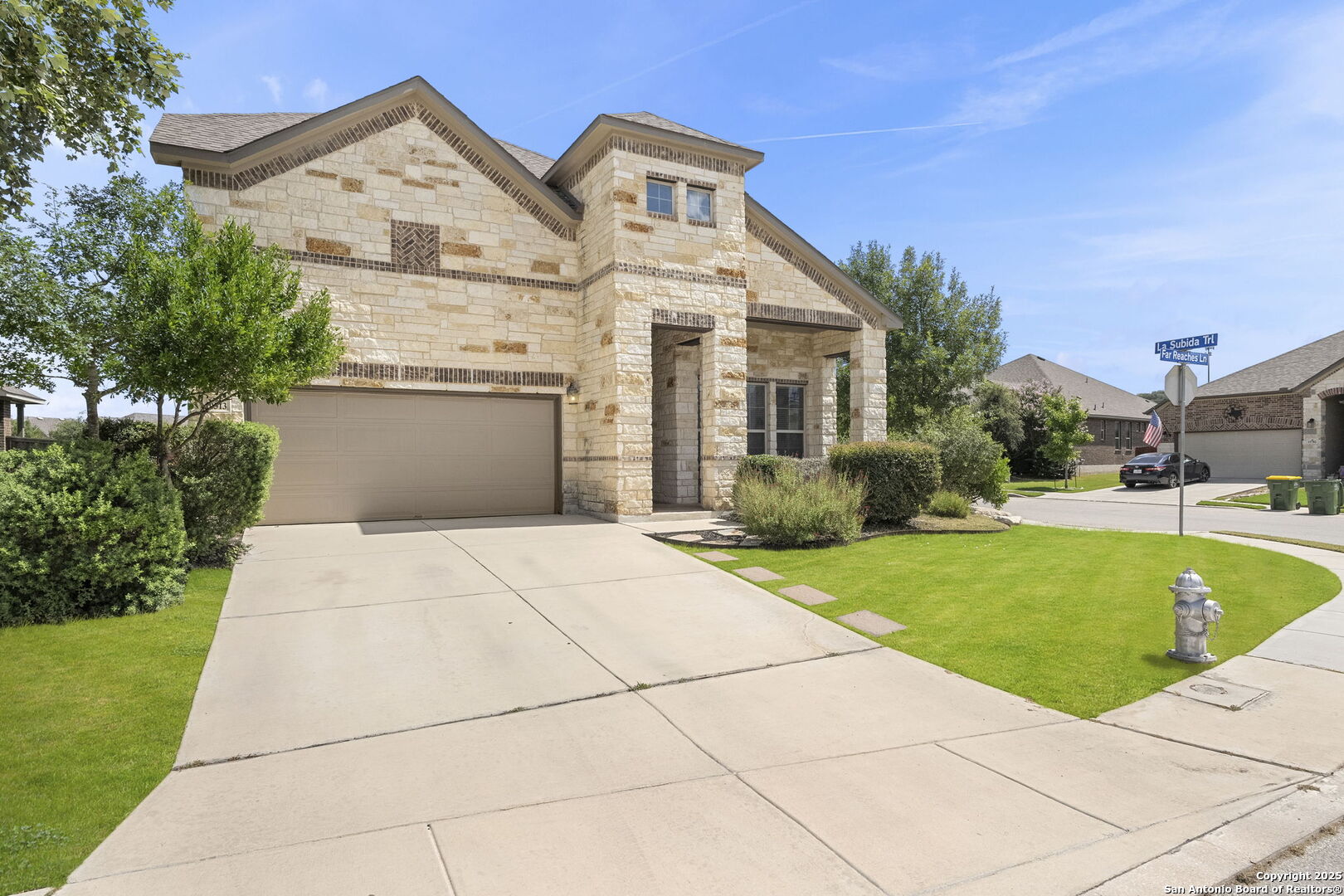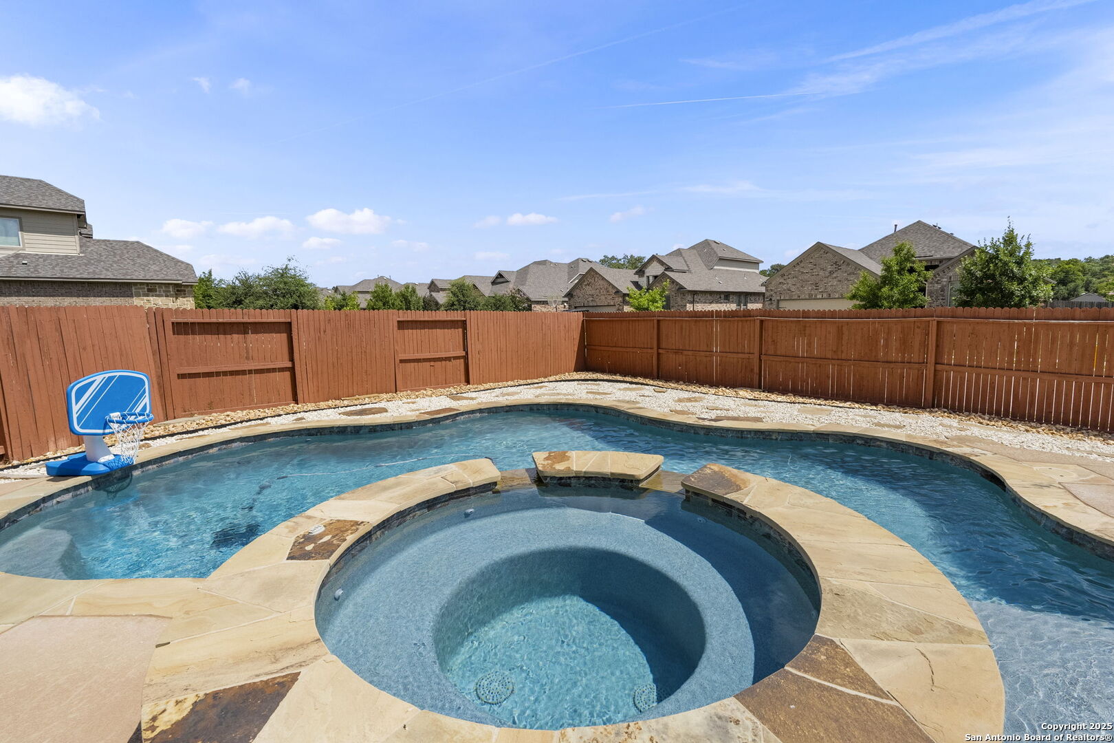 Sophistication and comfort meet in this stunning 4-bedroom, 3.5-bathroom home nestled on a beautifully landscaped corner lot in Helotes. Designed for both everyday living and elegant entertaining, the grand open layout features soaring ceilings, abundant natural light, and striking curb appeal that instantly captures attention. Inside, the spacious kitchen is a chef's dream-complete with stainless steel appliances, an inlay gas stove, built-in microwave and oven, ample cabinetry, generous countertop space, and a large island perfect for gatherings. The formal dining room and cozy living area with a fireplace make hosting effortless, while the dedicated office provides a quiet space to work from home. Retreat to the luxurious primary suite featuring a spa-like en suite bathroom with dual vanities, a soaking garden tub, and a separate walk-in shower. Upstairs, enjoy a loft area, media/movie room, and built-in desk-ideal for homework, planning, or creative projects. Step outside to your private xeriscaped oasis. A shimmering pool with a spa, spacious covered patio, and lush greenery offer a peaceful retreat or the perfect backdrop for summer get-togethers. Situated just north of Highway 16/Bandera Road, this home combines a relaxed country lifestyle with convenient access to shopping, dining, and top-rated schools in a rapidly growing area. Experience luxury living with space to unwind, entertain, and truly feel at home.