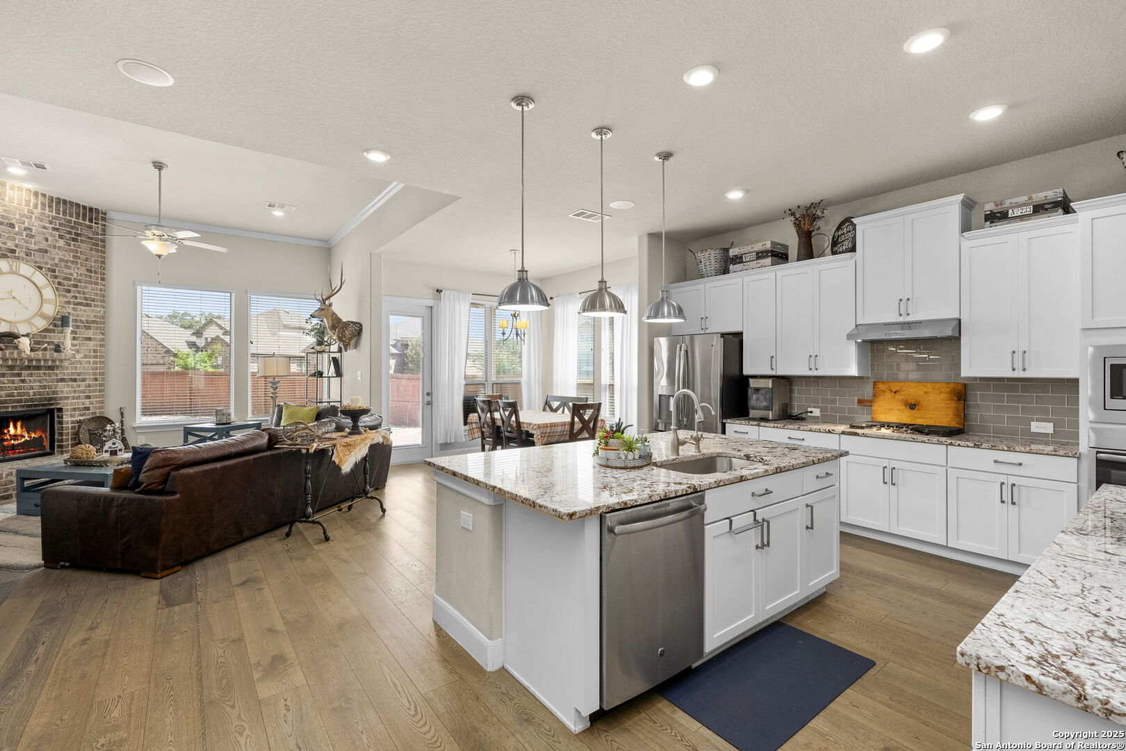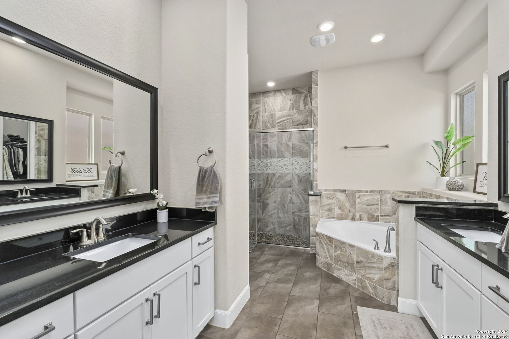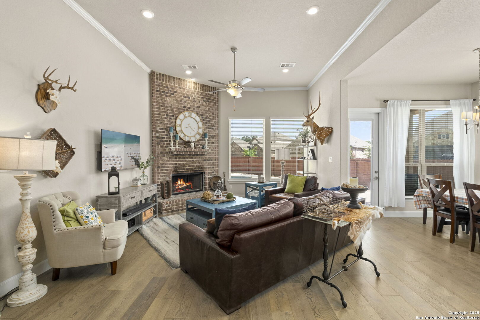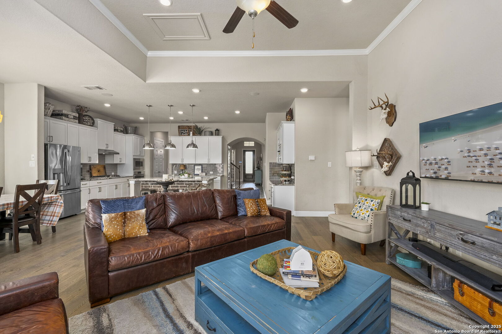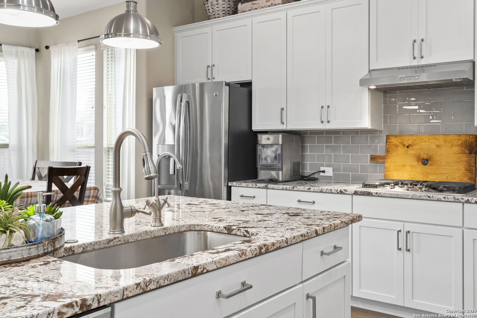 Sophistication and comfort meet in this stunning 4-bedroom, 3.5-bathroom home nestled on a beautifully landscaped corner lot in Helotes. Designed for both everyday living and elegant entertaining, the grand open layout features soaring ceilings, abundant natural light, and striking curb appeal that instantly captures attention. Inside, the spacious kitchen is a chef's dream-complete with stainless steel appliances, an inlay gas stove, built-in microwave and oven, ample cabinetry, generous countertop space, and a large island perfect for gatherings. The formal dining room and cozy living area with a fireplace make hosting effortless, while the dedicated office provides a quiet space to work from home. Retreat to the luxurious primary suite featuring a spa-like en suite bathroom with dual vanities, a soaking garden tub, and a separate walk-in shower. Upstairs, enjoy a loft area, media/movie room, and built-in desk-ideal for homework, planning, or creative projects. Step outside to your private xeriscaped oasis. A shimmering pool with a spa, spacious covered patio, and lush greenery offer a peaceful retreat or the perfect backdrop for summer get-togethers. Situated just north of Highway 16/Bandera Road, this home combines a relaxed country lifestyle with convenient access to shopping, dining, and top-rated schools in a rapidly growing area. Experience luxury living with space to unwind, entertain, and truly feel at home.