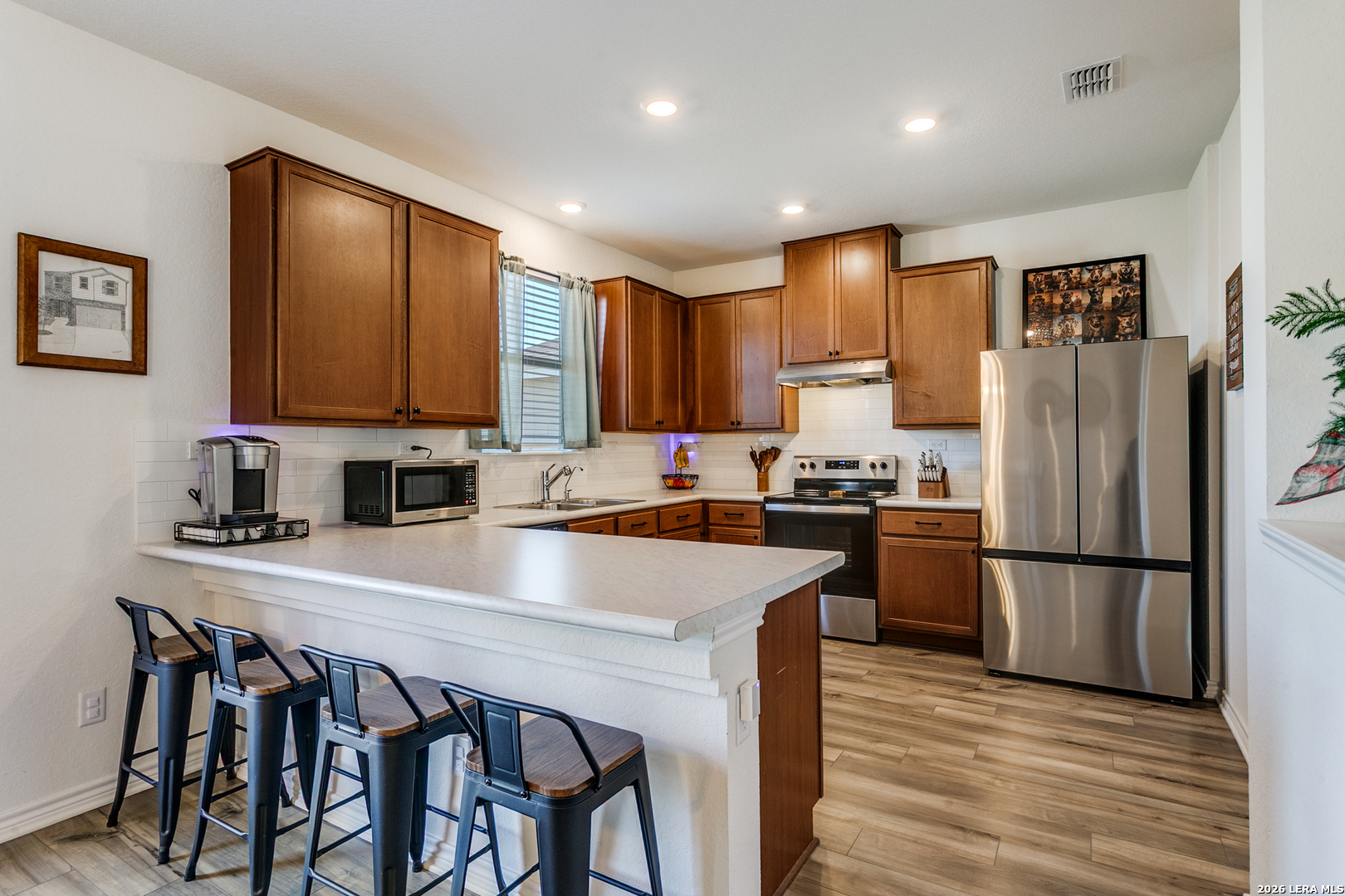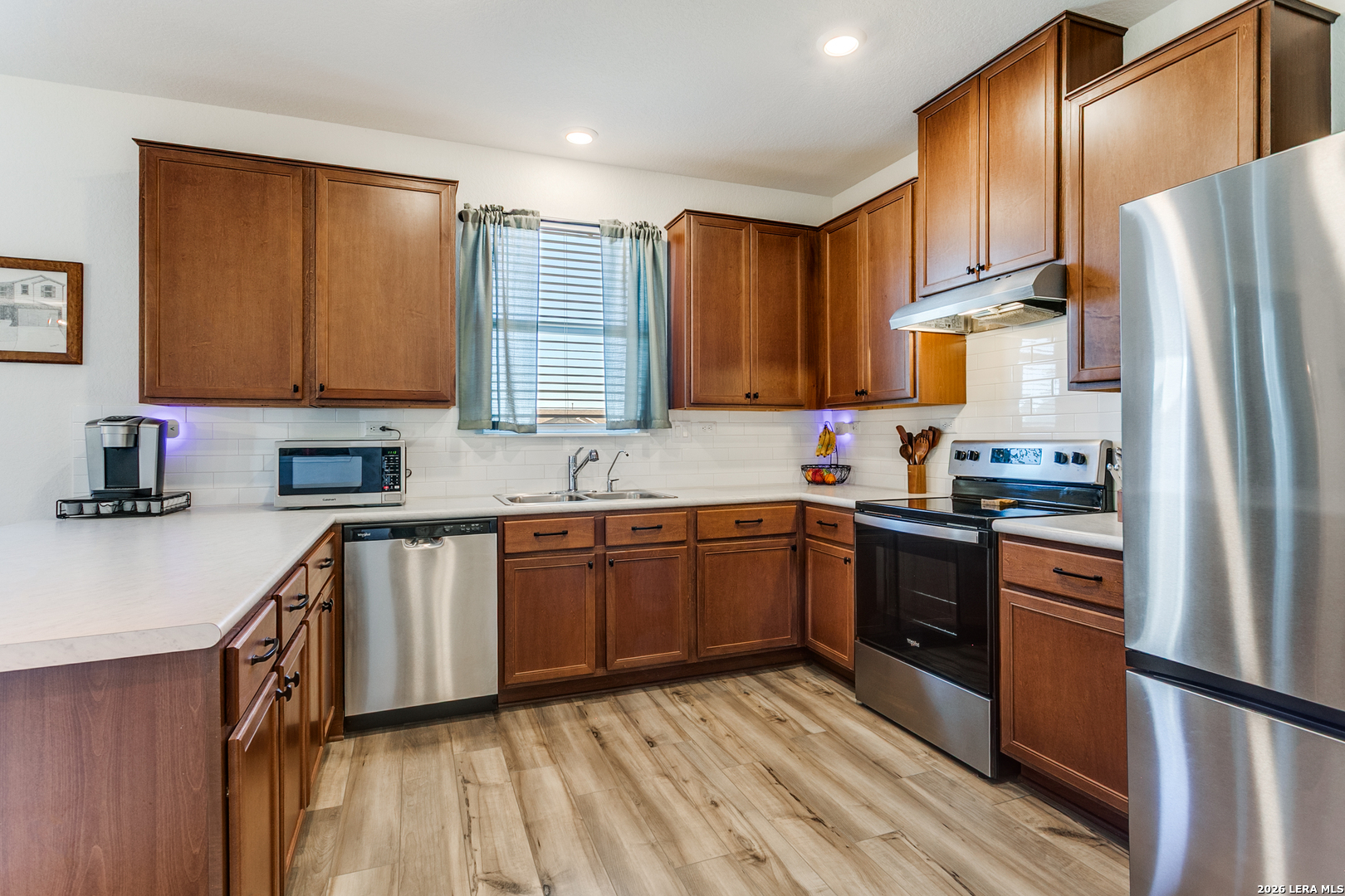 This bright and welcoming home features soaring 9-ft first-floor ceilings and a spacious open-concept layout perfect for everyday living and entertaining. The kitchen is beautifully appointed with Woodmont Cody cabinetry, an extended breakfast bar, Emser Catch backsplash, stainless steel Whirlpool appliances, and a sleek Moen faucet. The primary suite includes a raised dual-vanity and a relaxing garden tub/shower combo. Enjoy added comfort and convenience with Shaw vinyl plank flooring throughout the entry, kitchen, dining area, and powder bath, 2-in. faux wood blinds, and a wireless security system. Outdoors, unwind on the rear patio with the ease of an automatic sprinkler system and full gutters. Solar panels are installed and will need to be assumed by the buyer prior to closing.