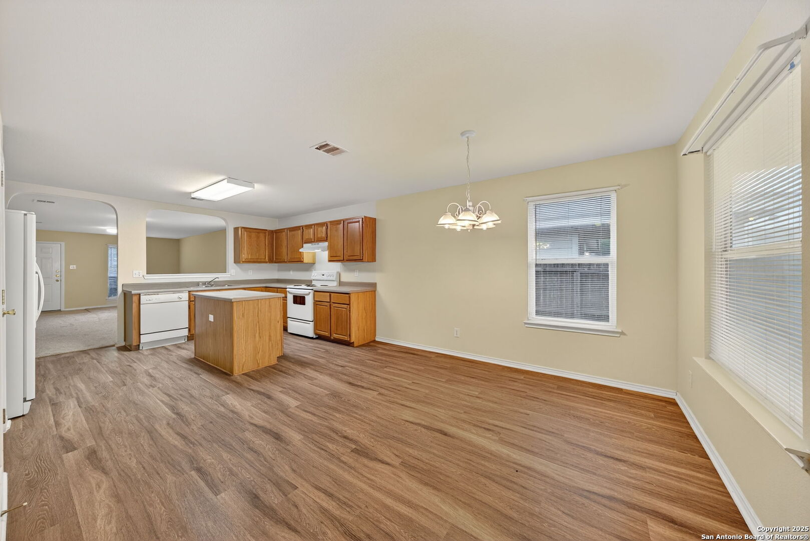 Lovely 3-bedroom, 2-bath home located in the desirable Wildhorse community. This charming one-story features an open floor plan with a spacious living area, perfect for relaxing or entertaining. Brand new carpet and flooring thoroughout. The kitchen offers plenty of cabinet space, a center island, and white appliances. The primary suite includes a walk-in closet and ceiling fan, while the primary bathroom is equipped with a double vanity and a convenient tub/shower combo. Enjoy a large fenced-in backyard with a small covered patio-ideal for outdoor gatherings or quiet evenings. Conveniently located with quick access to Loop 1604 and just a short drive to UTSA, La Cantera, and The Rim. Pets are welcome!