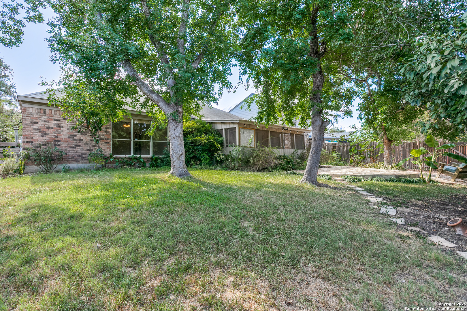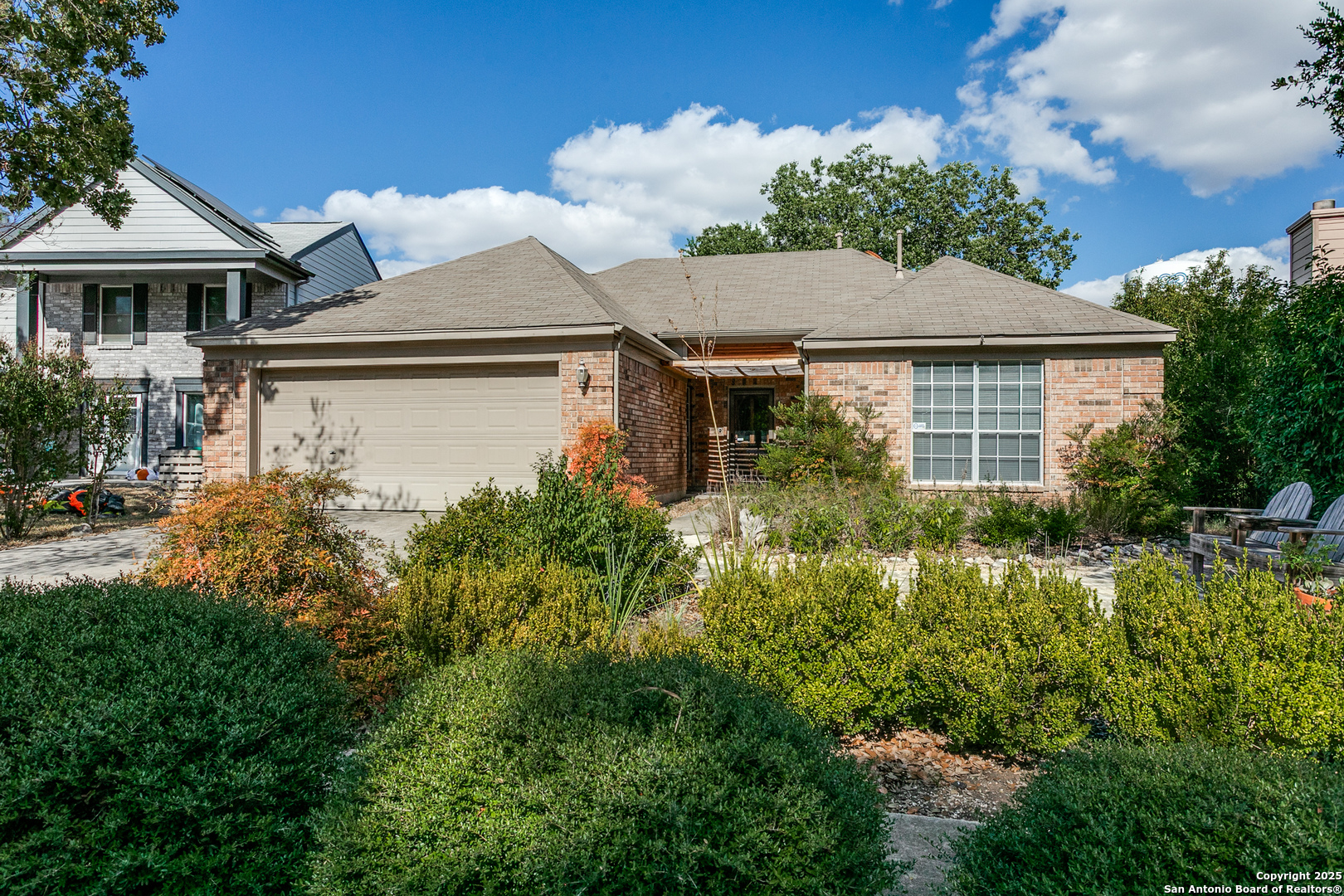 Welcome to 10518 Mustang Ridge, a warm and inviting single-story home tucked into a friendly Converse neighborhood with easy access to shopping, restaurants, local amenities, and nearby bases and transportation routes. Boasting approximately 1,842 square feet, this well-designed residence features 3 bedrooms and 2 full bathrooms, perfectly balanced or those desiring extra space. Step inside to discover a bright, open living area complete with high ceilings, generous windows, and a cozy gas-log fireplace, creating an ideal setting for everyday living and entertaining. The kitchen flows seamlessly into the living space and is conveniently connected to the laundry and a walk-in pantry, making everyday tasks effortless. The primary suite offers a private retreat with a well-appointed bath including separate tub and shower. Two additional bedrooms share a full bath and provide flexibility for guests, home offices, or hobby rooms. Outside, enjoy time under the screened covered patio overlooking the beautifully landscaped backyard, perfect for relaxing or hosting friends. A two car attached garage provides secure parking and extra storage. Enjoy the beauty and practicality of a thoughtfully xeriscaped front yard, designed for both visual appeal and water efficiency. Native plants, decorative gravel, and drought-tolerant greenery create a serene, Southwestern-style landscape that requires minimal upkeep. A rustic wooden bench love seat nestled under the shade offers the perfect spot to relax and enjoy the peaceful setting-ideal for morning coffee or evening sunsets. This inviting outdoor space adds warmth and character before you even step through the front door.