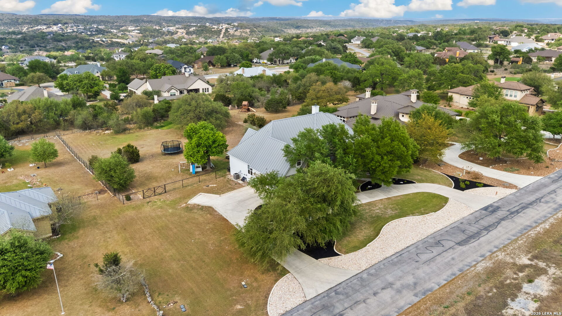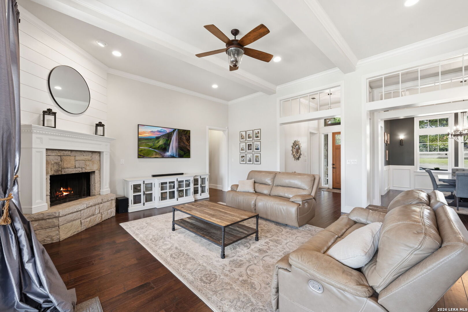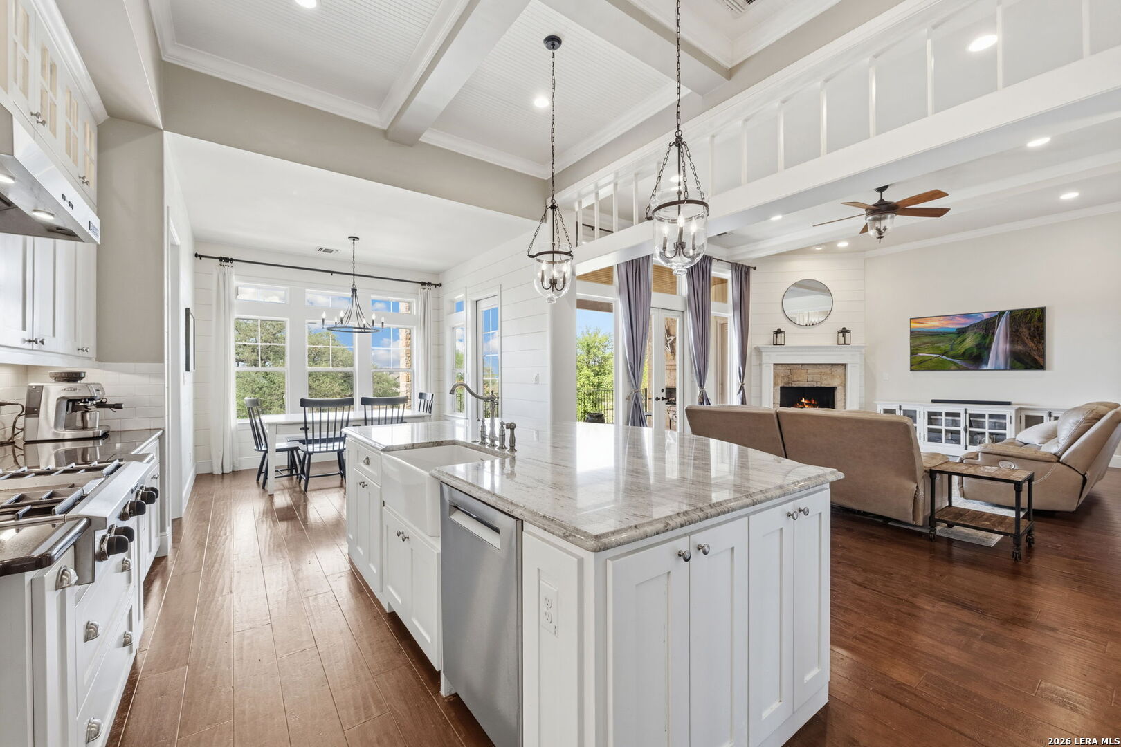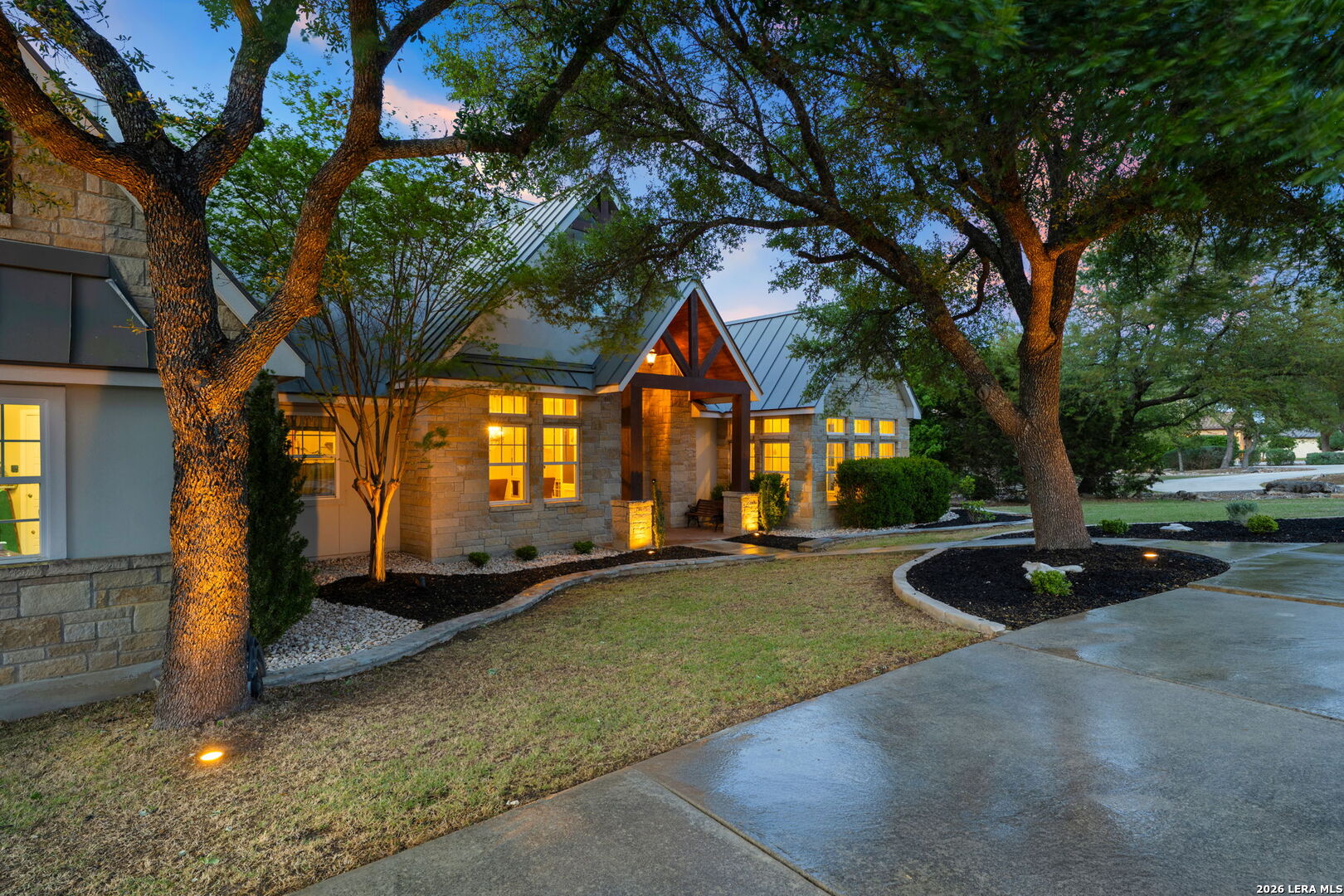 Tucked inside the gated Provence section of Vintage Oaks, this beautifully crafted 4-bedroom, 3.5-bath home offers 3,645 square feet of refined Hill Country living. Set on a private, tree-filled homesite that backs to a serene greenbelt, the property delivers both privacy and a true connection to nature. Inside, the open floor plan is designed for everyday comfort and effortless entertaining, with spacious living areas, abundant natural light, and quality finishes throughout. Rich woodworking details, crown moulding, beamed ceilings, and coffered ceiling treatments add depth and character, while the beadboard ceiling in the kitchen brings a warm, timeless touch. A fireplace anchors the family room, while an outdoor wood-burning fireplace sets the stage for relaxing on those cool Hill Country evenings. The kitchen flows seamlessly into the main living and dining areas, making it ideal for hosting. Upstairs, a large bedroom with a wet bar offers flexibility for a game room, guest retreat, or secondary living space. Outside, mature trees frame the property and enhance the peaceful setting, while the circle driveway provides additional parking and a grand sense of arrival. Located within one of the most sought-after gated sections of Vintage Oaks, this home combines privacy, craftsmanship, and lifestyle in the heart of the Texas Hill Country.