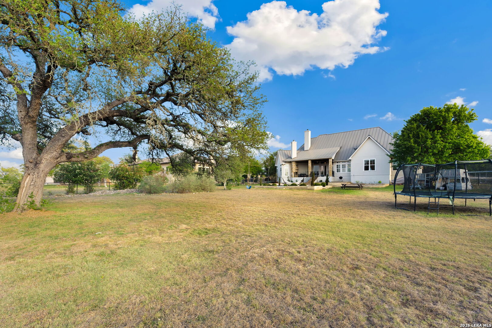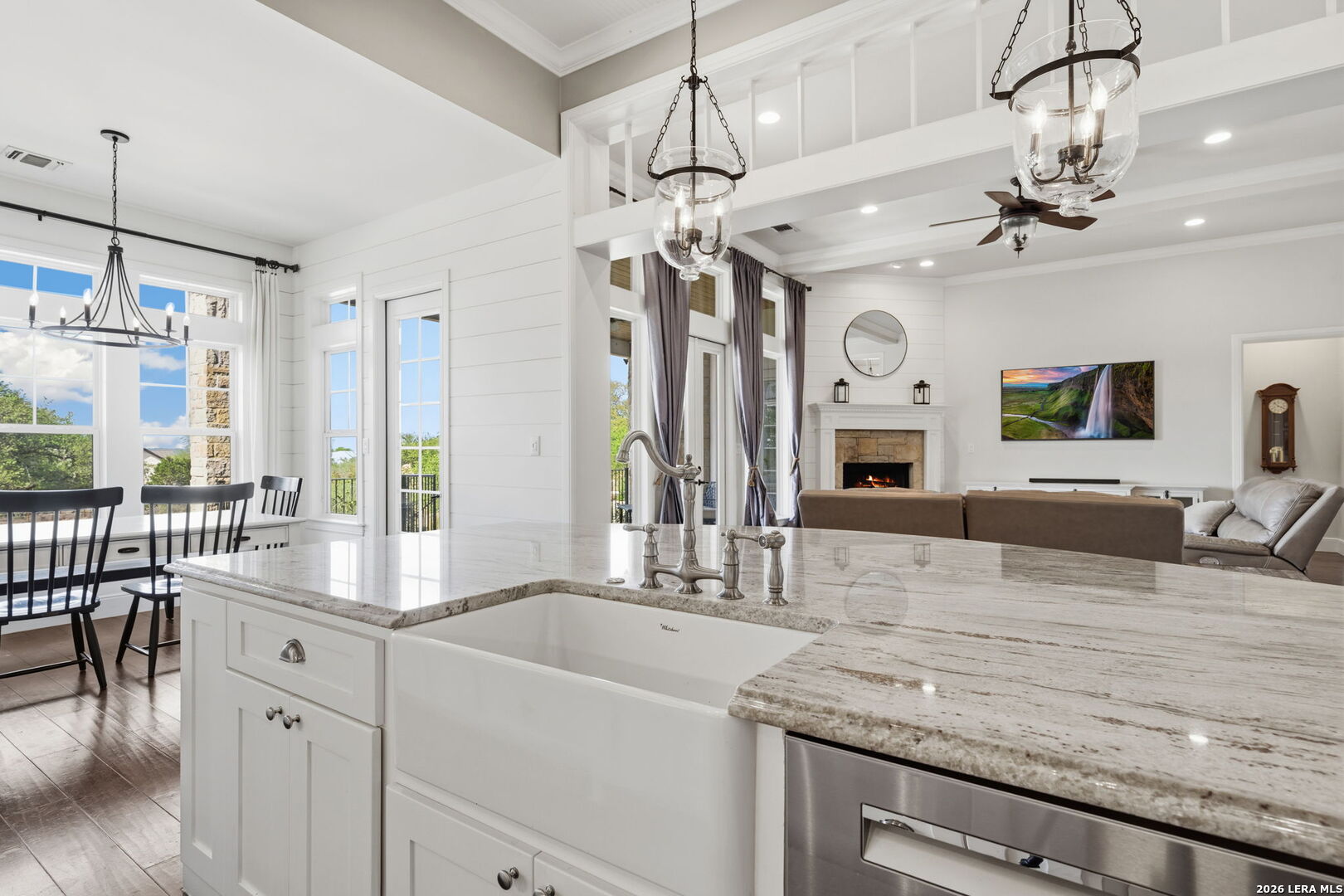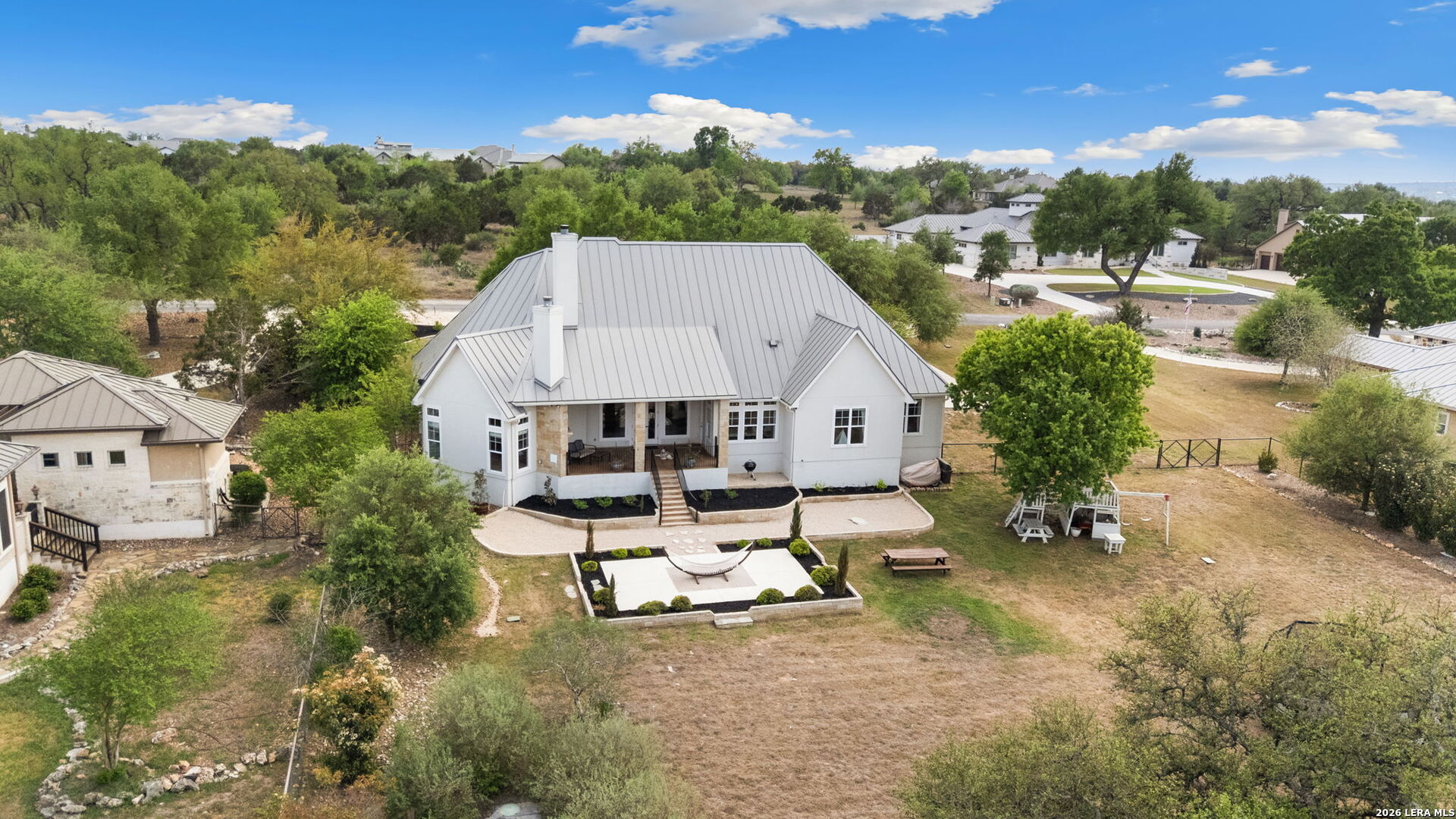 Tucked inside the gated Provence section of Vintage Oaks, this beautifully crafted 4-bedroom, 3.5-bath home offers 3,645 square feet of refined Hill Country living. Set on a private, tree-filled homesite that backs to a serene greenbelt, the property delivers both privacy and a true connection to nature. Inside, the open floor plan is designed for everyday comfort and effortless entertaining, with spacious living areas, abundant natural light, and quality finishes throughout. Rich woodworking details, crown moulding, beamed ceilings, and coffered ceiling treatments add depth and character, while the beadboard ceiling in the kitchen brings a warm, timeless touch. A fireplace anchors the family room, while an outdoor wood-burning fireplace sets the stage for relaxing on those cool Hill Country evenings. The kitchen flows seamlessly into the main living and dining areas, making it ideal for hosting. Upstairs, a large bedroom with a wet bar offers flexibility for a game room, guest retreat, or secondary living space. Outside, mature trees frame the property and enhance the peaceful setting, while the circle driveway provides additional parking and a grand sense of arrival. Located within one of the most sought-after gated sections of Vintage Oaks, this home combines privacy, craftsmanship, and lifestyle in the heart of the Texas Hill Country.
